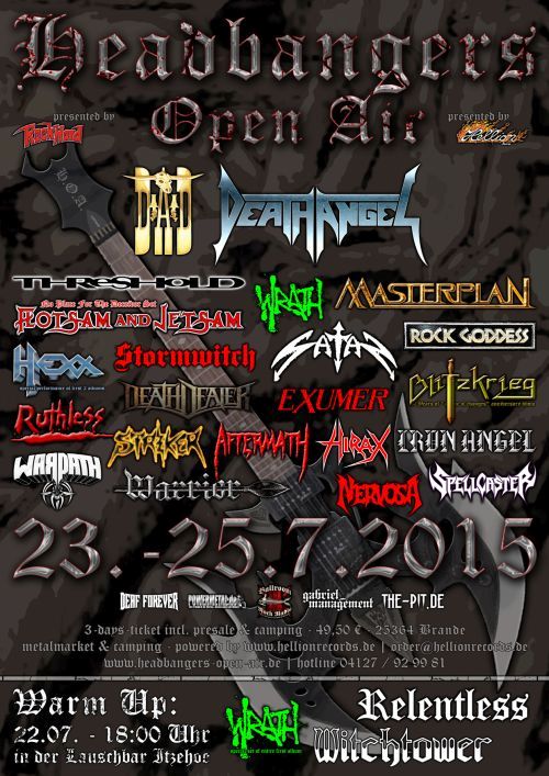 Alle Jahre wieder lockt das gemütliche Headbangers-Open-Air Fans der traditionellen Gangart in den hohen Norden. Von allen Open-Airs ist das H.O.A. das mit Abstand gemütlichste und familiärste. Findet es doch seit jeher im Garten des Veranstalters Thomas statt. Aber natürlich punktet das H.O.A. nicht nur mit Atmosphäre und gelungener Grillkunst, sondern hat vor allem musikalisch einiges zu bieten: So wird auch in diesem Jahr ein gelungener Mix aus alten Hasen, großen Kultbands und jungen Wilden die Menge wieder zum Kochen bringen. Die dänischen Hard Rocker D.A.D. beispielsweise sind ein Garant für unvergessliche Liveshows, aber auch die immer jungen DEATH ANGEL haben noch jede Bühne in Brand gesetzt und werden dies auch in Brande-Hörnerkirchen tun. Die alten Hasen sollten sich aber nicht ausruhen, denn mit den Allgirl-Thrashern NERVOSA, den Speedies von SPELLCASTER oder den verrückten Kanadiern von STRIKER stehen genug hungrige Newcomer in den Startlöchern. Dazu gibt es das Brian Ross Doppelpack mit BLITZKRIEG und den wiedererstarkten SATAN, sowie weitere namhafte Größen wie FLOTSAM & JETSAM, MASTERPLAN oder STORMWITCH. Das Salz in der Suppe machen aber die Bands aus, welche man noch nie oder ganz selten auf Deutschlands Bühnen bewundern durfte: AFTERMATH, HEXX, WRATH, WARRIOR (UK) oder die feinen Reunions von IRON ANGEL, WARPATH und ROCK GODDESS. Alles in allem ist auch für 2015 wieder ein tolles und abwechslungsreiches Paket geschnürt worden und so gibt es eigentlich keinen Grund warum man nicht vom 23.07.2015 – 25.07.2015 auf dem metallischsten Gartenfest der Welt zugegen sein sollte.