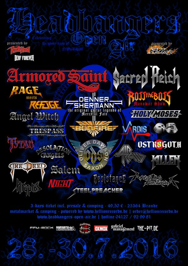Neben einem NWoBHM Schwerpunkt (mit u.a. ANGEL WITCH, TRESPASS, OLIVER / DAWSON SAXON und VARDIS) wartet das H:O:A auch mit den US Metal Legenden ARMORED SAINT, Q5 & ROSS THE BOSS auf. Letzterer bringt sein umjubeltes MANOWAR-Set nach Brande. Und wer den jungen Sangesgott Mike Cotoia auf dem Keep It True erlebt hat, der weiß, dass einen Gänsehaut pur erwarten wird. Aber auch die Thrasher kommen mit HOLY MOSES, ANGELUS APATRIDA oder SACRED REICH auf ihre Kosten. Die junge Garde wird von NIGHT und AIR RAID repräsentiert und tonnenschweren Kult gibt es in Form des MERCYFUL FATE Gitarrenduos DENNER / SHERMANN sowie der belgischen Heavy Metal Macht OSTROGOTH. Abgerundet wird das Ganze von einer RAGE meets REFUGE Show mit allen Klassikern, die Urgestein Peavy in seiner langen Karriere verbrochen hat. Zuletzt sorgen die Inder KRYPTOS noch für einen exotischen Farbtupfer. Und da das noch lange nicht alles ist, wird es die drei Tage mit Sicherheit nicht langweilig werden.