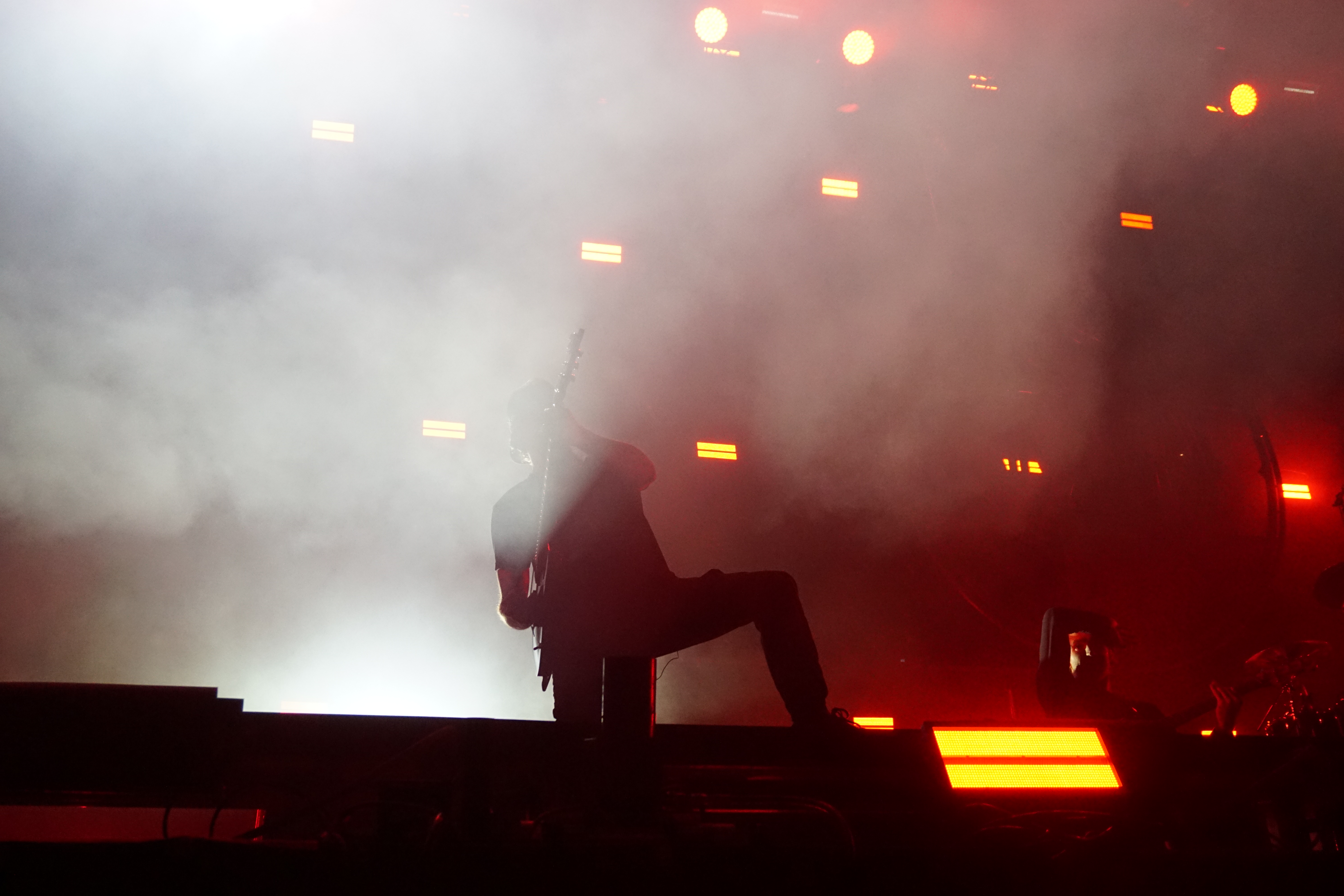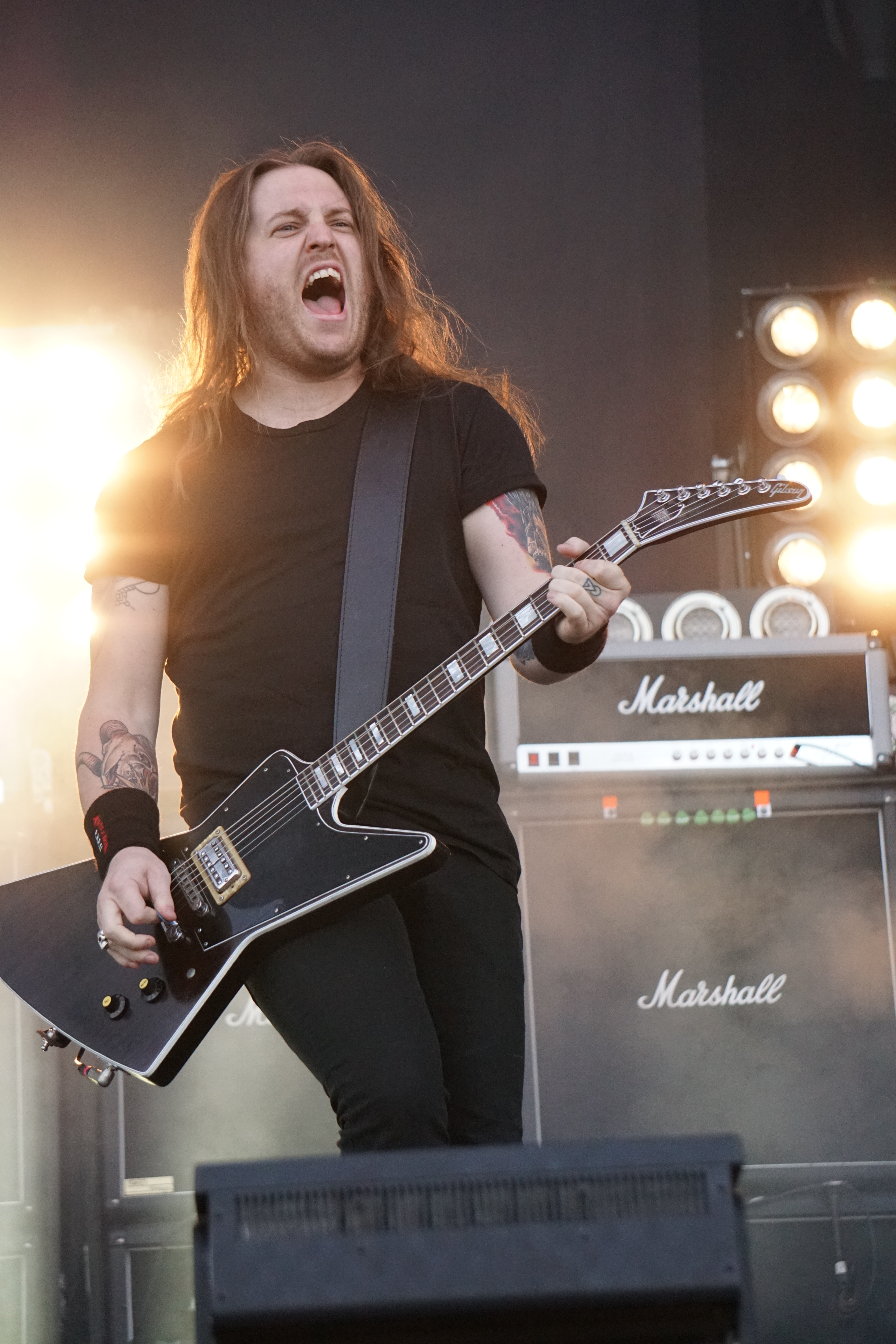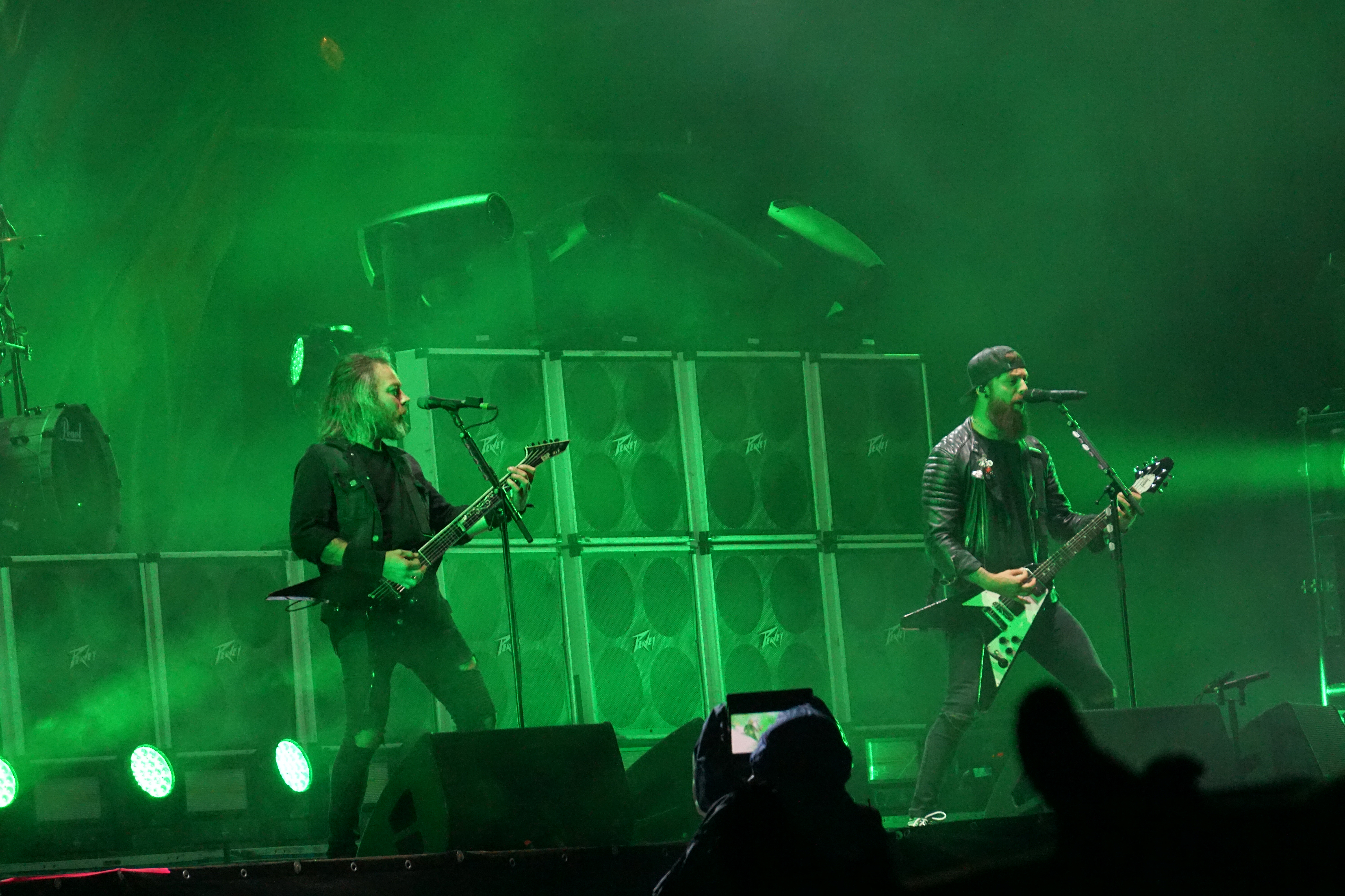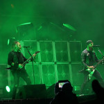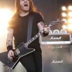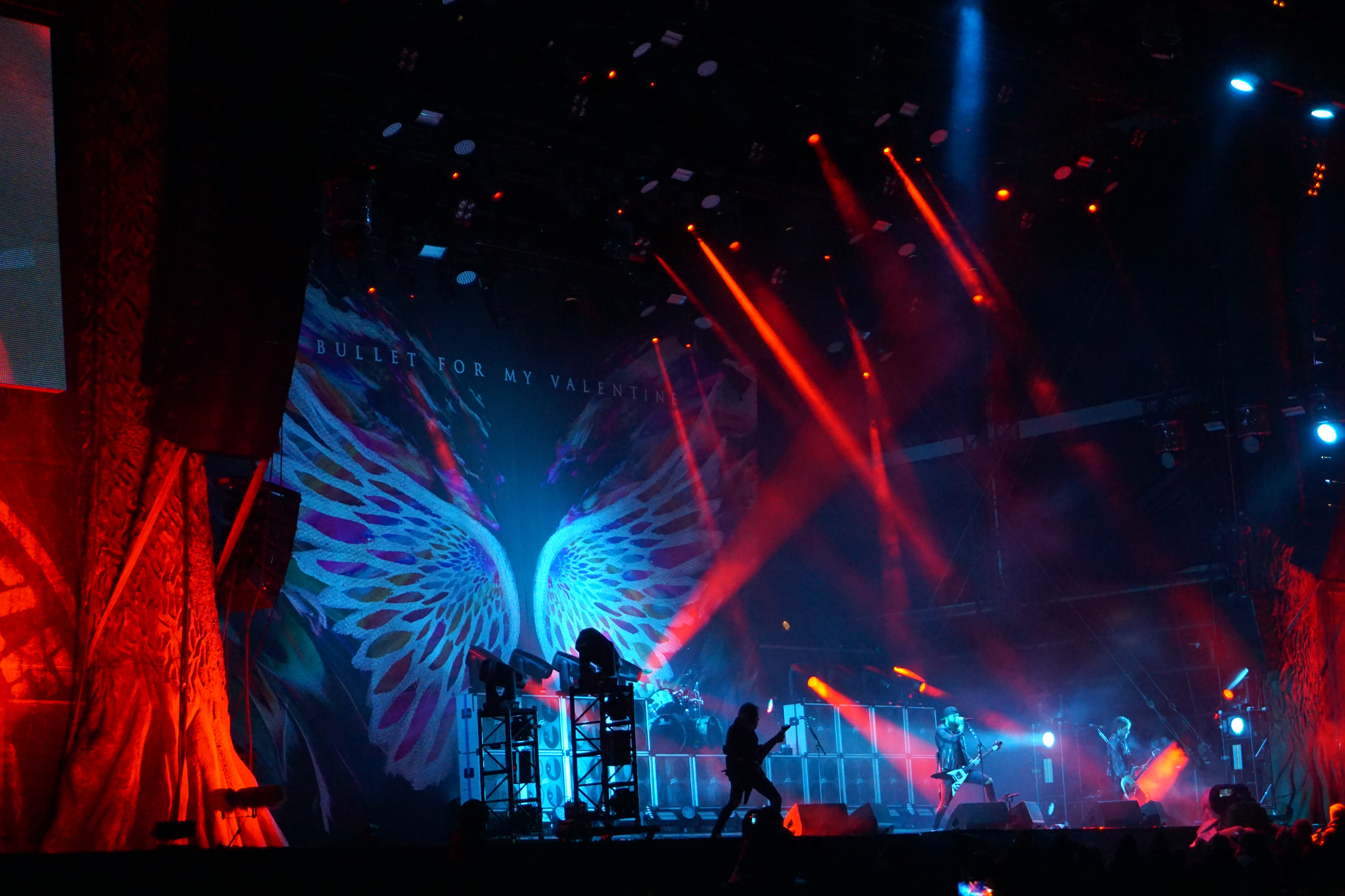 Mit BULLET FOR MY VALENTINE wartete nun unser letzter Gig des Festivals auf uns. Alleine dafür hatten wir uns entschlossen, nicht schon mittags nach Hause zu fahren. Die Waliser hatten zwar zuletzt mit “Gravity“ eine eher schwache Scheibe auf dem Markt, bei der Hitdichte, die die Band aber im Backkatalog hat, störte das wohl Niemanden. Gut man hätte jetzt nicht direkt mit zwei Tracks aus diesem Werk anfangen müssen, aber so hatte der ordentliche Auftritt der Jungs wenigstens Steigerungspotential. Als dann „Your Betrayal“ angestimmt wurde sprang dann zügig der Funke auf das Publikum, das sehr Mädelslastig war, über. Die Bewegung, die den Protagonisten auf der Bühne ein wenig fehlte, machte die nun überaus aktive Menge laut mitsingend wieder wett. Ich hatte die in ihren Anfangstagen mal gesehen, als sie noch keinen Bartwuchs hatten, da gingen die ab, wie Schmitz Katze! Jetzt trägt Matthew Tuck Bart und das Ganze wirkt ziemlich statisch...ist aber jammern auf hohem Niveau. Wie bereits erwähnt , war der Sound bisher perfekt, jedoch kam es uns heute ein wenig leise vor, störte uns aber nicht weiter, da wir weit genug vorne waren, ging aber gut ohne Ohrstöpsel. Die Lightshow wirkte überaus stimmig und war einfach schön anzuschauen. Im letzten Drittel der Show wurde dann nochmal alles raus gehauen. Die Venomtracks: “You Want a Battle? (Here's a War)“ und “No Way Out“ gefolgt vom Oberkracher “Tears Don't Fall“ brachten dann sogar Lahme zum Gehen. Mit dem IMAGINE DRAGONS Cover “Radioactive“ (vom Band) entließ man alle Anwesenden zufrieden in die Nacht. Es hat sich doch noch für uns gelohnt zu bleiben.
