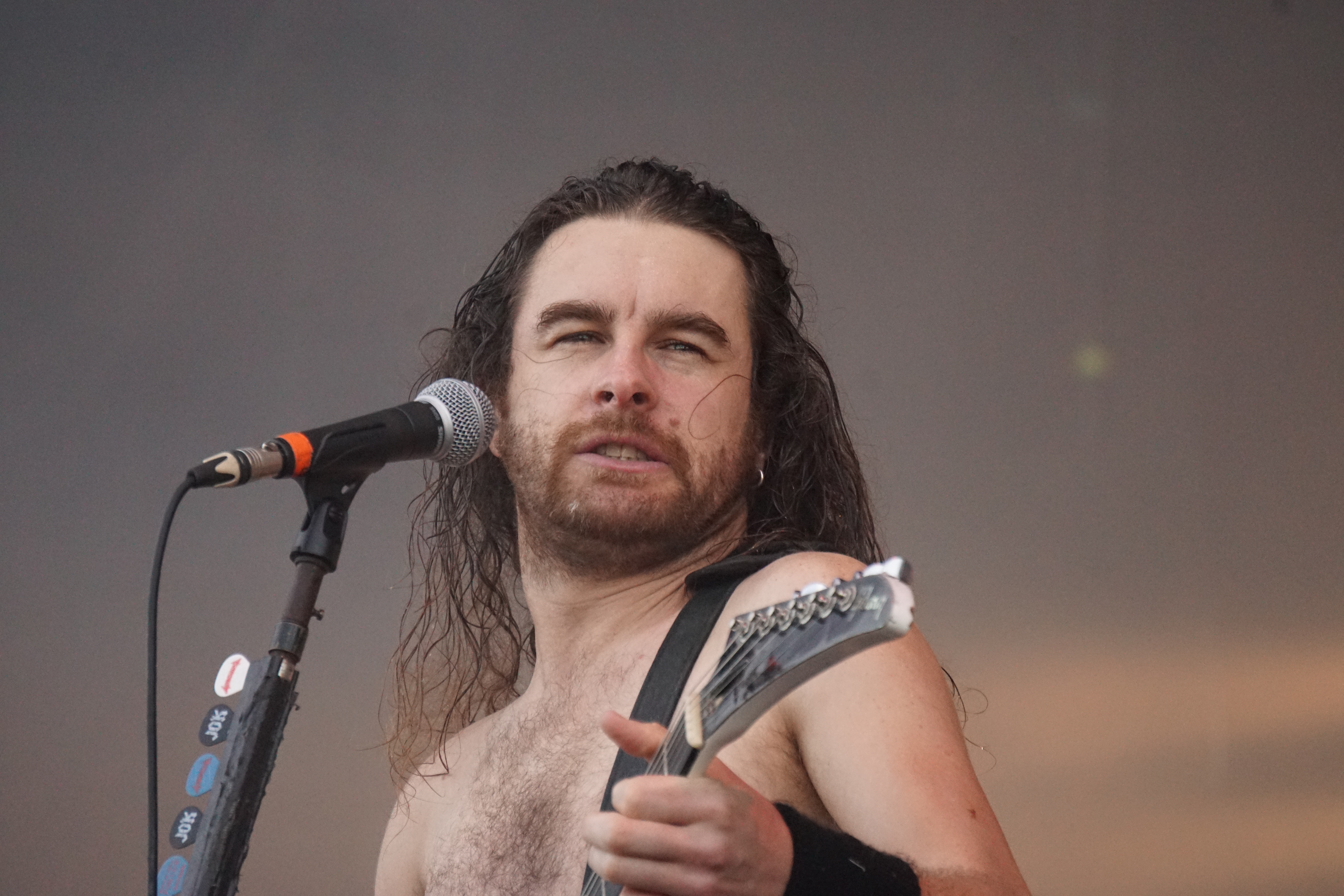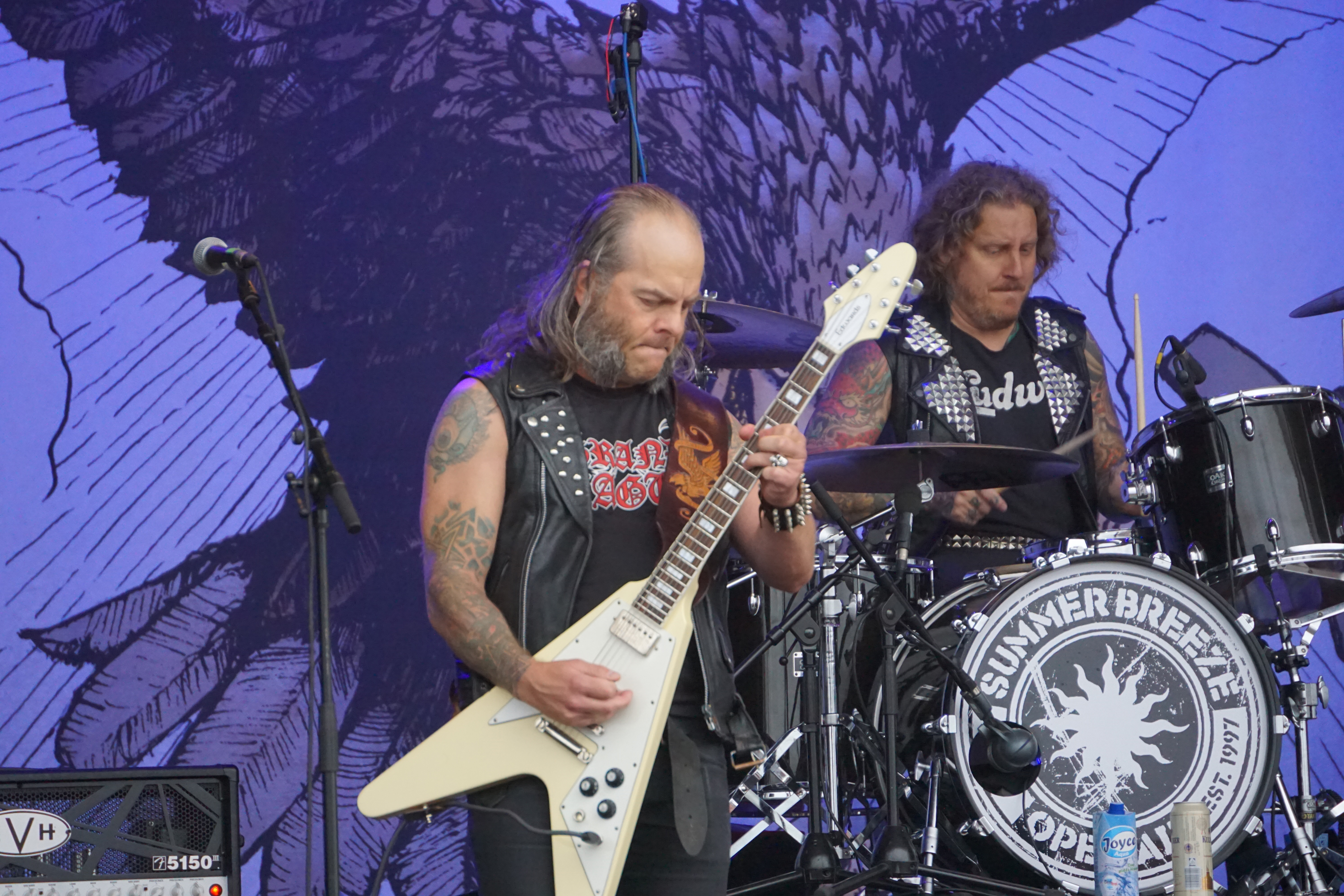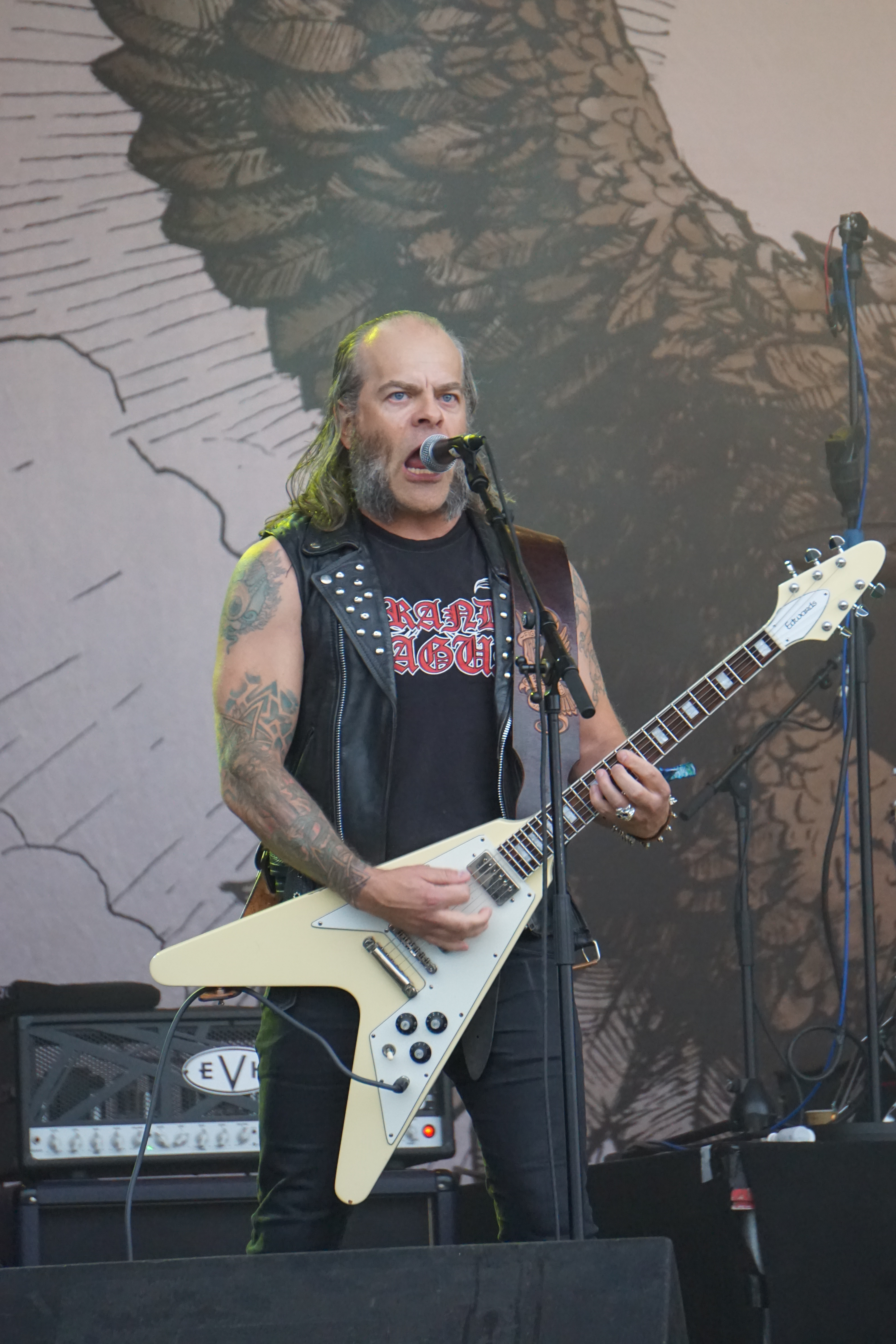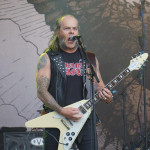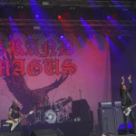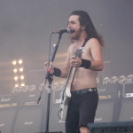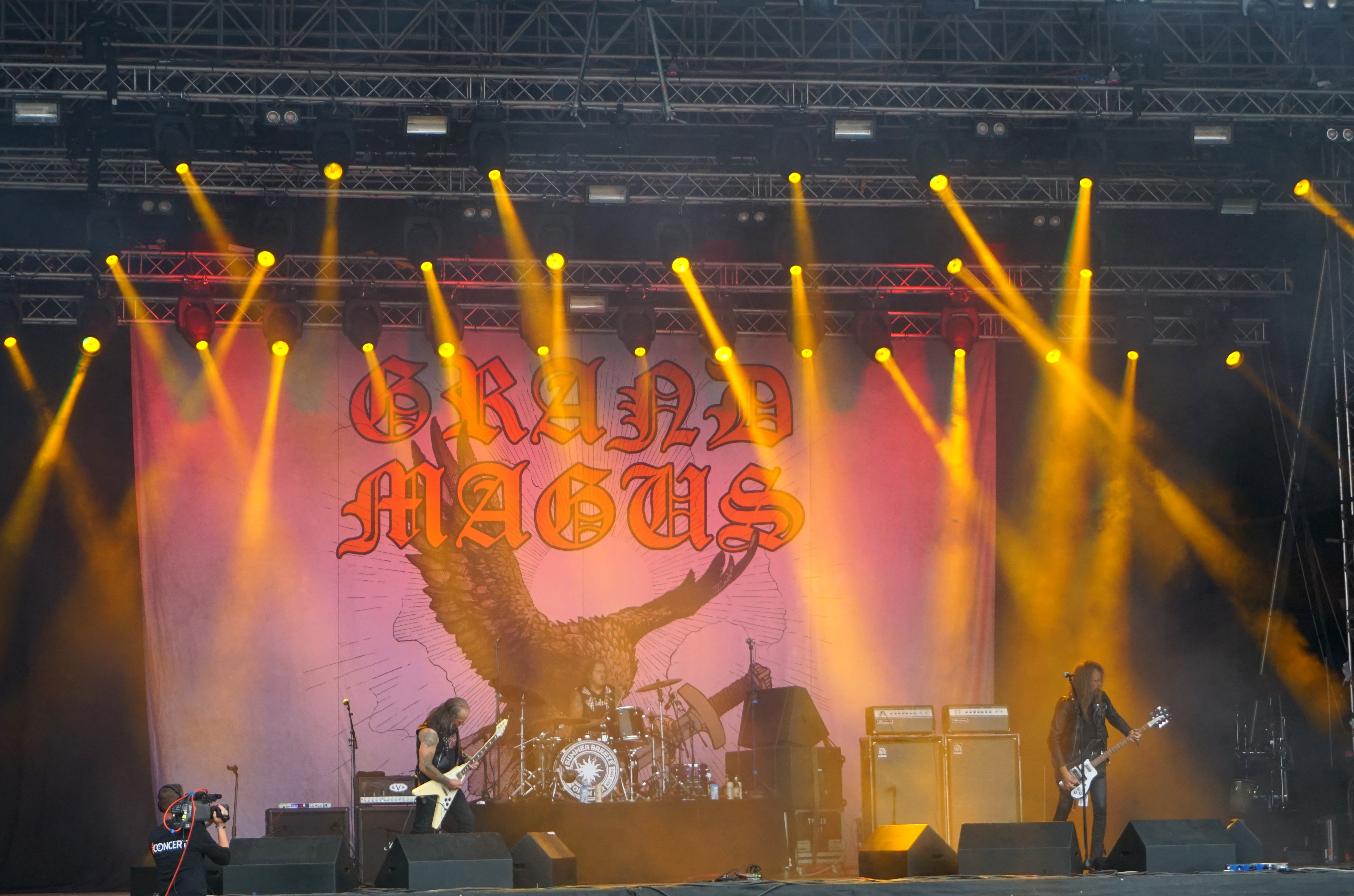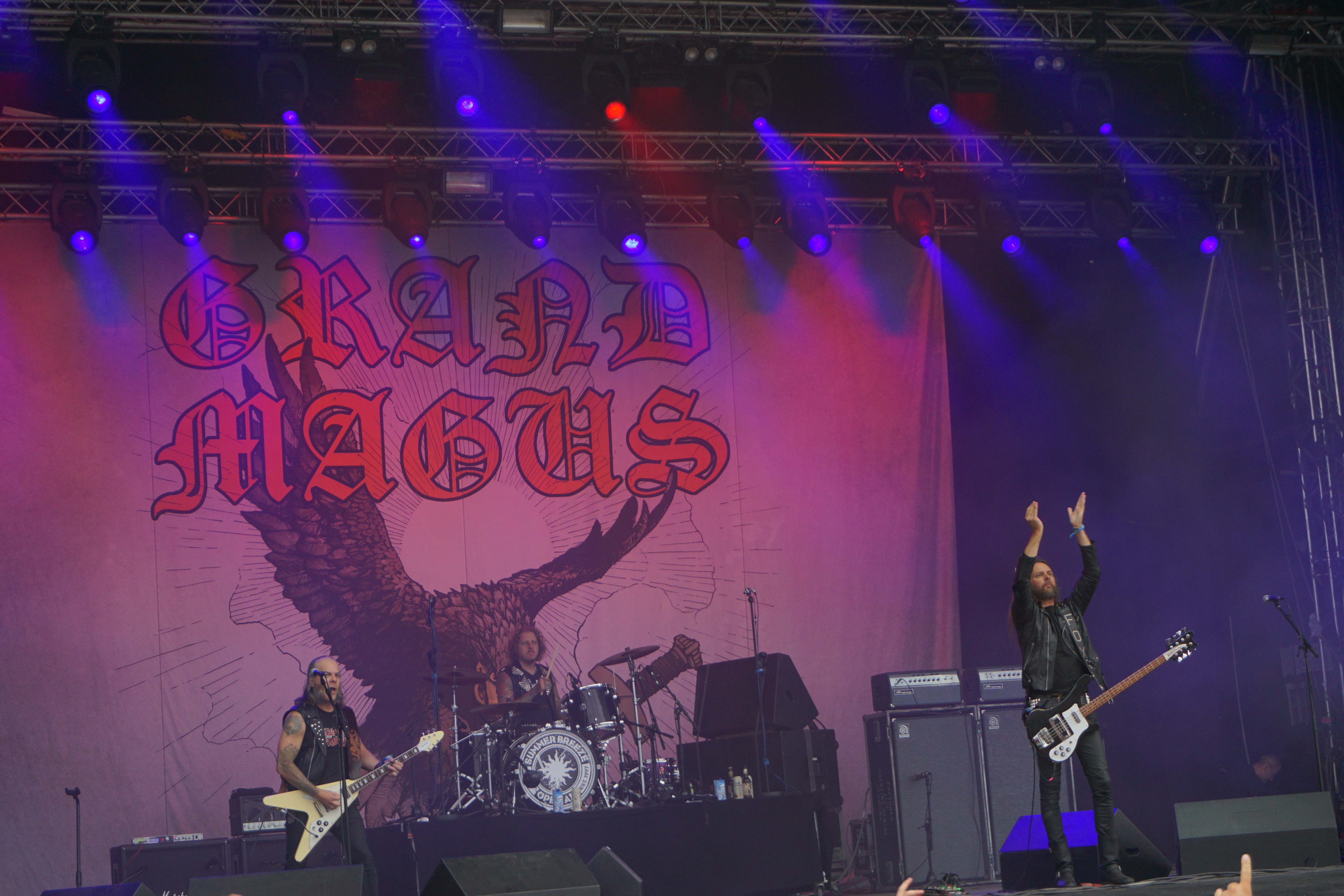 Als die drei Gestalten von GRAND MAGUS so in aller Seelenruhe auf der Bühne auftauchten, über die ein paar Rauchschwaden strichen, hatte sich der Himmel bereits wieder in tristes Grau gehüllt. Zur Einleitung lief “Gold And Glory“, Janne und Mats hoben kurz die Hände zum Gruß, fummelten noch ein bisschen an ihren Instrumenten herum, stimmten ein wenig nach, ließen langsam den Blick über das Areal schweifen. Hand ans Ohr, der Mob grölte und das erste tonnenschwere Riff zu “I, The Jury“ wurde angeschlagen. Das war die coolste Band des Festivals, definitiv! Hätten wir unser warmes Bier aus dem Auto mitgebracht und an den Bühnenrand gestellt, hätten wir es wohl nach dem Gig kalt wieder mitnehmen können. Auf irgendeine Weise passte hier alles zusammen. Selbst als es leicht anfing zu nieseln, konnte man dem, bei dieser melancholischen Grundstimmung, etwas abgewinnen. Die Ansagen waren meist kurz und monoton, dann kam das nächste Stück. Einmal jedoch erblickte Janne „JB“ Christoffersson (Gesang und Gitarre) den Werbeballon von WERA zwischen den Wolken und meinte nur trocken “Guckt mal ein fliegendes Kondom“, was zu Gelächter führte, da es sich um einen Schraubenzieher handelte. Als er das auch erkannte, entschuldigte er sich für seine versauten Gedanken, ohne eine Miene zu verziehen. Vom aktuellen Longplayer “Wolf God“ wurden zwei Titel zum besten gegeben, „“Dawn Of Fire“ und “Untamed“, der Rest war aus allem etwas. Mit “Kingslayer“ hatten sie die älteste Nummer im Gepäck. Hier bekam man Riff-Metal pur, ohne Schnick Schnack und ich weiß nicht warum, aber uns erinnerten diese drei Typen und vor allem die Art, wie sie agierten, unweigerlich an Lemmy und seine Spießgesellen, nur waren die hier nicht annähernd so laut.