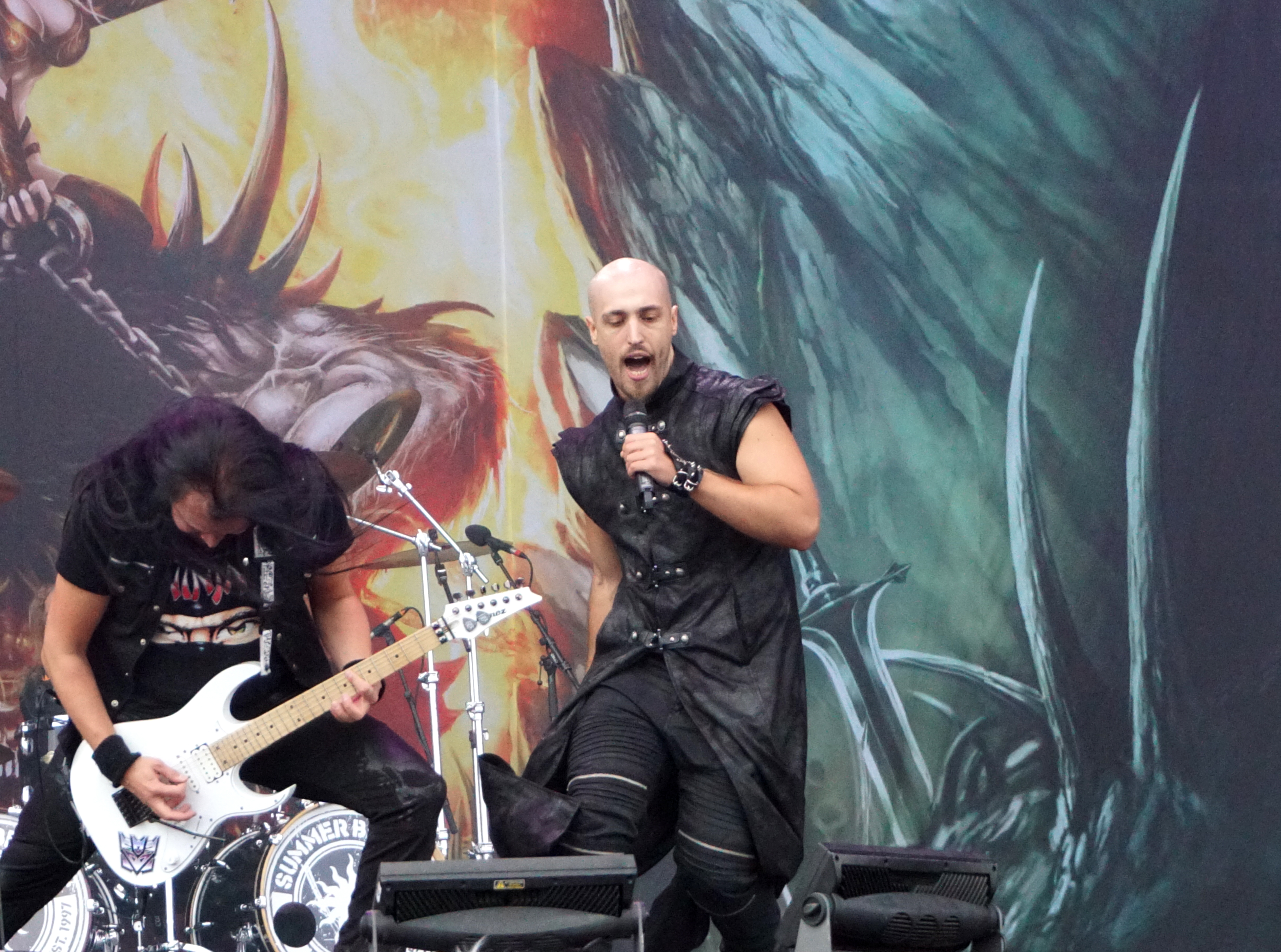 Der normale Ablauf nach dem Aufstehen um 11:00 Uhr war zunächst die Nahrungsaufnahme, Katzenwäsche, Zähneputzen und dann gemütlich mit Bier und/oder Äppler im Kreise der Nachbarn auf den kommenden Tag einstimmen. Heute musste aber letzteres leider nach hinten verschoben werden. Die AOR-Power Rocker von BEAST IN BLACK starteten bereits um fünf vor eins. Nach dem ganzen Knüppel aus dem Sack der letzten Tage waren die Jungs aus Finnland eine willkommene Abwechslung. Mit ihrer Abba goes Metal Mucke begaben sie sich zwar auf eine Gratwanderung, brachten dennoch irgendwie so was Frisches mit. Das aktuelle Werk “From Hell With Love“ ist ein Ohrwurmmonster, das ich lange auf dem Dreher liegen hatte, somit konnte ich aus Herzenslust fast alles mitsingen, wie alle Anderen an diesem sonnigen Mittag auch. Es ist immer was besonderes, wenn eine junge Band nur mit 2 Scheiben im Gepäck den kompletten Gig quasi mit dem Besten aus Beiden bestreitet. Den Start legten die Skandinavier natürlich mit “Cry Out For A Hero“ hin und schickten das begeisterte Publikum im Anschluss mit dem epischen “Unlimited Sin“ direkt ins Gänsehautzimmer. Immer wieder legte das Keyboard einen Teppich, der dann jäh von den Gitarren in klassischem Metal-Riffing zerrissen wurde, um sich alsdann zu einer Symbiose zu vereinen. Über all dem schwebte der perfekte, äußerst vielseitige Gesang von Yannis Papadopoulos...und alle grölten zumindest den Refrain mit! “Eternal Fire“ und das gefühlvolle “Blind And Frozen“ (mit Discointro) wirkten aufpoliert, mitreißend und fügten sich nahtlos zwischen das neue Material. Als im Abspann nach einer knappen Stunde der Robert Tepper Hit "No Easy Way Out" in der Version von BEAST IN BLACK lief, sah ich ringsum glückliche Gesichter und fühlte mich selbst mental wie frisch geduscht.