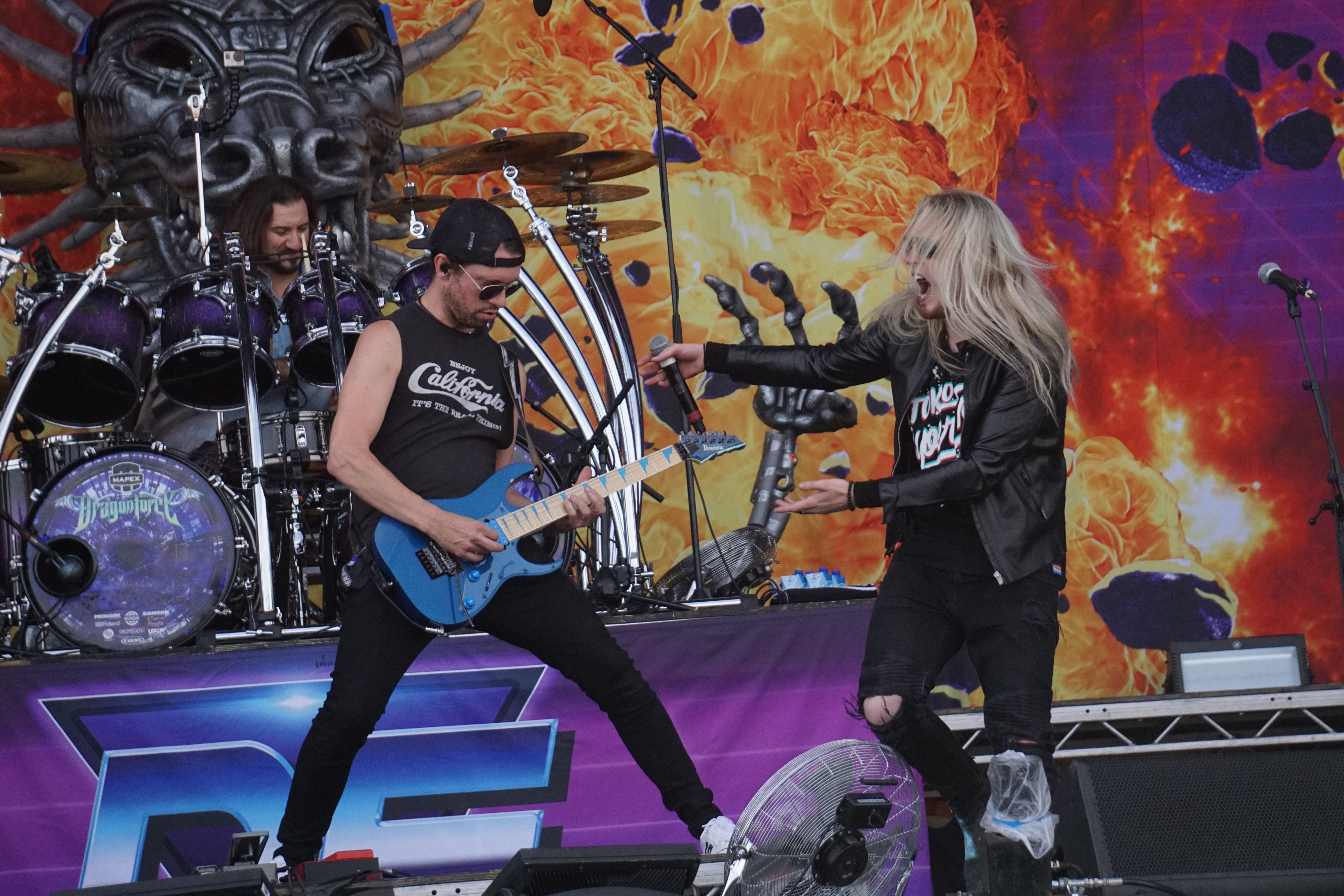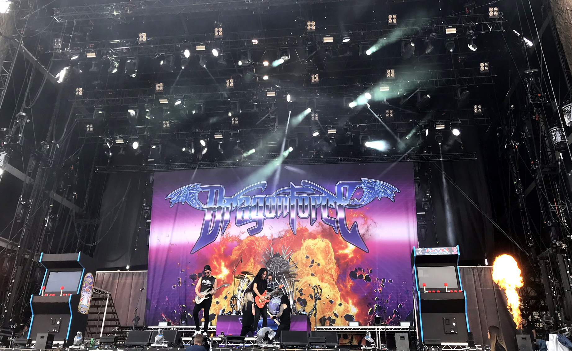 Als ich mich gerade so weg gebeamt in meiner 80er-Jahre-Welt in Nostalgie suhlte, erschienen vor mir zwei überdimensionierte Arcade Spielautomaten, auf denen Pac Man, Donky Kong oder ähnliches lief. War da jetzt der Äppler schuld, den ich schon reichlich genossen hatte? Nein, die Dinger standen wirklich da, auf der DRAGONFORCE Bühne, und in der Mitte grinste mir ein stählerner Drache aus einem Feuerball entgegen. Es ertönte kurz danach das Intro “Reaching Into Infinity“ und auf jedem der beiden Automaten tauchten die Gitarristen Herman Li und Sam Totman auf, die mit "Ashes Of Dawn“ loslegten wie die Feuerwehr. Was jetzt hier gespielt wurde, war wohl so etwas wie Space Invaders, bei dem Marc Hudson (Sänger) das Verteidigungsbollwerk mimte und die beiden Gitarristen ihre Salven abfeuerten. Gnadenlos wurde alles niedergemacht, was sich am Horizont zeigte...Level für Level. Zweistimmig gefuddelte Gitarrensolos mit 200 BpM rissen große Löcher in die feindlichen Ufo-Reihen. Der tapfere Marc pendelte zwischen den Konsolen und erhielt Unterstützung durch die, über die Crowd zahlreich surfenden Komparsen. Nun galt es dem Gegner den Gar aus zu machen, deshalb wurde zum finalen Schlag “Through The Fire And Flames“ ausgepackt. Jeder, der das Ding auf Guitar Hero mal probiert hat, weiß was dann folgte: GAME OVER!