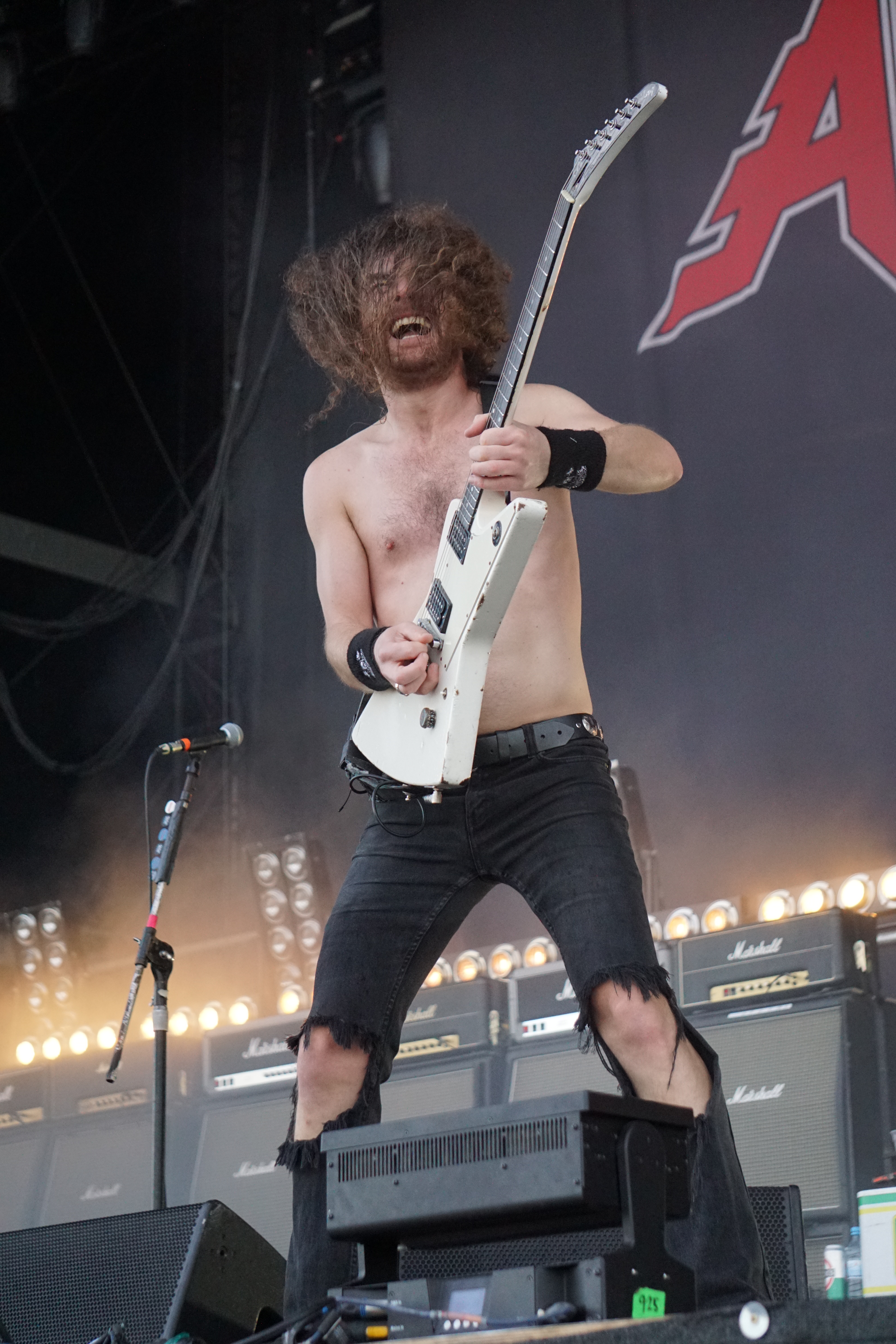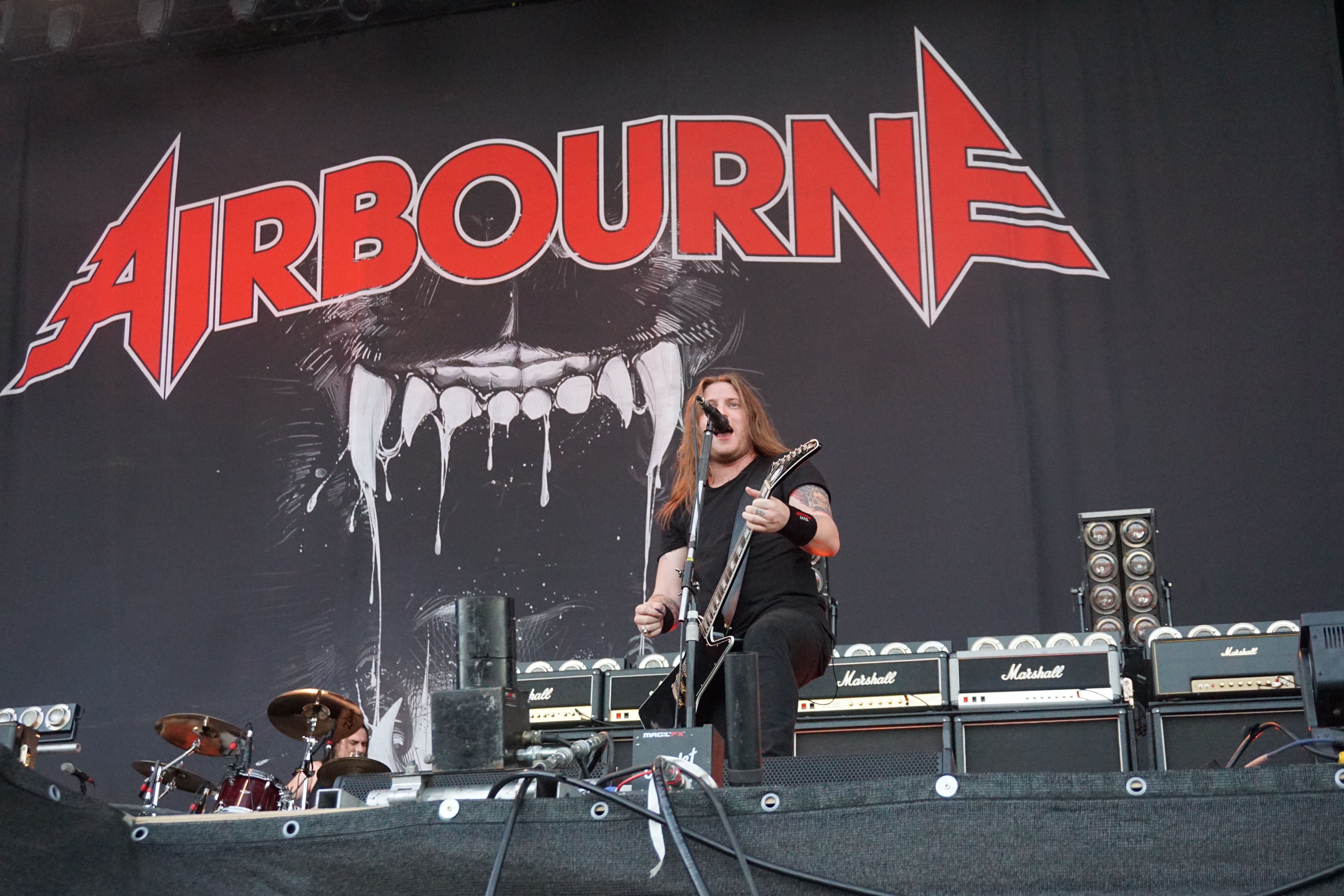 Ich komme aus der Generation, in der man sich zwischen KISS und AC/DC entscheiden musste. Meine Entscheidung ging zu Gunsten der Australier, da ist es nur logisch, dass mir AIRBOURNE besonders liegt. Aus unerklärlichen Gründen hatte ich es aber noch nicht geschafft, einem Auftritt der Combo beizuwohnen, deswegen freute ich mich auch schon tierisch darauf, diese Bildungslücke endlich zu schließen. Vom ersten Ton an war klar, was jetzt hier Sache war. Die Luft vibrierte vor Energie, Adrenalin, Testosteron und roch schon beim Zusehen nach Schweiß. In den folgenden 75 Minuten wurde eine richtig schön schmutzige Rock´N´Roll Party gefeiert und wer jetzt noch still stehen konnte, war entweder stocktaub oder gelähmt. Als ich jedoch neben den unzähligen Crowdsurfern, die sich auf die Bühne zubewegten, wie Haie auf eine blutende Beute, einen Rollstuhl über das ausgelassene Volk gleiten sah, musste ich das letzte Argument streichen. “Ready To Rock“ startete die wilde Sause (hatte ich mal als Klingelton :-)) und nach “Too Much, Too Young, Too Fast“ gab´s auch mit “Boneshaker“ direkt was Neues. Aber was ist schon so ne richtige Party, ohne Getränke. Diese Musik geniest man am besten mit einem Bier oder einem Whiskey. Das dachte sich Joel O’Keeffe (Sänger und Gitarrist) auch und gab dann gleich den Barkeeper. Er nutzte die Gelegenheit einen der ganz Großen des Rock zu ehren. Zu diesem Zweck wurde ein Flightcase mit dem Konterfei des Snaggletooth und der Aufschrift “Lemmy's Bar“ herein geschoben. An diesem Tresen mixte Joel dann ein paar Jacky-Cola (Lemmy´s Lieblingsdrink) und warf diese Plastikbecher so geschickt in die Zuschauer, dass nahezu nichts der köstlichen Flüssigkeit den Becher verließ. Leider konnten wir nicht sehen, was beim Adressaten passierte. Das Becherwerfen machte ihm so viel Spass, dass er immer wieder, diesmal mit Bier gefüllte Gefäße verteilte. Seltsamer Weise zierte das “Black Dog Barking“- Cover die Bühne als Backdrop (Hintergrundbild), gefeiert wurde aber großteils mit den Tracks der ersten Scheibe. Irgendwie werde ich das Gefühl nicht los, dass man solch energetische Veranstaltungen nur mit Bands aus Down Under erlebt, warum auch immer.