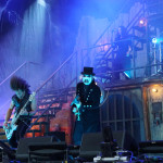 Wer jetzt auf die Bühne muss, hat eh einen schweren Stand. Vielleicht war das mit KING DIAMOND als Kontrastprogramm dann eine gute Idee. Der Oldschool-Metal kombiniert mit der Stimmlage (Falsett-Stimme) des Herrn Kim Bendix Petersen (bürgerl. Name) ist was Spezielles und nicht jedermanns Sache, deshalb war das Battlefield auch zunächst nur mäßig gefüllt. Ich persönlich schätze die Musik von MERCYFULL FATE und KING DIAMOND, konnte mir das Ganze aber bisher nicht länger als maximal eine LP-Länge antun. Den unvergleichlichen KING DIAMOND aber nun zum ersten Mal live zu erleben, verursachte selbst mir altem Hasen ein flaues Gefühl in der Magengegend. Für das zu erwartende Horrortheater war es anfangs eigentlich noch zu hell. Das Bühnenbild entführte uns in ein düsteres Sanatorium, mit einem rostigen Treppenaufgang rechts und links zu den oberen Stockwerken. In der Mitte, quasi im ersten Stock, war das Schlagzeug aufgebaut. Darunter befand sich zwischen zwei vergitterten Luftschächten eine Art Zellentür, die von zwei Gestalten in Mönchskutten geöffnet wurde. Auf einem Behandlungsstuhl liegend, wurde der King von den beiden zu “St. Lucifer's Hospital“ auf die Bühne geschoben. Die restlichen Musiker erschienen nacheinander im ersten Stockwerk und stimmten “The Candle“ an. Zum nächsten Stück “Voodoo“ erschien eine schwarz gekleidete Dame mit seltsamen Zeichen im Gesicht. Ihr galt es nun den Teufel auszutreiben. Und wieder tauchten die beiden Mönche auf, diesmal mit einem Kindersarg. Die darin befindliche Puppe wurde zu “Funeral“ von Mr. Diamond persönlich erdolcht und mit “Arrival“ wurden wir einem regelrechten Gitarrengewitter ausgesetzt. An dieser Stelle muss einmal erwähnt werden, dass der Sound an der Hauptbühne immer exzellent war und dabei spielte es keine Rolle wo man sich befand. Es war indes nicht nur der Sound, sondern selbstverständlich die Performance des dunklen Monarchen, der gesangstechnisch wohl so etwas wie seinen zweiten Frühling erlebte. Klar und dynamisch kletterte er nicht nur die Treppen sondern auch die Oktaven hoch und runter. Besonders brillant war der Vortrag von “A Mansion in Darkness“, jedoch sollten die Tracks aus der kreativen “Them“ - Phase noch kommen. Zwei der progressiven Sahnestückchen gab's dann auch mit Intro direkt hintereinander. Vor „“Welcome Home“ samt Oma und “Invisible Guest“ bekam die treue Gemeinde aber noch das neue Lied “Masquerade Of Madness“ vorgetragen, das dann auch gebührend gefeiert wurde. Mit dem akustisch angehauchten “Black Horsemen“ wurde die Horrorshow beendet. Ich hätte mir zwar noch den ein oder anderen MERCYFULL FATE Kracher gewünscht, insgesamt war die Darbietung aber immerhin gespickt mit vielen Highlights aus der frühen Schaffensphase des Edelsteinkönigs.