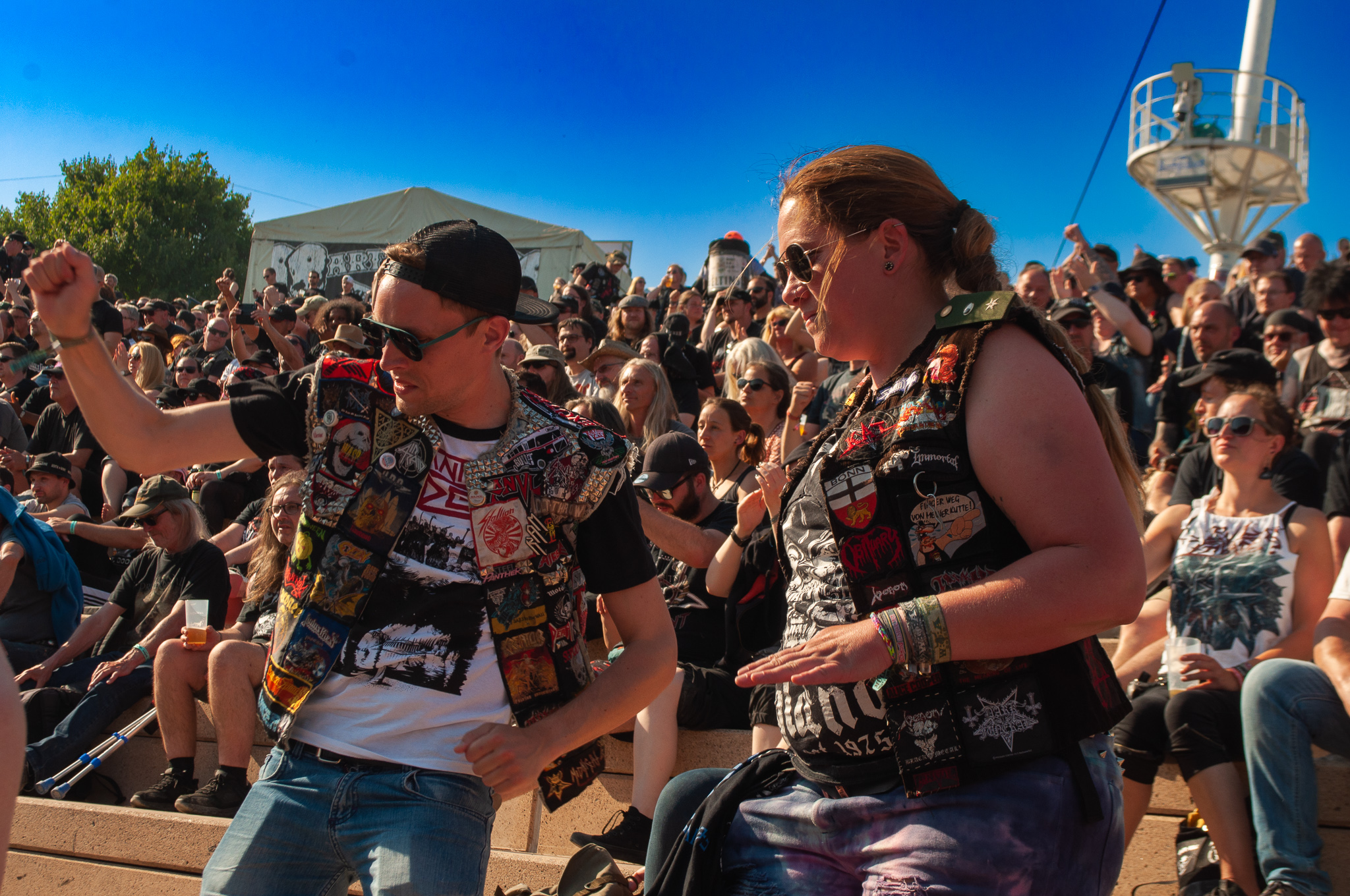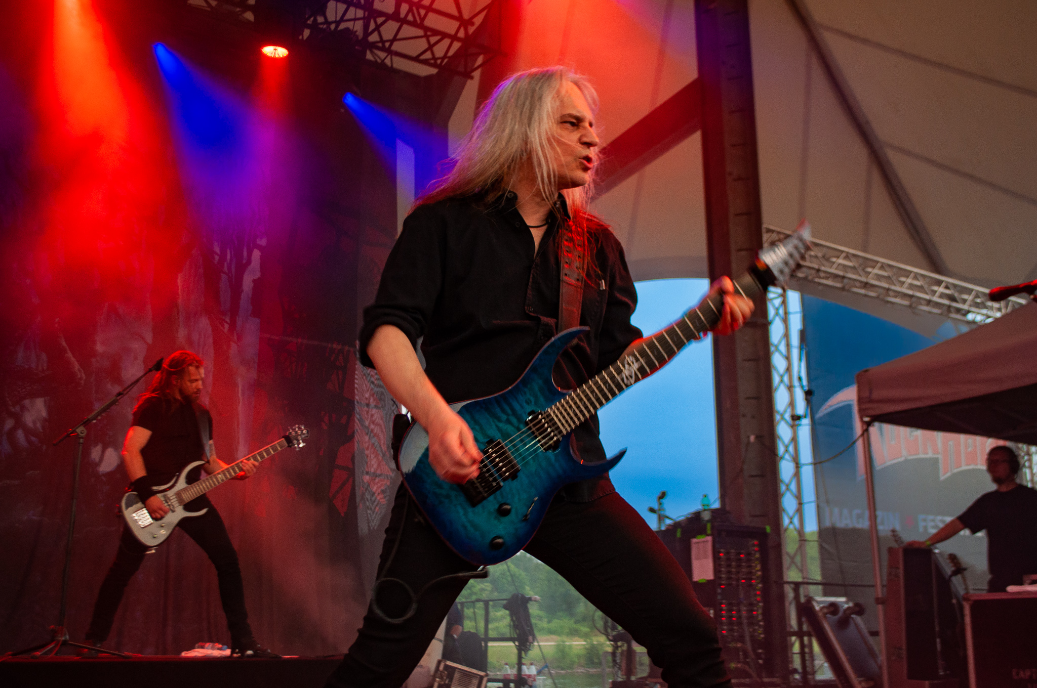 Fernab von Ballermann-Junggesellenabschieds-Tourismus gibt’s hier die für einen Rauschzustand ausreichende Dosis Heavy Metal. Ich reise Samstag an und werde auf dem Campingplatz entsprechend begrüßt: „hey du bist spät, du hast schon voll viel verpasst“. Die Festivalbesucher konnten sich am Vortag die Gehörgange bereits von Kapellen wie NIFELHEIM, AXXIS, HEATHEN und SACRED REICH freipusten lassen. Den Zeltaufbau versüßt mir der griechische Psychedelic Folk Rock von VILAGERS OF lOANNINA CITY, welcher vom mit gegrilltem Fleischgut verfeinerte Sommerwind über den Platz getragen wird. Höchste Zeit für ein kühles Pils und es geht, vorbei an dem reichhaltigen Angebot der Merch-Stände, ins Amphitheater, wo ATLANTEAN KODEX loslegen. Die Bayern klingen ein wenig nach ICED EARTH und können das Publikum mit klassischen Heavy Metal-Songs wie „Twelve Stars and an Azure Gown“ und „The Atlantean Kodex“ begeistern. Die Sonne scheint, die Stimmung ist gut und nach nur kurzem Umbau laden THE NIGHT FLIGHT ORCHESTRA ein, die verstaubten Stiefel aufzuziehen und in die Tanzschühchen zu schlüpfen. Die Truppe um den schwedischen SOILWORK-Fronter Björn Strid hat Arena Rock und zuckersüße Wohlfühlhymnen am Start. Das Projekt begann als spontane Schnapsidee und inzwischen veröffentlichte die Band ihr sechstes Studioalbum „Aeromantic 2“. Songs wie „White Jeans“ und „West Ruth Ave“ machen Laune, die Mucke ist aber auch ziemlich kurzweilig und seicht mit poppigen Disko-Einflüssen. Das Amphitheater ist in Bierlaune, das Tanzbein wird geschwungen und die Polenese ist auf dem Weg nach Blankenese.