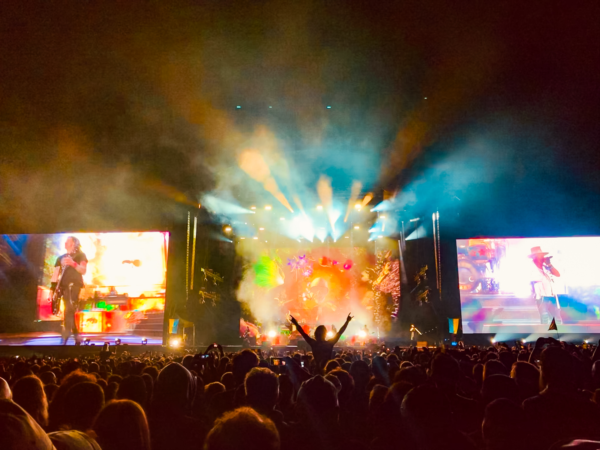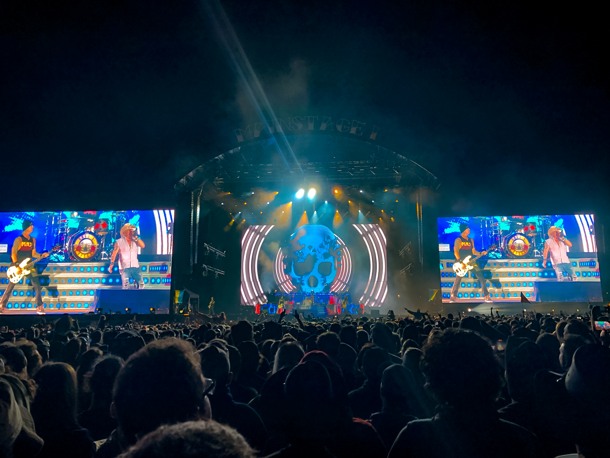 Pulled Pork, Red Thai-Curry…, alles schön und gut – aber wo sind Zyklopen- und Barbaren-Spieß, wenn man sie braucht. Nach einem Snack finden wir uns zur zweiten Hälfte des NIGHTWISH-Auftritts ein. Ich hätte auch MYRKUR und KADAVER gut gefunden, aber vor den Hauptbühnen wird es sehr voll, wenige wollen GUNS`N`ROSES verpassen und um noch vor die Bühne zu kommen, muss man sich zeitig hier einfädeln. NIGHTWISHs Symphonic Metal ist nicht meine Baustelle, aber sie haben eine große treue Anhängerschaft und der Erfolg gibt ihnen Recht. Floor Jansen trägt Hits wie „Dark Chest of Wonder“, „Last Ride oft he Day“ und „The greatest Show on Earth“ stimmgewaltig und sympathisch vor. Keyboarder Tuomas Holopainen sorgt für eine gehörige Portion Bombast. GUNS`N`ROSES lassen sich nicht lumpen und spielen sensationelle zweieinhalb Stunden! Eine gute 24 Songs lange Setlist mit vielen Hits haben die Jungs am Start: Es geht los mit „It`s so Easy“ und nach „Welcome tot he Jungle“ folgt ein gut gelungenes „Back in Black“. Einige Cover-Songs werden dargeboten, neben AC/DC auch VELVET REVOLVER, WINGS und THE STOOGES. Das coole "Civil War" erhält ein fettes Jimi Hendrix-Outro. Die riesigen grellen Videoanimationen beim Gig sind großes Kino. Zu „November Rain“ nimmt Axl am Flügel Platz und das Publikum singt motiviert „Sweet Child o`Mine„ und „Knockin`on Heaven`s Door“. Schließlich ist nach „Patience“, „You`re Crazy“ und „Paradise City“ Schluss. Slashs bluesiger Lead-Sound kommt gut zur Geltung, Axls Stimme ist ein auf und ab, zwischenzeitig klingt er arg froschig. Aber sind wir ehrlich, war Axl Rose jemals ein großer Sänger? Schwamm drüber, ein super Auftritt. Um 0:30 Uhr spielen BLIND GUARDIAN und eröffnen mit „Into the Storm“ und „Welcome to Dying“. Als besonderes Highlight wird heute Abend die ganze „Somewhere far Beyond“ gespielt; die Scheiben hat 30. Geburtstag. Zum Ende gibt’s noch „Mirror Mirror“ und „Valhalla“ auf die Löffel. Sorry …„Valhaalaaaa - Deliiiiverance, Why've you ever forgotten meeeee“, das hab ich entschieden zu oft gehört. Dann lieber noch zum Temple für die letzten IN EXTREMO-Songs. Die Mittelalterrocker veranstalten dort einen guten Abriss und werden von den Franzosen gefeiert. „We are IN EXTREMO from East Germany - if you don't know the lyrics, just sing lalala“ schlägt Sänger Michael Robert Rhein vor. Zu „Frei zu sein“ gibt’s einen tänzelnden Circle Pit mit Rollstuhlfahrerin mittendrin. Nach „Avi vis lo lop“ und „Pikse Pikse“ verlassen verschwitze Konzertbesucher das Zelt.
