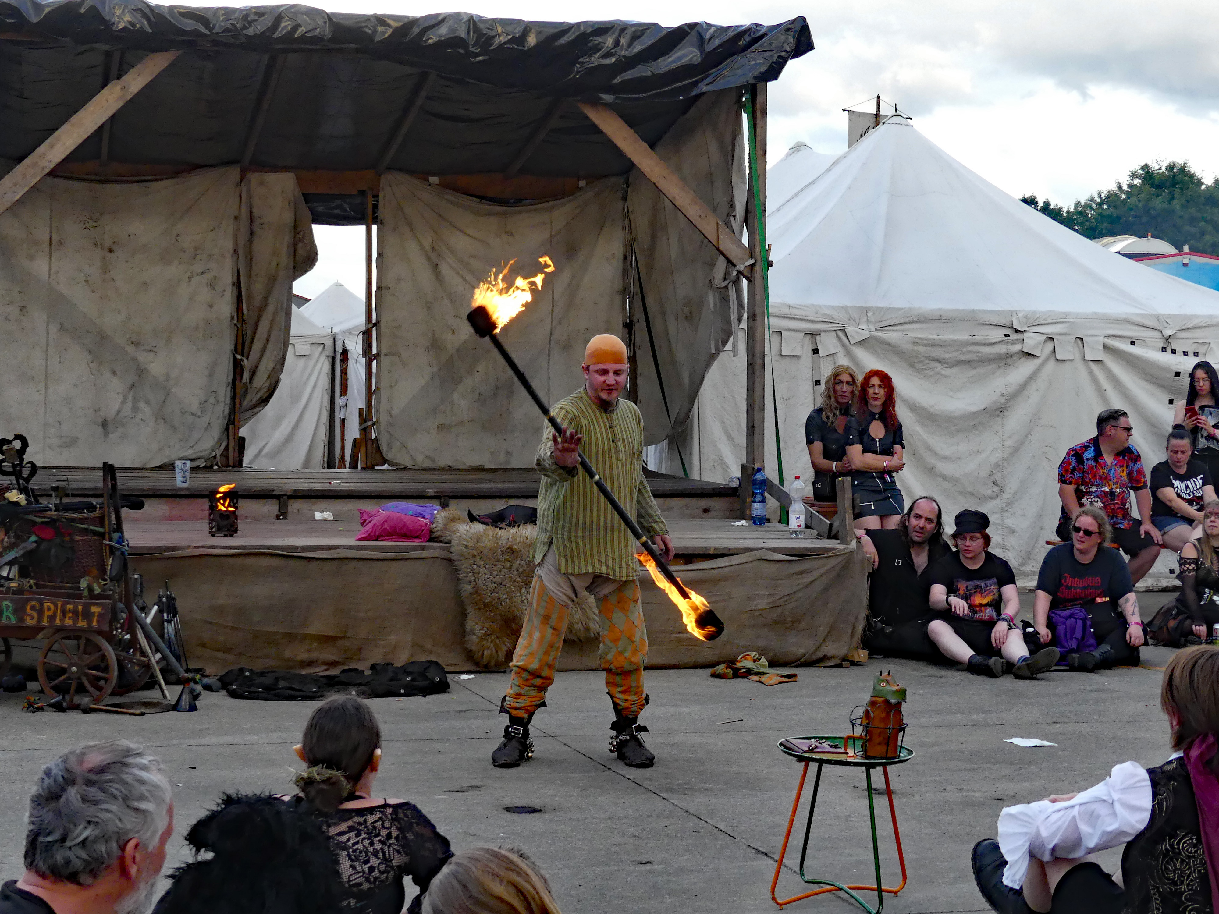 Um 16: 30 Uhr übernahm PETER HEPPNER die Bühne (ein Gastspiel hatte er ja schon gestern gegeben) und lieferte, beginnend mit „Alleinesein“, einen Querschnitt durch sein Schaffen ab, der sowohl seine Zeit mit WOLFSHEIM als auch seine Solo-Werke abdeckte und in dem natürlich auch der WOLFSHEIM-Hit „Kein Zurück“ nicht fehlen durfte. Die Stimmung vor der Main Stage war entspannt, man war teilweise schon etwas mitgenommen vom ersten Festivaltag und viele nutzen die etwas ruhigeren Klänge, um sich auf Bierbänken und Picknickdecken zurückzulehnen und ein wenig zu erholen. Weniger gemütlich ging es stattdessen an der Club Stage zu, auf der AGONOIZE, entgegen vorheriger Befürchtungen und zur großen Freude manch eines Fans, diesmal wieder nach Herzenslust mit Kunstblut herumspritzen durften. Wer dabei in den vorderen Reihen gestanden hatte, war hinterher unschwer zu erkennen. Auf der Main Stange ging es unterdes zurück ins Mittelalter: SUBWAY TO SALLY hielten, von Pyrotechnik untermalt, Hof und brachten das Publikum mit „Eisblumen“, „Sieben“, „Kleid Aus Rosen“ und „Tanz auf dem Vulkan“ auf Touren. Apropos tanzen: Stolz war die Band verständlicherweise auch, denn wie Sänger Eric Fish vor „Veitstanz“ so schön bemerkte: „Es ist schon cool, wenn man ein Lied geschrieben hat, nach dem inzwischen Discos benannt sind!“