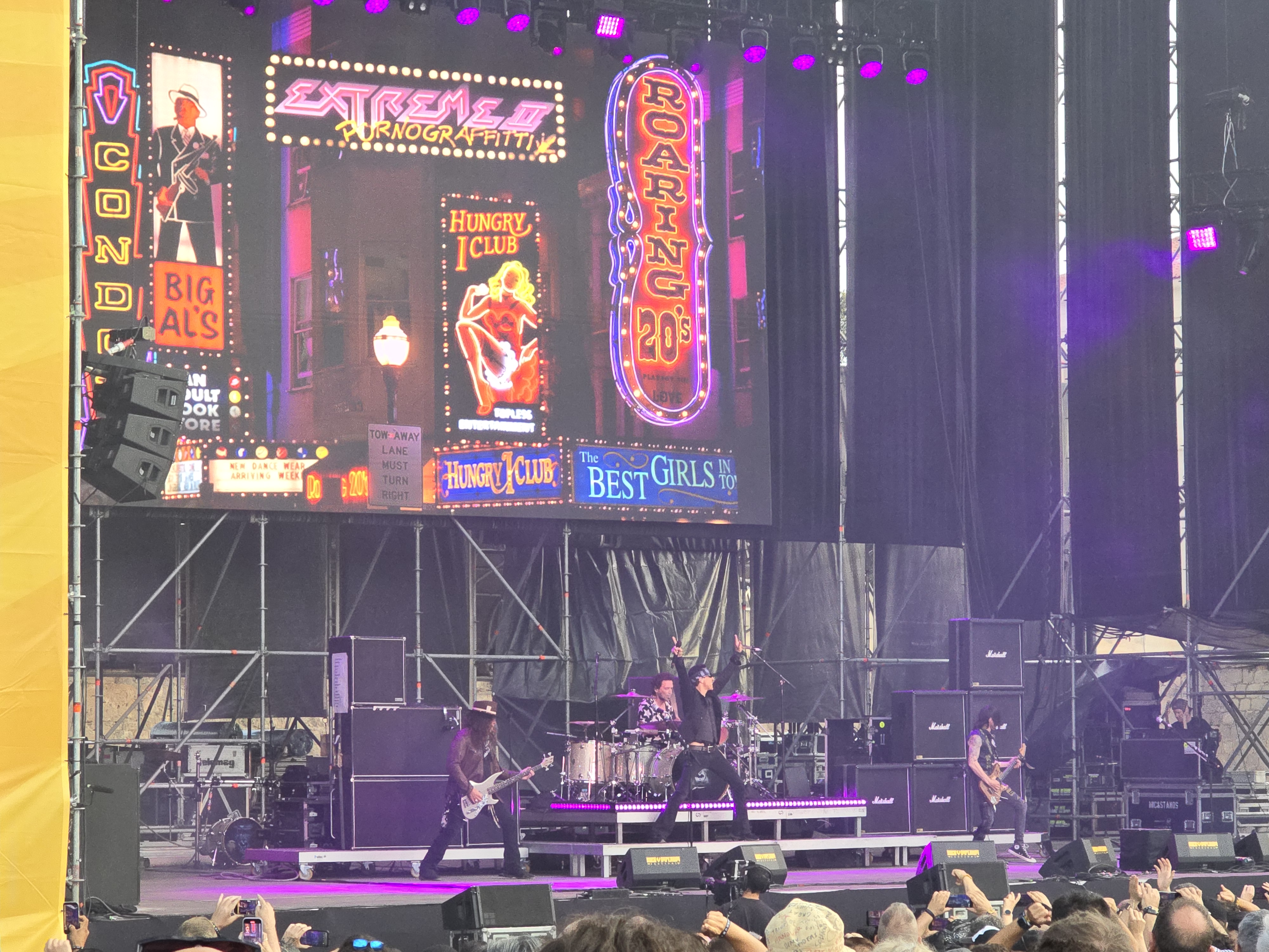 Mit „It’s A Monster“ und „Decadence Dance” starten die wiedererstarkten EXTREME in ihren Set. Auch wenn man sich im weiteren Verlauf über das Altern beschwert und sich darüber freut beim Acoustic Teil der Show auch mal sitzen zu dürfen, so ist von Altersschwäche nichts zu erkennen. Gary Cherone ist nicht nur gut bei Stimme, sondern auch biegsam und agil, wie eh und je und Nuno Bettencourt zaubert auf der Gitarre, dass es eine wahre Freude ist. Der Überhit „More Then Words“ wird natürlich aus tausenden Kehlen mitgesungen und so ist man bestens eingestimmt für den ersten Headliner des Festivals.