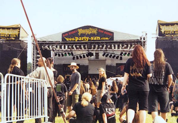 Ich bin als Booker erst seit 1999 für das "Party.San Open Air" tätig. Der "Ersttäter" war unser Boy (Promo/ Produktion), der Anfang der 90er das "Party.San Open Air" auf ´nem Fußballplatz mit einem alten Heuwagen als Bühne startete. Damals war die Bandauswahl eine Mischung aus lokalen Punk und Metal Bands. Unsere heutige Crew war damals schon mit am Start und half ihm beim Booking, Aufbau/Abbau und so weiter. Er wollte damals unbedingt mehr Metal in die Sache bringen und so kamen unser Mieze (Produktion) und ich (Booking) mit ins Spiel. Ich habe seit dem ersten Amon-Amarth-Gig 1997 im Weimarer Jacobclub dort fortlaufend Glubgigs (Arch Enemy, Vomitory & Eucharist) organisiert und habe mein Herz verloren. Ich konnte mir kein besseres Hobby als das "Party.San OA" vorstellen als mich Boy um Mithilfe bat. Die Undergroundszene war damals auch auf Grund des Cothurnus-Magazines mein größtes Steckenpferd.