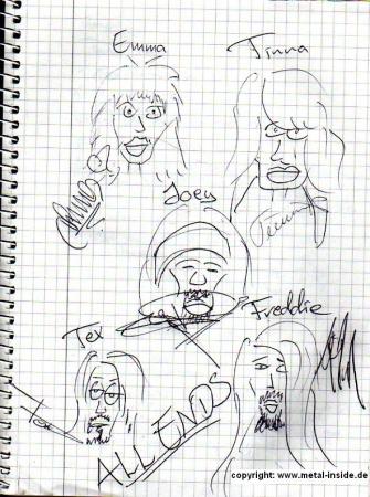 Tex: Genau. Die bringen wir dann mit zu den Proben, und da sitzen wir dann alle zusammen, hören uns das an und fangen an, zu arrangieren. Und was die Melodien angeht: das sitzen wir normalerweise immer alle da und hören uns das immer und immer wieder an, bis dann irgendwann auf einmal jemand sagt "Wartet mal! Ich hab die Melodie!", und dann versuchen wir, das aufzunehmen. Dann sagt vielleicht Joey "Oh, ich finde den Teil da aber nicht so gut..."- wir sind also alle am Songwriting beteiligt. Es fängt zwar meistens mit uns an, aber das war´s dann, danach mischen alle mit.