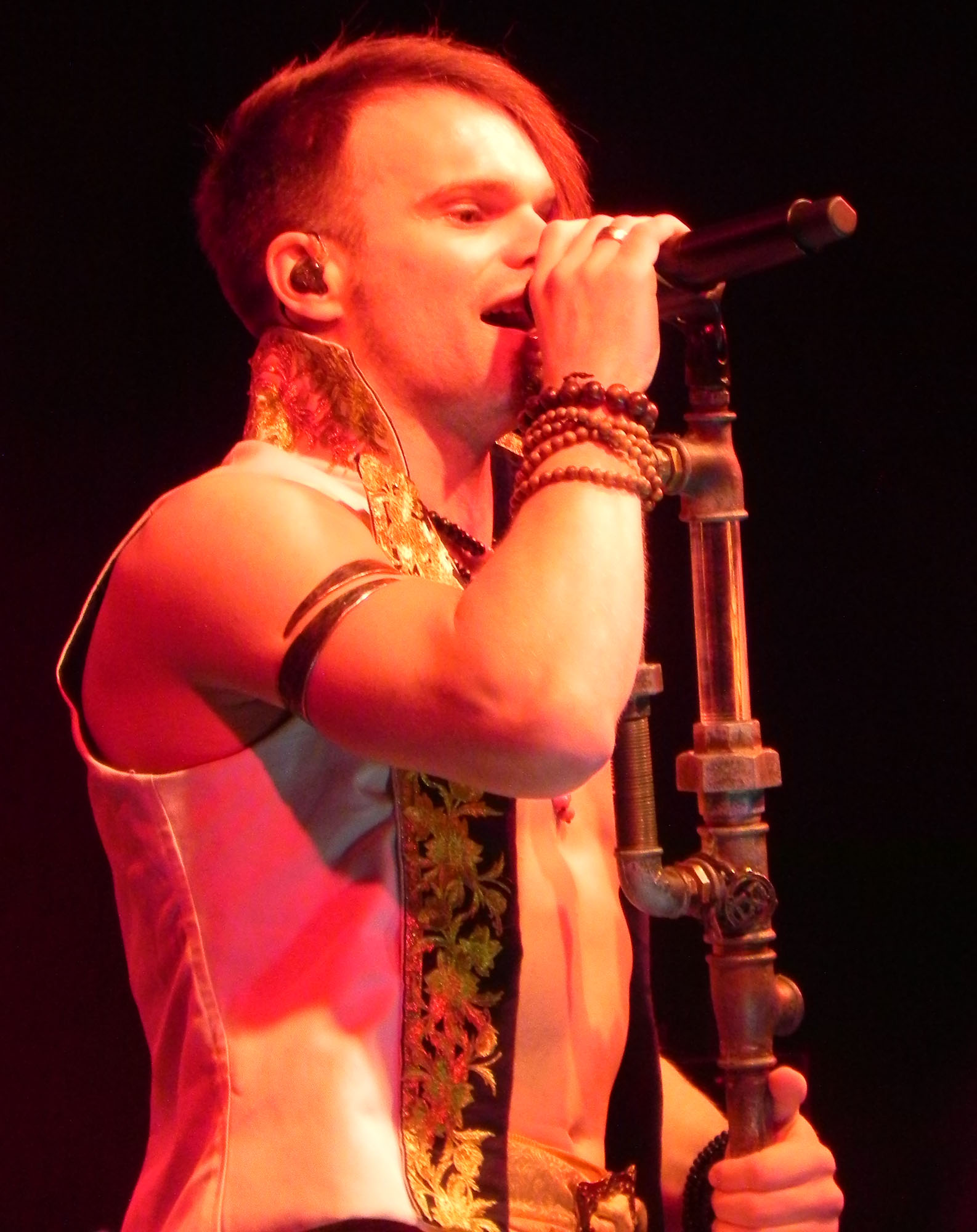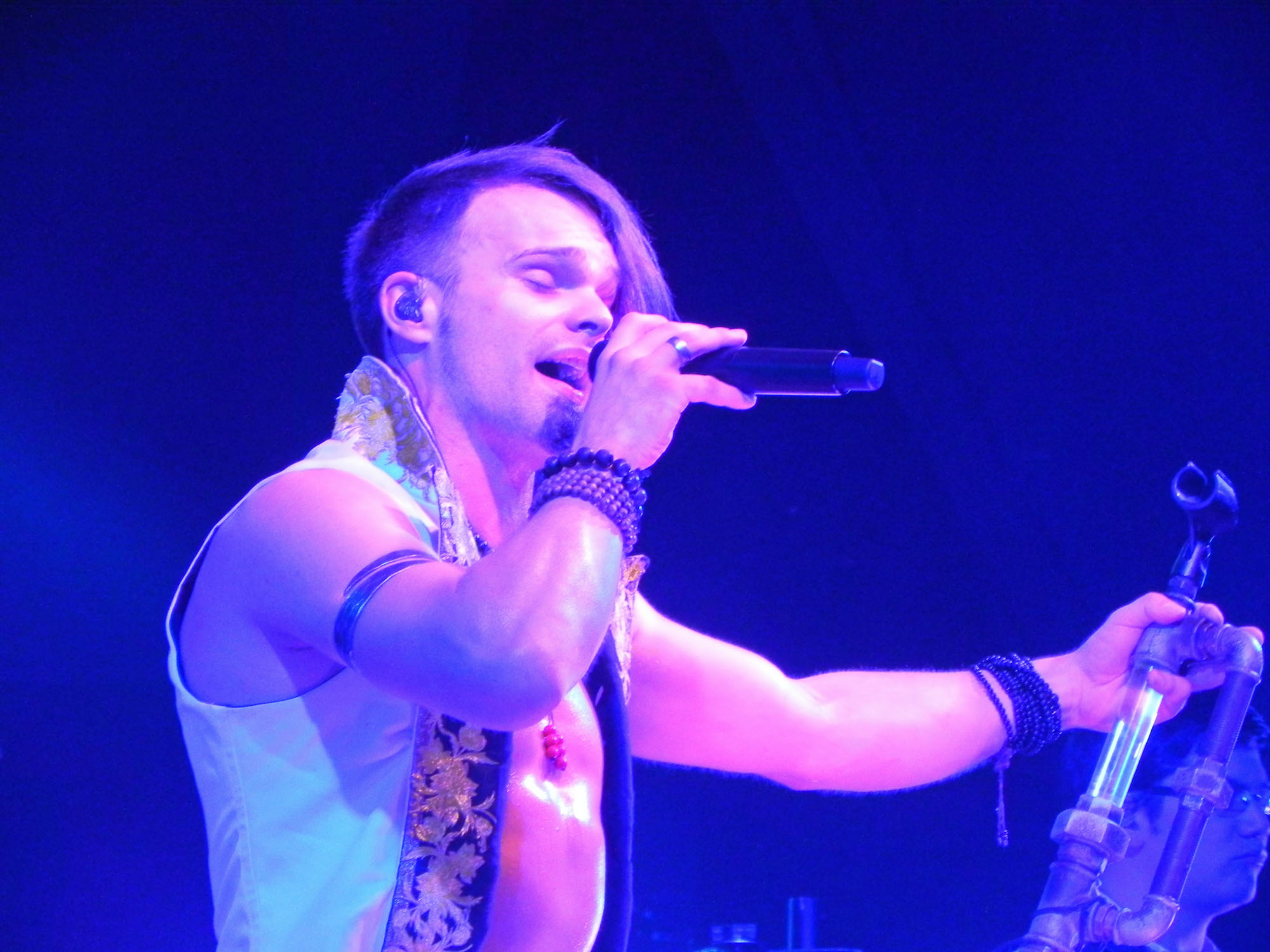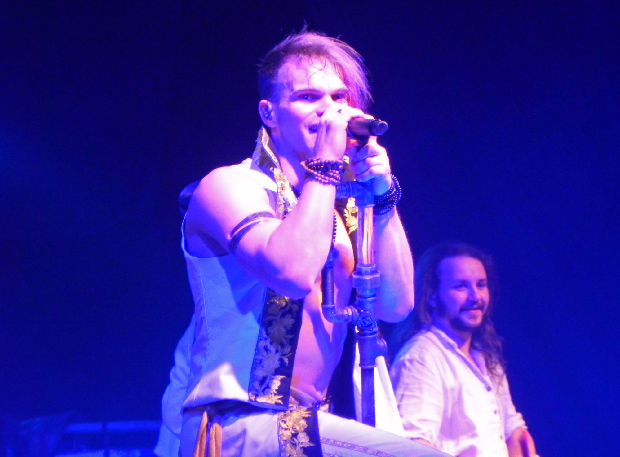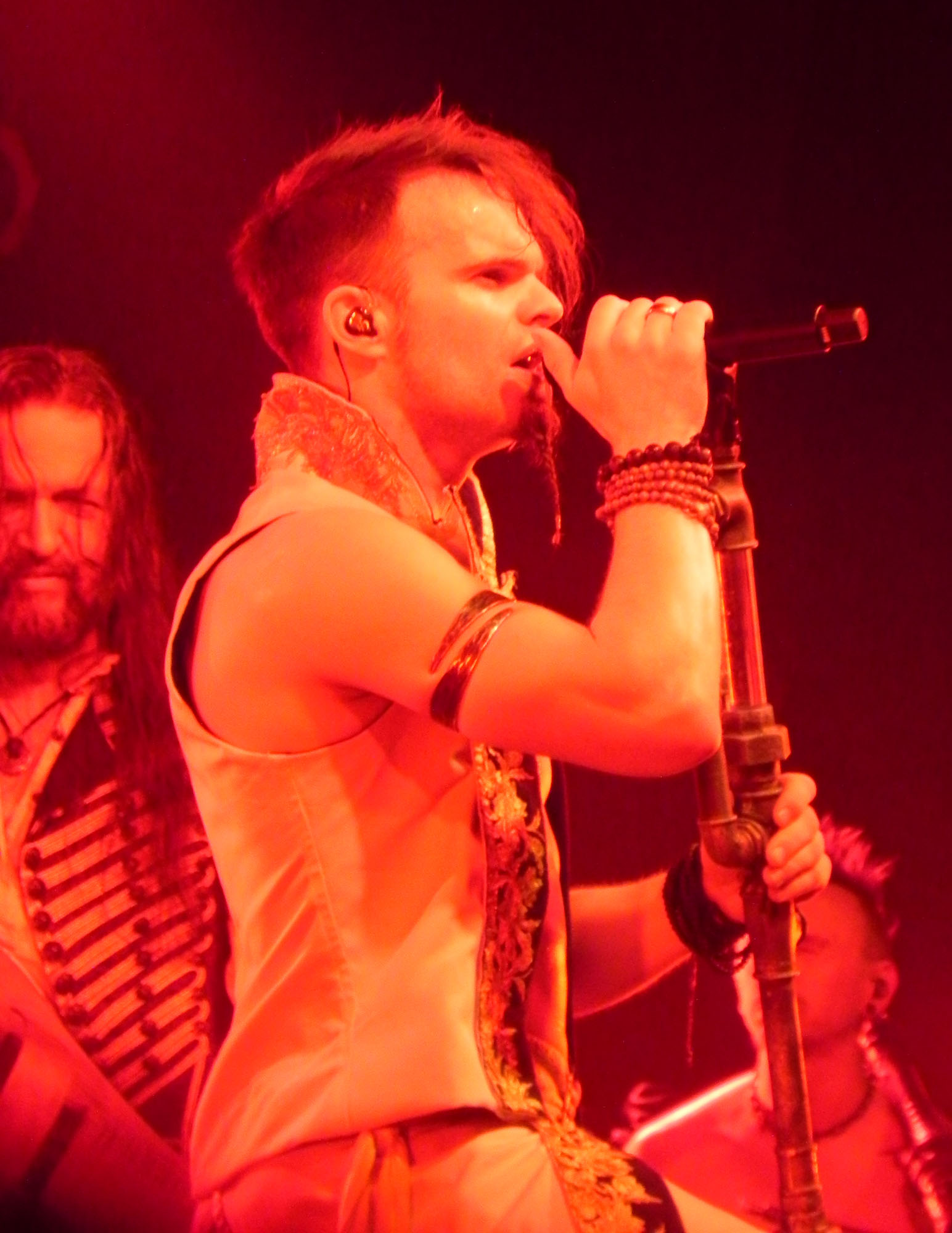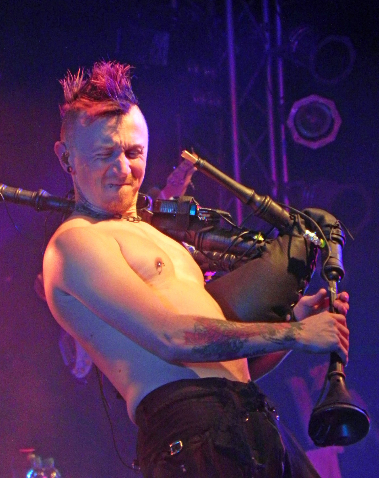 Doch zunächst einmal war es Zeit für den Support in Form von NACHTGESCHREI, die um 19:30 Uhr die Bühne enterten und gut gelaunt loslegten. Mit mittelalterlich-rockigen bis metallischen Klängen ging es druckvoll zur Sache und die Band durfte sich darüber freuen, auch durchaus den einen oder anderen eigenen Jünger im Publikum vorzufinden. Überhaupt kam die Kombo gut an und Songs wie „Monster“, „Das Nichts“ und „An Mein Ende“ wurden rückhaltlos gefeiert. Auch neues Material hatten die Frankfurter am Start, wurde doch mit „Der Letzte Tag“ ein neuer Song vorgestellt. Und das alles mit einem Ersatzmann am Start: da Drummer Stefan ausgefallen war, musste ein neuer Mann am Schlagzeug heldenhaft in die Bresche springen, der sich wacker schlug und mit einem entsprechenden Applaus von Seiten des Publikums gewürdigt wurde. Nach einer Spielzeit von 45 Minuten endete das Set mit „Schlaflos“, nicht ohne ein gewisses Bedauern, denn sowohl Band als auch Publikum hätten durchaus Gefallen an einer Zugabe gehabt, die der straffe Zeitplan jedoch nicht gestattete.