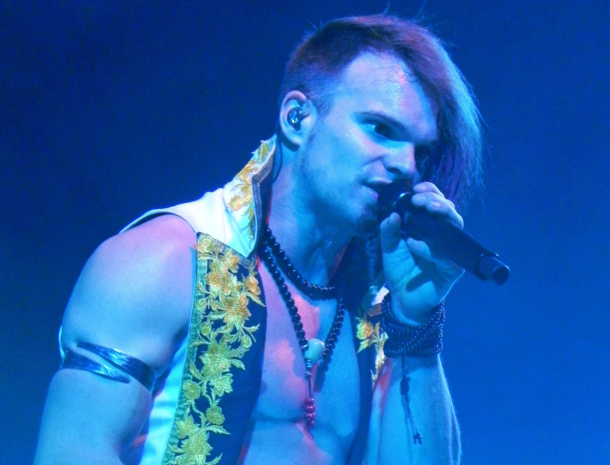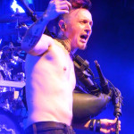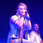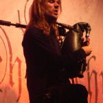 Die tückische Müdigkeit ließ sich jedoch zum Glück durch Publikumsermunterung noch einmal vertreiben, auch wenn in der kurzen Pause vor der Zugabe deutlich wurde, dass sich im Publikum ein Generationswechsel abspielte: das sonst in diesem Punkt so geübte SaMo-Publikum („Spielmannsschwur“ skandieren, „Saltatio….MORTIS“ brüllen) wirkte diesmal etwas orientierungslos – es schien an Übung und Traditionskenntnis zu mangeln, man wollte zwar ganz klar eine Zugabe, schien aber nicht so recht zu wissen, wie man diese bewerkstelligen sollte, so dass sonst übliche, einhellige Schlachtrufe der Menge nicht zustande kamen. Da aber glücklicherweise manchmal eben doch die Absicht zählt und die Spielleute diese erkannten, füllte sich die Bühne rasch wieder mit Leben und die Band gab mit dem Klassiker „Tritt Ein“ noch einmal volle Breitseite. Alea nahm ein Bad in der Menge und ließ sich durchs Publikum reichen, wobei ihn offenbar die Technik im Stich ließ: er absolvierte den Auftritt gesanglich tadellos, kommentierte jedoch bei seiner Rückkehr auf die Bühne, an seinem InEar-Monitor herum nestelnd, dass ihm „seine Öhrchen“ abhanden gekommen seien: „Früher wäre mir das nicht passiert!“ – Daraufhin Lasterbalk: „Ja, früher hättest auch gerafft, wenn zwei Songs ohne Pause und Ansage ineinander übergehen!“. Allgemeines Gelächter. Alea: „Oh, echt? Sorry! Ich brauchte aber halt nun mal die Pause, weil ich meine Ohren verloren habe, verdammt!“. Es folgten noch „Worte“ und Trinklied“, bevor man zum großen Finale ansetzte: nie, niemals darf es ein SALTATIO-Konzert ohne den „Spielmannsschwur“ geben, verbindet das Lied doch Band und Publikum und stellt eine Art gegenseitigen Treueschwur da. Entsprechend gab es kein Halten mehr und die Menge sang aus Leibeskräften mit, bevor sich die sichtlich gerührten Spielleute nach satten zwei Stunden Spielzeit wortreich für den gelungenen Tourauftakt bedankten und verabschiedeten. Der „Zirkus Zeitgeist“ mag weiterziehen, aber bei der derzeit herrschenden Resonanz kommt er sicherlich bald wieder in die Stadt – freuen wir uns also schon einmal darauf!