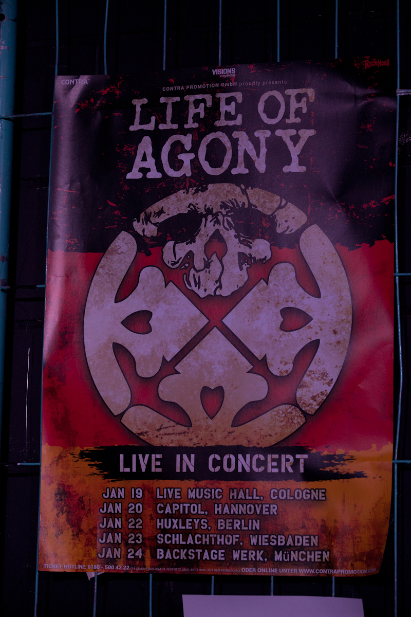 Als ich 1993 im TV bei "Headbangers Ball", einem schon lange eingestellten Metalmagazin auf MTV, das Musikvideo von LIFE OF AGONY zu "Through And Through" sah, mich bei dem außergewöhnlichen Gesang und der Intensität der Band infizierte, hätte ich nicht gedacht, 23 Jahre später die Band aus Brooklyn wieder bei einem Liveauftritt begrüssen zu können. Berlin, Hannover, München, Köln und Wiesbaden standen auf der kleinen Deutschlandtour von LIFE OF AGONY. Wiesbaden? Ja, Wiesbaden und zwar im dortigen Schlachthof. Warum gerade Wiesbaden als doch unbekannterer Ort in Bezug auf die anderen Städte ausgesucht wurde, ist mir nicht bekannt, aber schon das letzte Konzert dort im Jahre 2009, was ich in an gleicher Stelle besuchen konnte, war sehr gut besucht. Auch dieses Jahr war der Schlachthof am Samstag, den 23.01.2016, zu gut 80 % gefüllt.