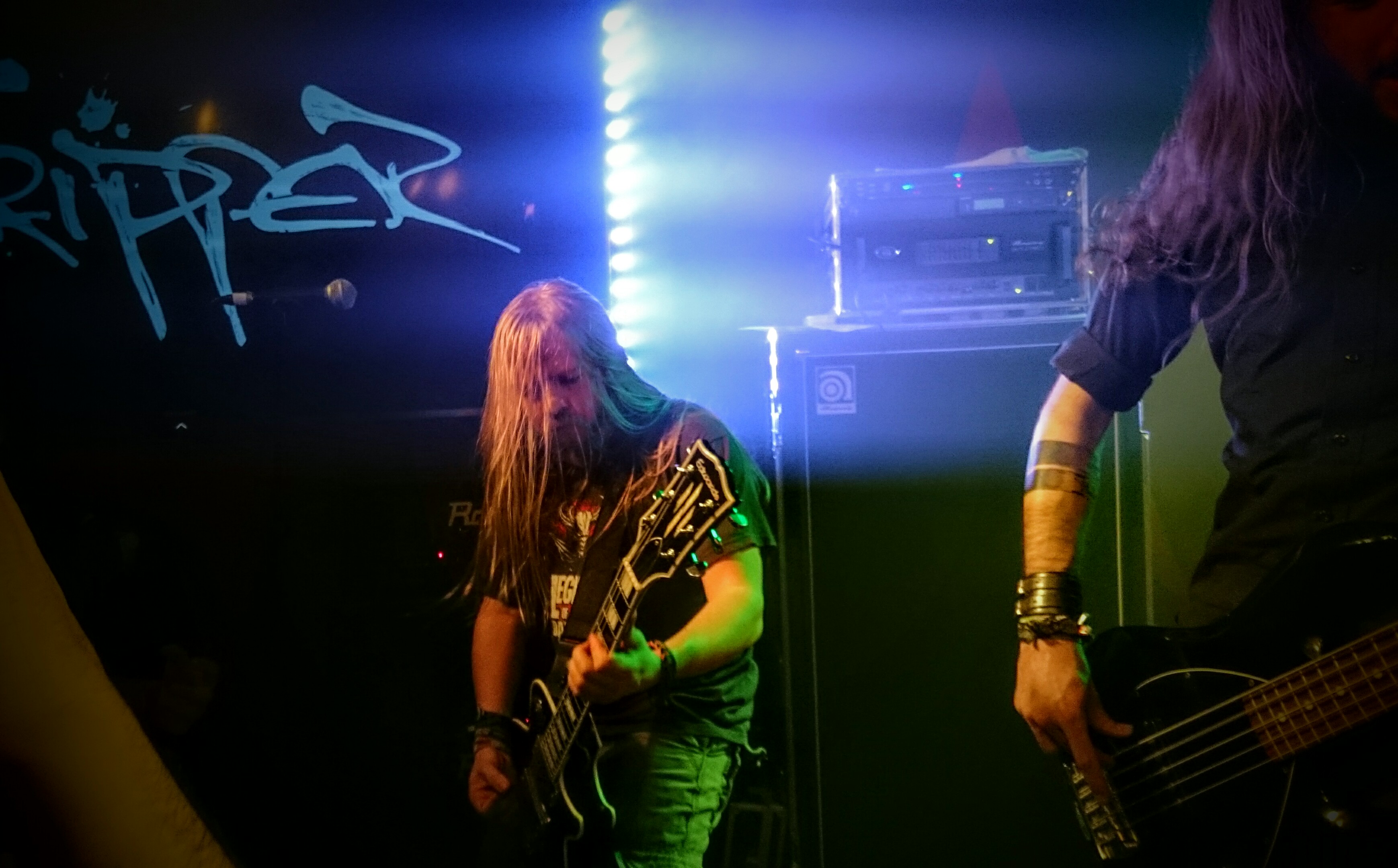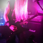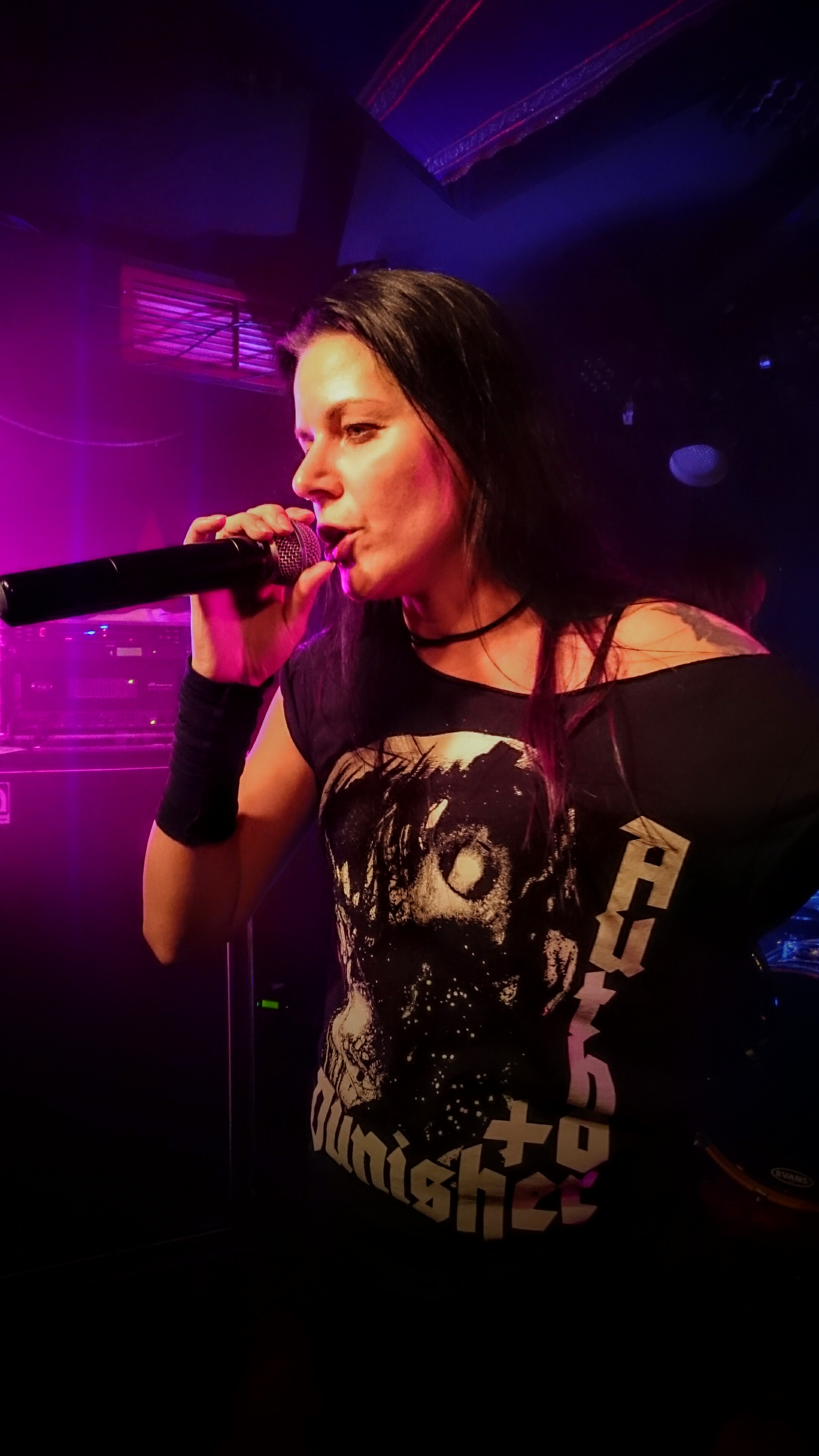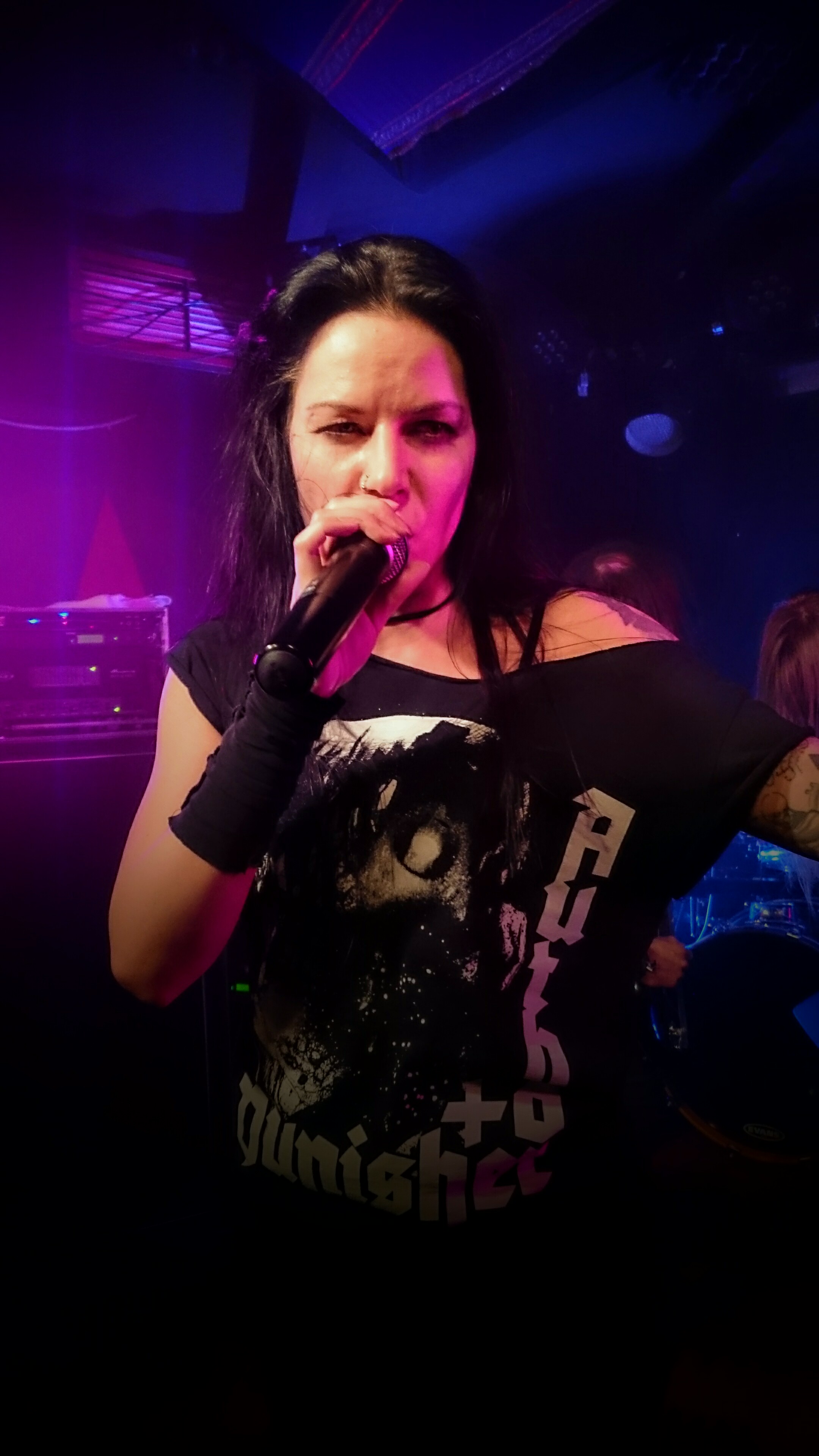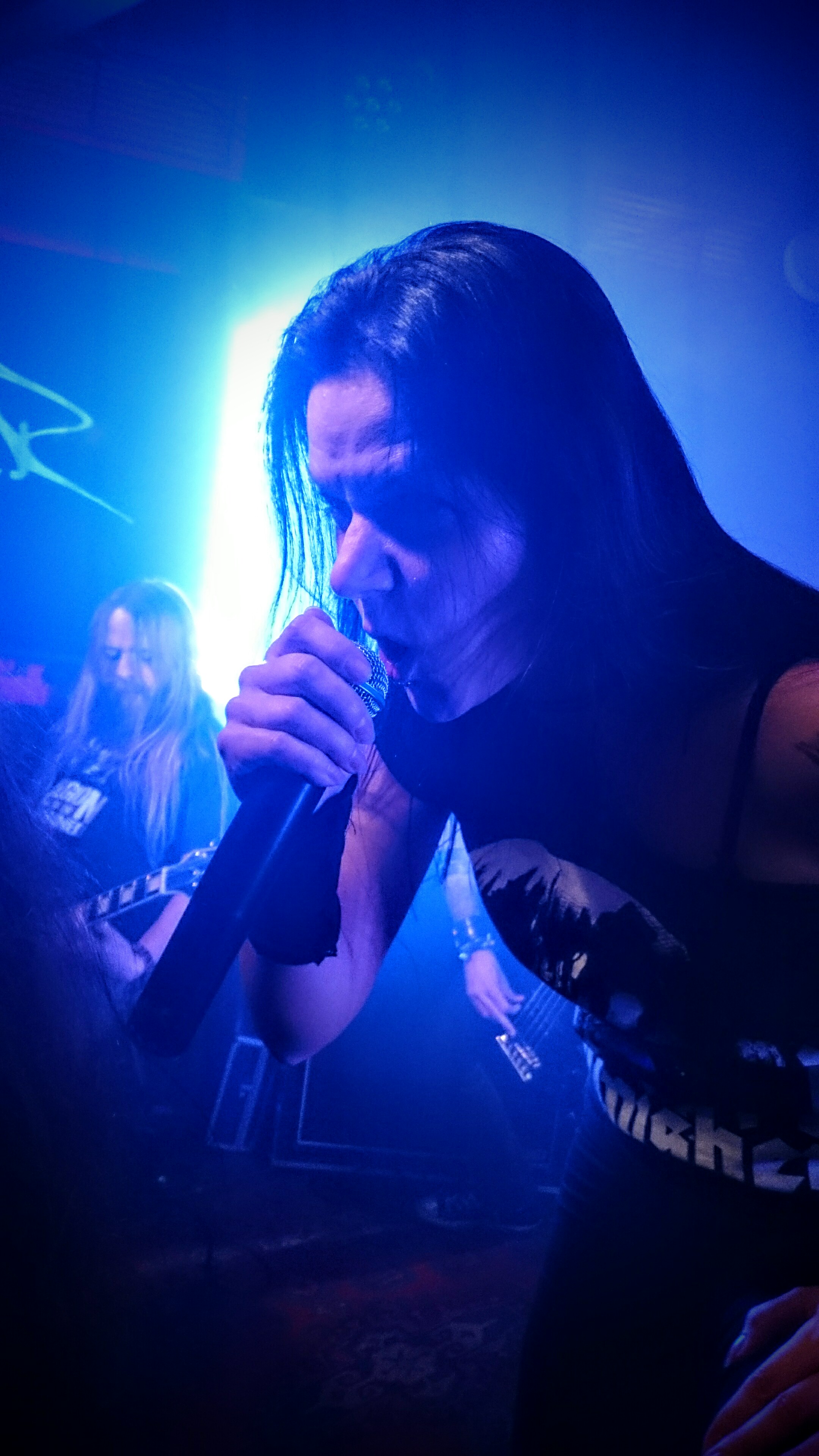 Bei der „Chefin“ handelt es sich um CRIPPER-Sängerin Britta Görtz, welche überraschenderweise auch gerade durch die Tür kommt. Gut gelaunt gibt sie zu Protokoll, dass es etwas später anfangen wird, da die Vorband technische Probleme hat. Mit leichter Verzögerung geht es dann für den Support SYNDEMIC los. Die Hamburger spielen modernen Death Metal und machen trotz abgerauchtem Amp und gerissener Saite das Beste aus der Situation und bringen so ihr Set solide hinter sich. Gegen 22:15 ist Schluss und ein etwas längerer Umbau beginnt.