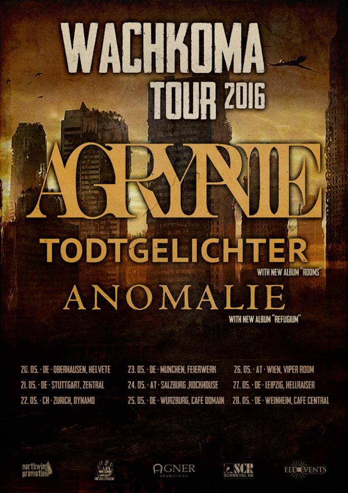 Den Headliner machten AGRYPNIE, auf die wir uns sehr gefreut hatten – und die wir auch schon einige Male live gesehen haben. Der Keller war zu Beginn so voll wie nie und nach einer längeren Umbaupause ging es dann auch los und zwar mit einem neuen Song. Leider teilten AGRYPNIE das viel zu laute Schicksal von TODTGELICHTER, so dass jeder, der die Show irgendwie genießen wollte sich verzweifelt Gehörschutz in die Ohren stopfen musste. Schade! (An die Veranstalter: Was war da los?) Spätestens ab dem dritten Song konnten AGRYPNIE einen richtig packen, die Show an sich war trotz technischer Probleme ganz gut zu genießen und trotzdem verließen einige Zuschauer (wegen der Lautstärke?) den Raum.