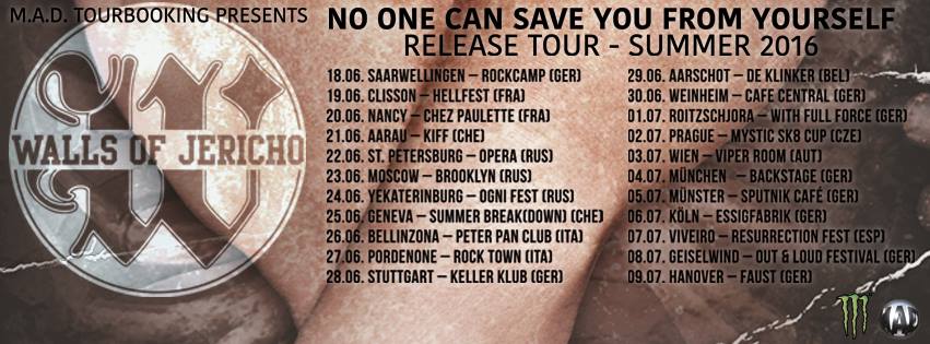 Nach acht Jahren Pause melden sich WALLS OF JERICHO endlich mit einem neuen Album zurück. Das Langeisen hört auf den Namen „No One Can Save You From Yourself“ und zur gleichnamigen Tour lässt man sich mal wieder im Kulturzentrum Faust in Hannover blicken. Die Hardcore-Fans haben Bock, weshalb die Show nur wenige Stunden vor Beginn vom Mephisto in die größere 60er Jahrehalle verlegt wird. Den Support geben heute WORLD NEGATION und OUT FOR CHANGE, welche den schon Anwesenden quasi langweiligen Hardcore-Metalcore im Doppelpack präsentieren. Man könnte fast sagen, wer zu spät kommt, den belohnt heute mal das Leben. Diese Vorbands (?) braucht man nämlich wirklich nicht gesehen zu haben. Zu klischeehaft und zu abgedroschen wird hier zu Werke gegangen. Im Grunde ist hier jeder Satz zu viel.