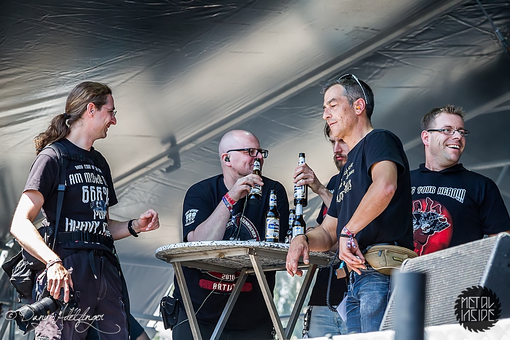 Und jetzt der Kulturschock: Nachdem sich DELAIN artig verabschiedet hatten, stürmten Frankfurt’s Finest die Bühne und präsentierten sich agil wie einst im Mai. TANKARD prügelten die Uraltschote „Zombie Attack“ mit so viel Enthusiasmus in die Menge, dass man glauben konnte einer jungen Band bei der Präsentation ihres Debutalbums zuzusehen. Die ersten Heiratsanträge und Kinderwünsche aus dem Publikum an Fronter Gerre ließen da auch nicht lange auf sich warten. Im weiteren Verlauf wurden typische „TANKARD-Groupies“ auf die Bühne geholt (diverse ältere Herren mit Bierplauze), dem Hangover gehuldigt („Morning After“) oder gleich die letzte Ölung…pardon…„Bierung“ verteilt („R.I.B. – Rest In Beer“). Neben Gerre zeigten aber auch Gitarrist Andy und Basser Frank vollen Einsatz. Stillstand ist bei TANKARD nach wie vor ein absolutes No-Go…was jetzt sprachlich auch irgendwie logisch ist. Auch wenn sich die Herren abseits der Bühne gerne mal einen genehmigen, die Show hat noch nie darunter gelitten. Bei allem Witz auf der Bühne, so ist der TANKARDsche Arbeitsethos doch vorbildlich und garantiert immer beste Unterhaltung. Und als zum Schluss noch der „Song Ohne Namen“ („(Empty) Tankard“) angekündigt wurde, gab es endgültig kein Halten mehr und Balingen rastete komplett aus.