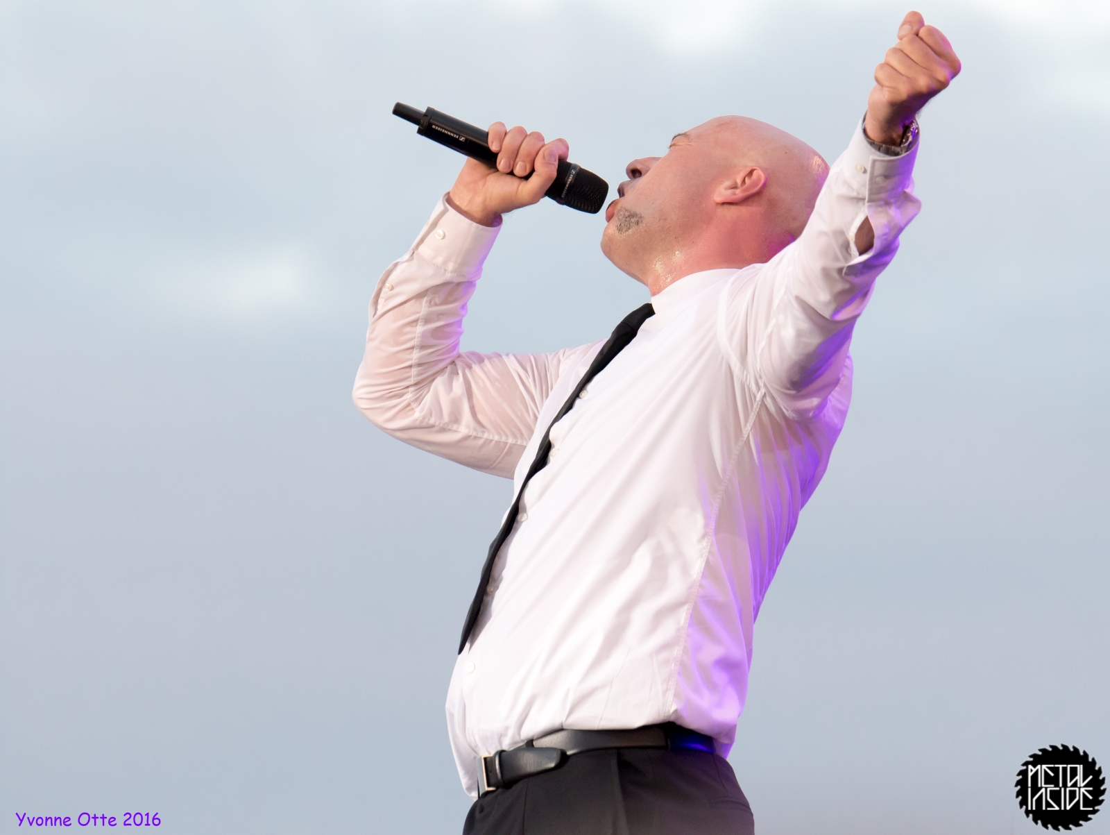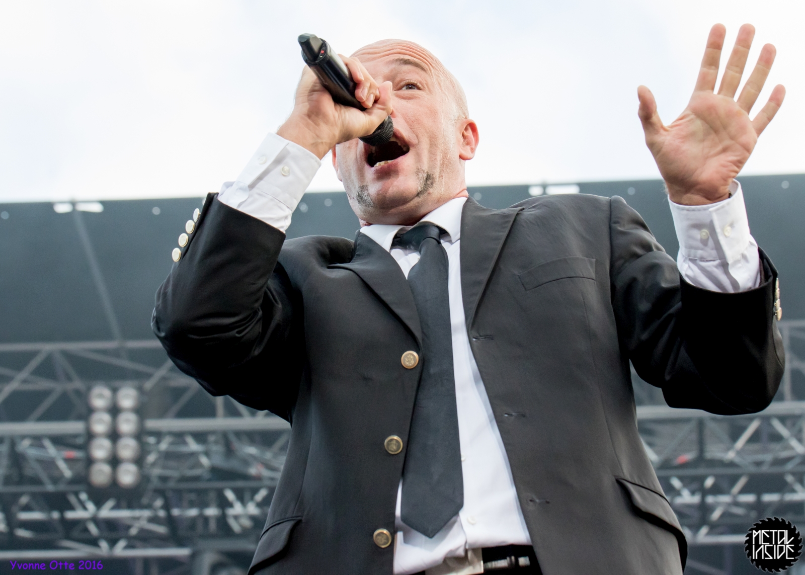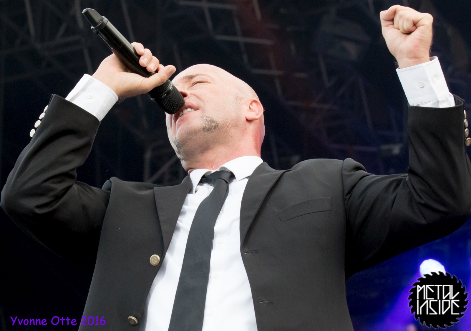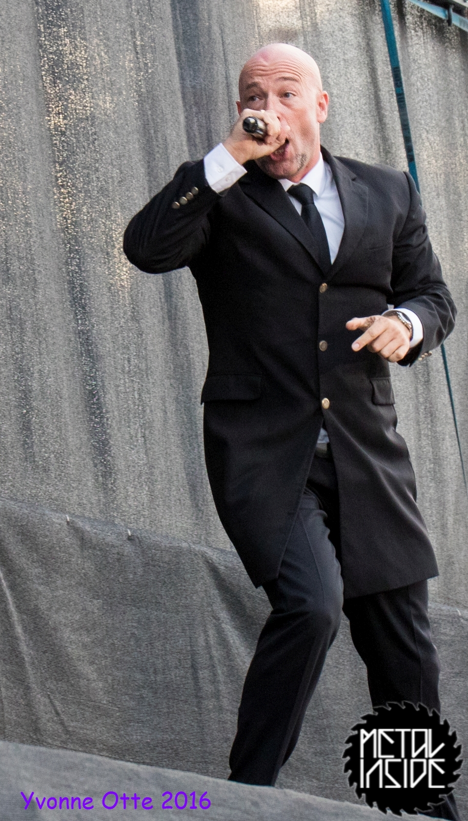 Jetzt sollte es aber wirklich mit UNHEILIG weiter gehen. Nach eines recht langen Intros stürmte der Graf auf die Bühne und die Menge war außer sich! So sollte es jetzt knapp zwei Stunden weiter gehen. Ruhige Momente gab es nur bei den wenigen Balladen, oder wenn der Graf eine seiner sehr persönlichen und auf die Kariere rückblickenden Ansagen gemacht hat. Ansonsten stand weder der Graf still, noch das Publikum. Eine unglaubliche Energie ging von UNHEILIG auf das Publikum rüber und hat einfach jeden mitgerissen. Schön zu beobachten war, dass der viele Erfolg, die der Graf zweifellos die letzten sechs Jahre hatte, sich nicht negativ auf die Show ausgewirkt hat. Oft beobachtet man, dass aus Bands, die früher sehr spontan und fannah waren, „Stars“ geworden sind, die nur noch ihr Programm abspielen und die Konzerte überhaupt nicht mehr persönlich sind. Natürlich geht ein bisschen vom Persönlichsein immer weg, wenn die Hallen größer werden, aber wer UNHEILIG 2010, zu Beginn des (kommerziellen) Erfolges gesehen hat, und jetzt, der wird keinen Unterschied bemerkt haben. Der Graf hat immer wieder den Leuten zugewunken und hat immer wieder kleine Herzchen mit seinen Händen geformt, war bemüht zu allen Seiten gleichviel zu gehen, damit jeder ihn auch mal von nahen sehen könnte. Sowas sieht man wirklich sehr selten. Man hat sich nicht auf einen Open-Air mit 9.000 Leuten gefühlt, sondern von UNHELIG’s Art her eher wie in einem kleinen Club, wo man wirklich noch Blickkontakt zu der Band hat und die Band einen auch sehen kann. Schön war auch zu sehen, dass UNHEILIG eine Band für Jung und Alt ist. Von 5 – schätzungsweise über70 war wirklich alles dabei und vom Alter her so gemischtes Publikum hat man nicht so sehr oft. UNHEILIG galt immer als sehr kinderfreundlich und oft hatten Eltern mit Kinder einen separaten Bereich, damit sie nicht umgestoßen, oder Ähnliches, werden. Ja, natürlich kann man sagen, dass so kleine Kinder nichts auf Konzerte zu suchen haben, aber wo ist das Problem? Für Kinder ist sowas ein tolles Erlebnis. Etwas, was sie wohl nie mehr vergessen werden und in einem Land, was so kinderunfreundlich ist wie Deutschland und wo die Eltern eh immer die Dummen sind, egal, was sie machen, ist es schön zu sehen, dass es auch noch andere Beispiele gibt, wo Familien herzlich willkommen sind. So manche laszive Dancemoves des Grafens waren aber eher 18+,aber gut, sollte ja für jede Altersstufe etwas dabei sein. Natürlich ging bei der Zugabe und bei „Geboren Um Zu Leben“ die Menge nochmal richtig ab. Als bei „der Vorhang Fällt“ der Graf dazu aufgerufen hat, dass doch bitte alle etwas was leuchtet hochhalten sollten, hat man richtig Gänsehaut bekommen. Der Sparkassenpark sah mega aus! Ungewöhnlich natürlich, dass mit einer Ballade das Konzert beendet wird, aber bei einer Abschiedstour wohl nicht verwunderlich. Sehr bewegende Worte auch vom Grafen, bevor er sein letztes Lied für diesen Abend angestimmt hatte. Man hat sich persönlich angesprochen gefühlt und man hatte wirklich auch das Gefühl, dass es ehrliche Worte sind, die vom Herzen kamen.