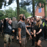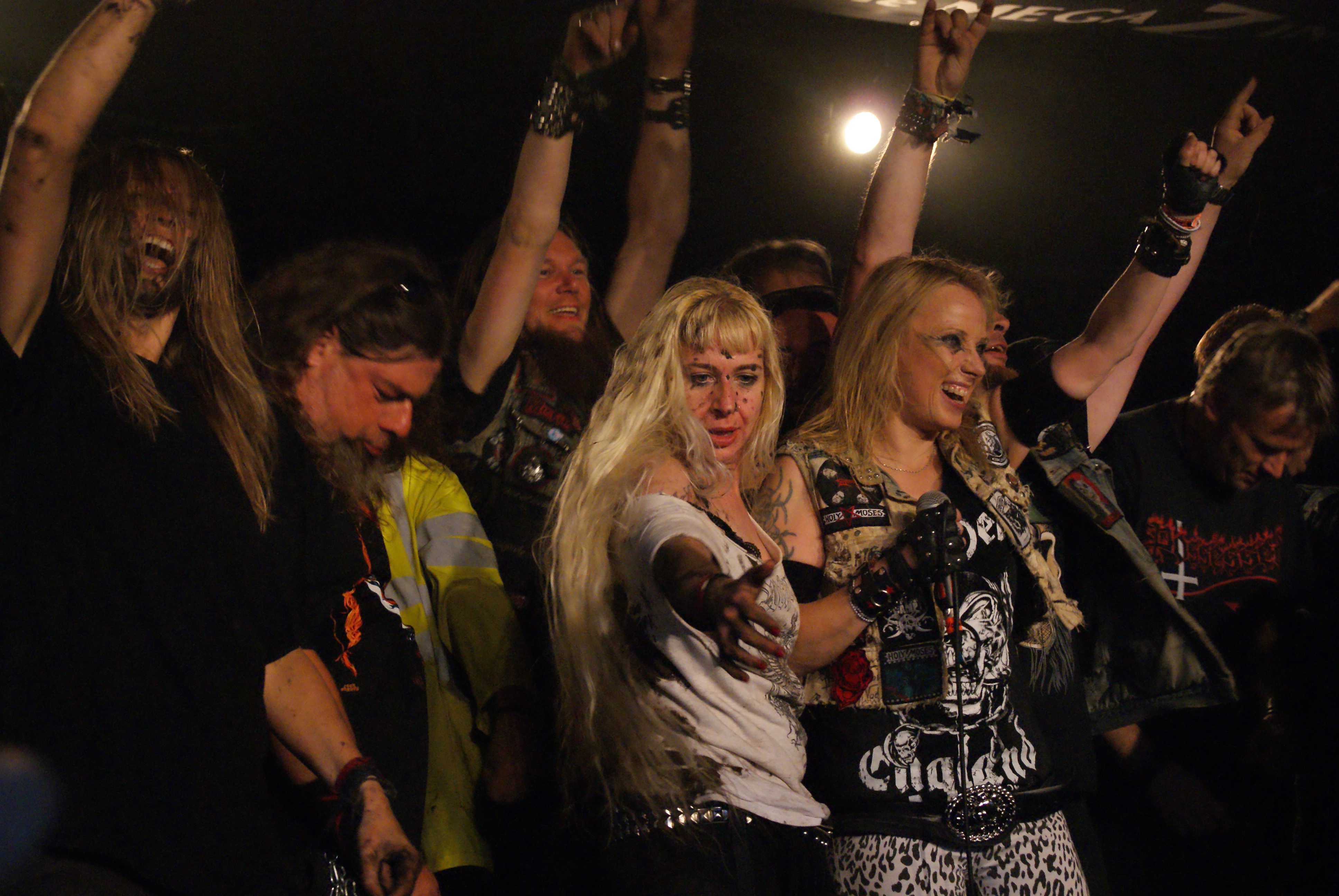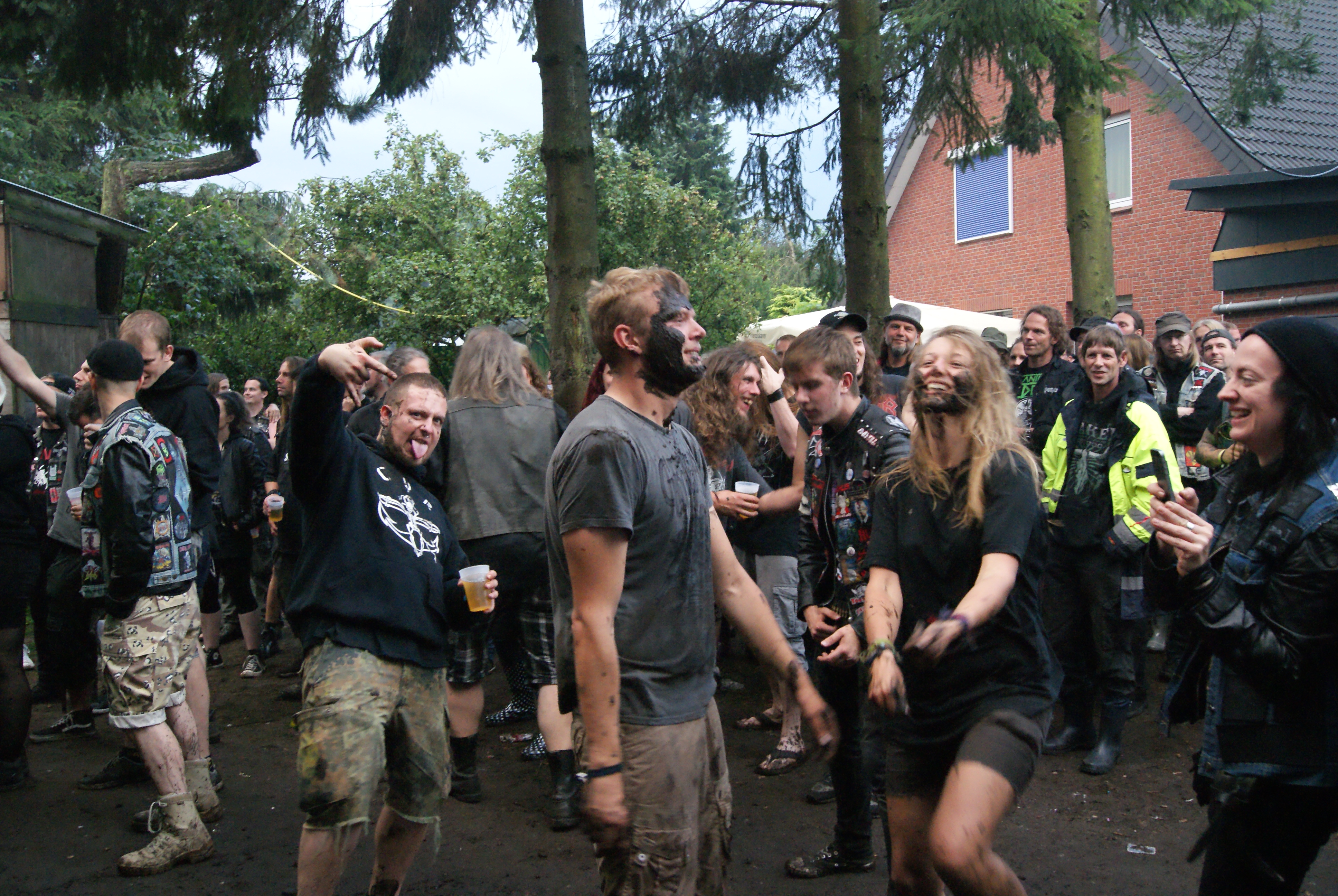 Da der Regen anhielt, traute ich mich erst gegen Ende des HOLY MOSES Gigs wieder aufs Gelände (bin ne Pussy, ich weiß). Auch wenn mich der „Gesang“ von Bandcheffin Sabina Classen immer eher abgeschreckt, denn begeistert hat, muss ich sagen, dass es HOLY MOSES geschafft haben, trotz Wolkenbruch eine beachtliche Anzahl Leute vor die Bühne zu bringen. Welche dann auch ein riesen „Schlammhappening“ daraus machten. Als HOLY MOSES gegen Ende zum schon obligaten DEAD KENNEDYS-Cover „Too Drunk Too Fuck“ diverse Fans zu sich auf die Bühne holten, hatten sie endgültig gewonnen. Absolut ohne Berührungsängste mit den Schlammmonstern brachten HOLY MOSES ihren unter schwierigen Vorzeichen stattfindenden Gig zu einem guten Ende. Als dann Sabina zum Schluss auch noch ins Publikum springt, haben HOLY MOSES dann gewonnen.