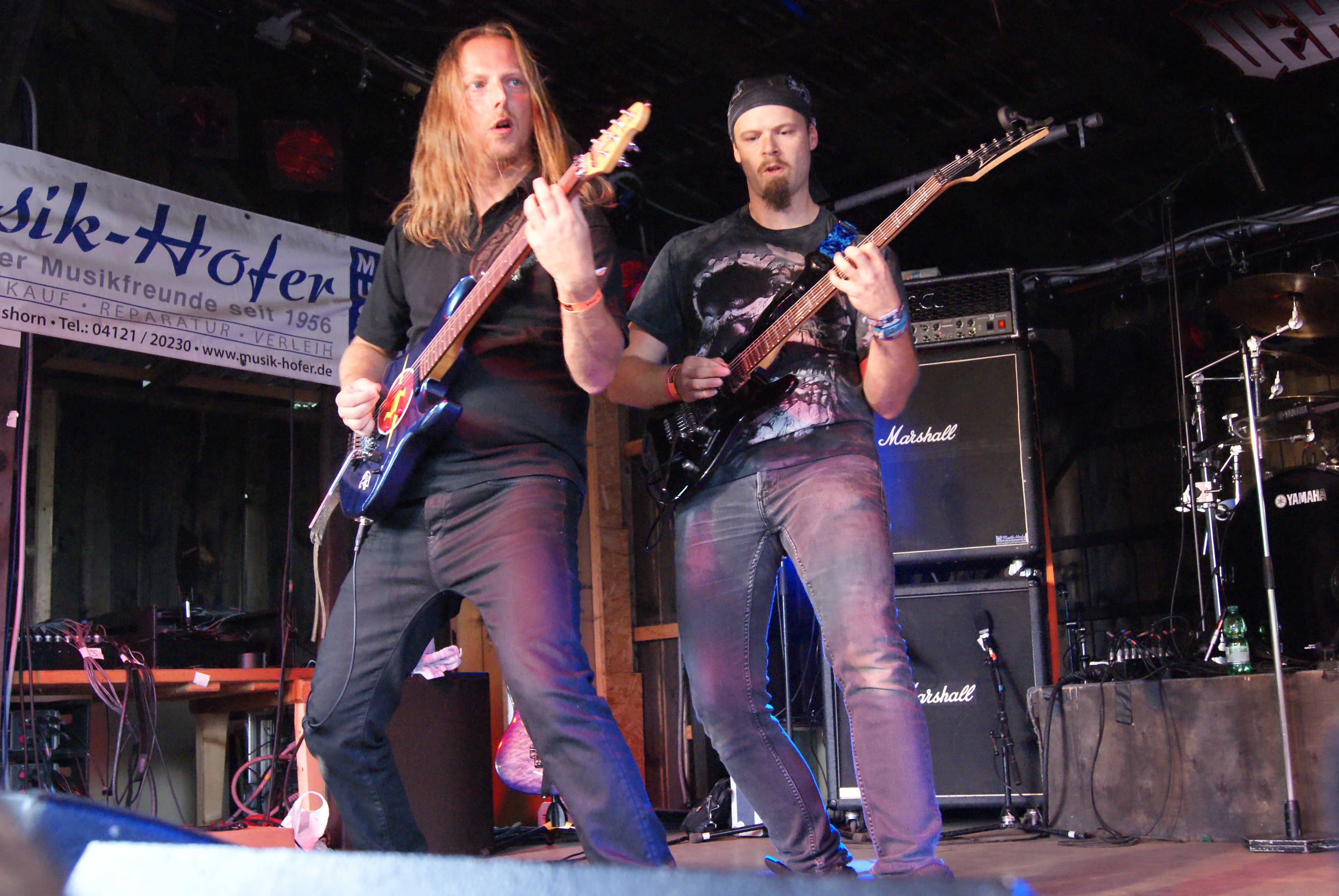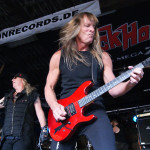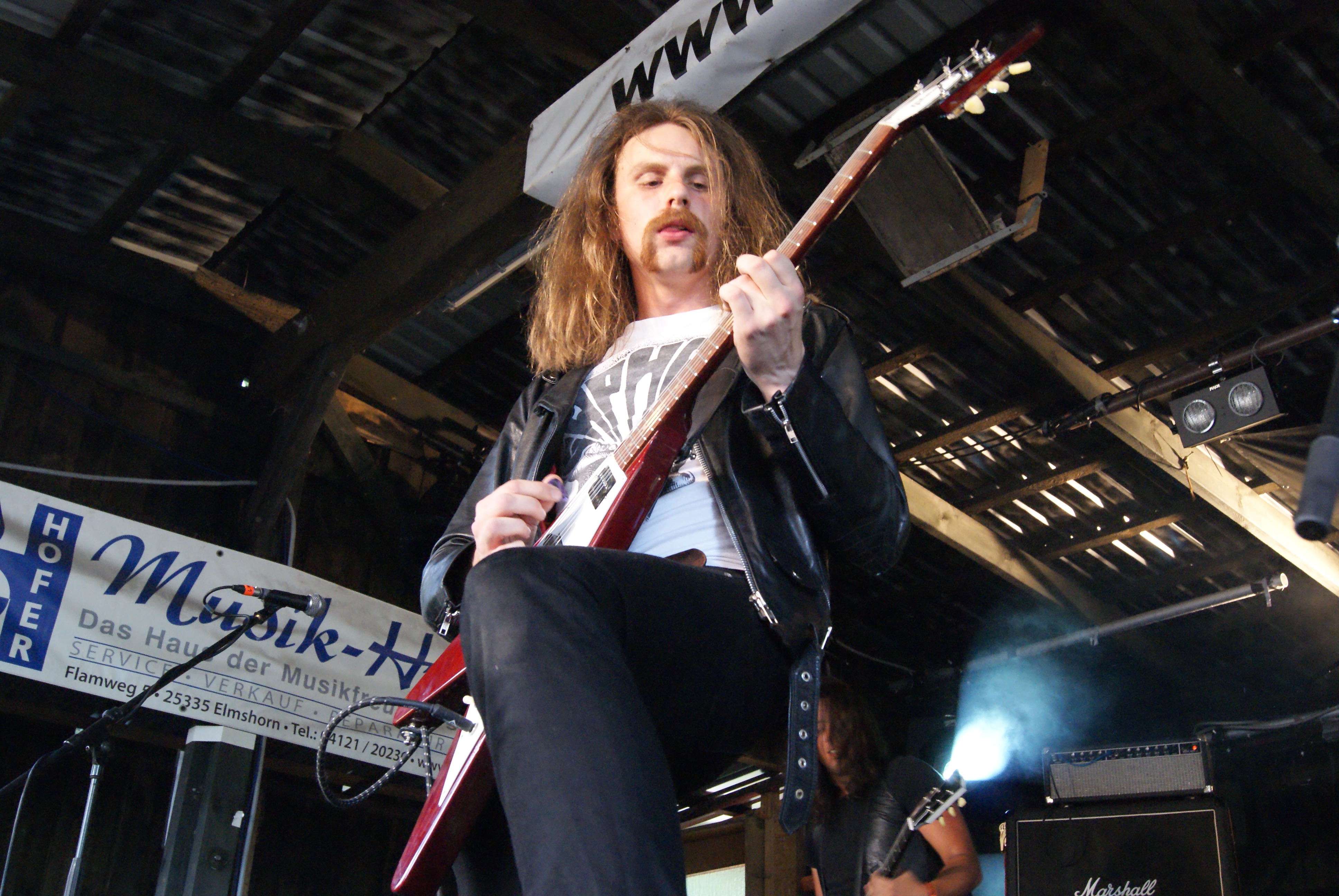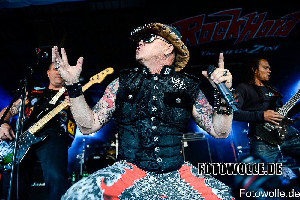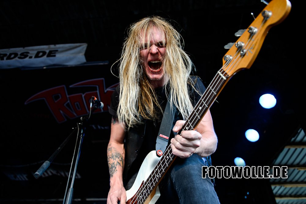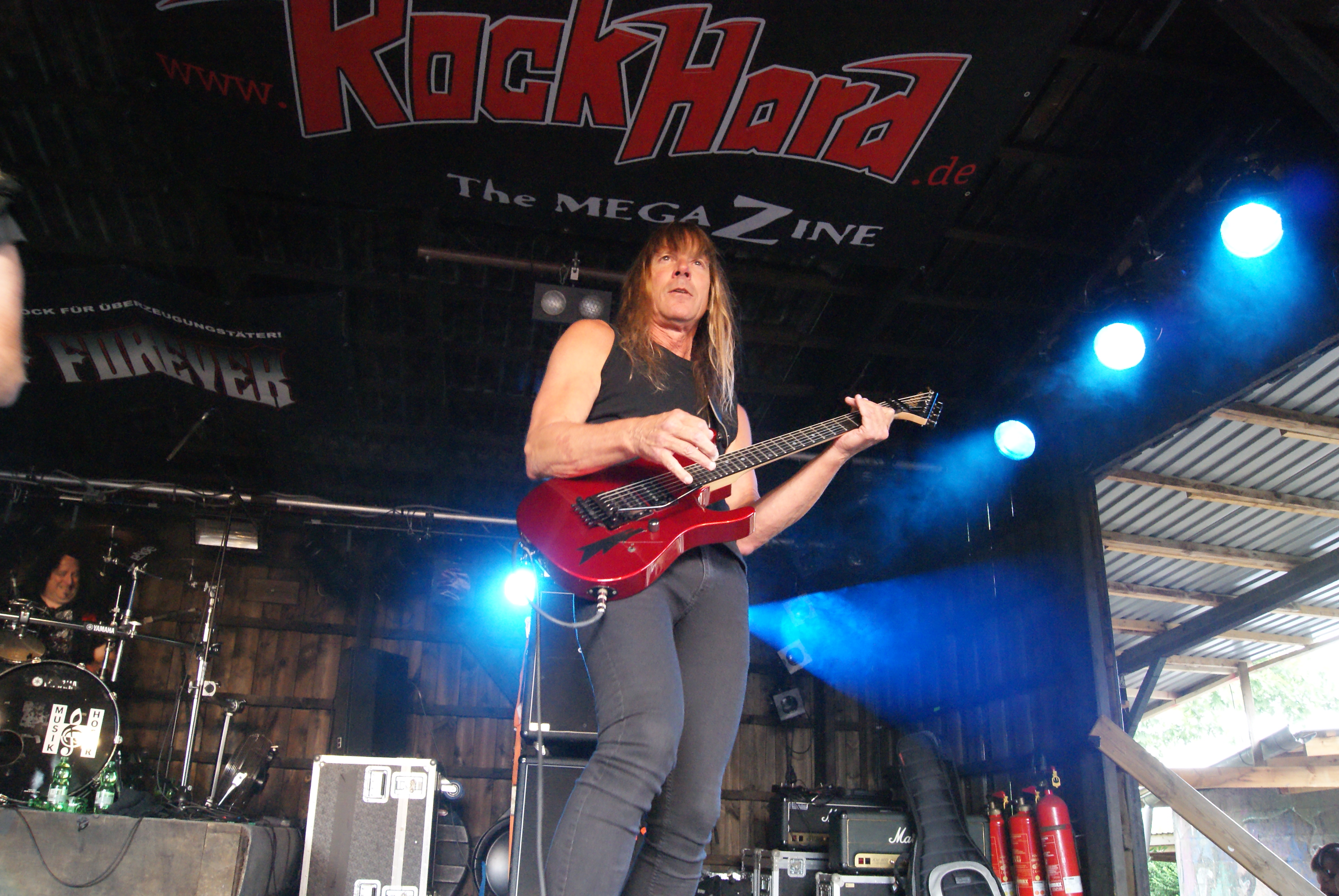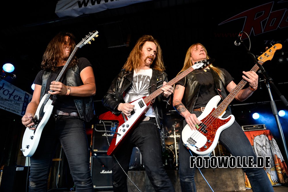 Das Niveau blieb aber hoch. Die Amis Q5 sind ein gerngesehener Gast im Garten zu Brande-Hörnerkirchen. Nach der kurzen (Live-) Reunion von 2009 sind sie jetzt wieder permanent am Start und haben sogar ein neues Album („New World Order“) herausgebracht. Aber der heutige Auftritt stand ganz im Zeichen der Klassiker. „Pull The Trigger“, „Lonely Lady“, „Missing In Action“, „Ain’t No Way To Treat A Lady“, „Teenage Runaway“, „Let Go”. Jonathan Scott K. (welcher offensichtlich den gleichen „Blasenrhythmus” hatte wie ich…zumindest traf ich ihn dauernd auf dem Klo!!) hat kein µ von seiner stimmlichen Brillianz eingebüßt. Und zeigt gerade bei den ruhigeren Stücken eine nicht unbedingt zu erwartende stimmliche Variabilität. So kann er das Reibeisenorgan ab und zu bei Seite legen und bekommt eine schon fast soulige Note in seine Stimme. Begleitet wird er von seinen langjährigen Mitstreitern Rick Pierce (Gitarre) und Evan Sheeley (Bass), welche auch einen sehr energischen Gig auf die Bretter zaubern. Aber auch die beiden „Rookies“ Gitarrist Dennis Turner und Drummer Jeffrey McCormack (Ex-FIFTH ANGEL, Ex-HEIR APPARENT) haben sich perfekt in die Band eingefunden. Die gute Stimmung innerhalb der Band überträgt sich auch sofort auf das Publikum und alle feiern ausgelassen mit Q5. Dass es beim abschließenden Klassiker „Steel The Light“ tatsächlich sehr dunkel wird und es anfängt wie aus Kübeln zu gießen, halte ich dann doch für übertrieben. Darauf angesprochen meinte Evan, dass dieser „Special Effect“ aber verdammt teuer gewesen sei…gerade das Timing sei extrem schwierig. Tolle, sympathische Band. Wir sehen uns 2017 auf dem KIT.