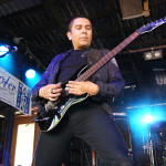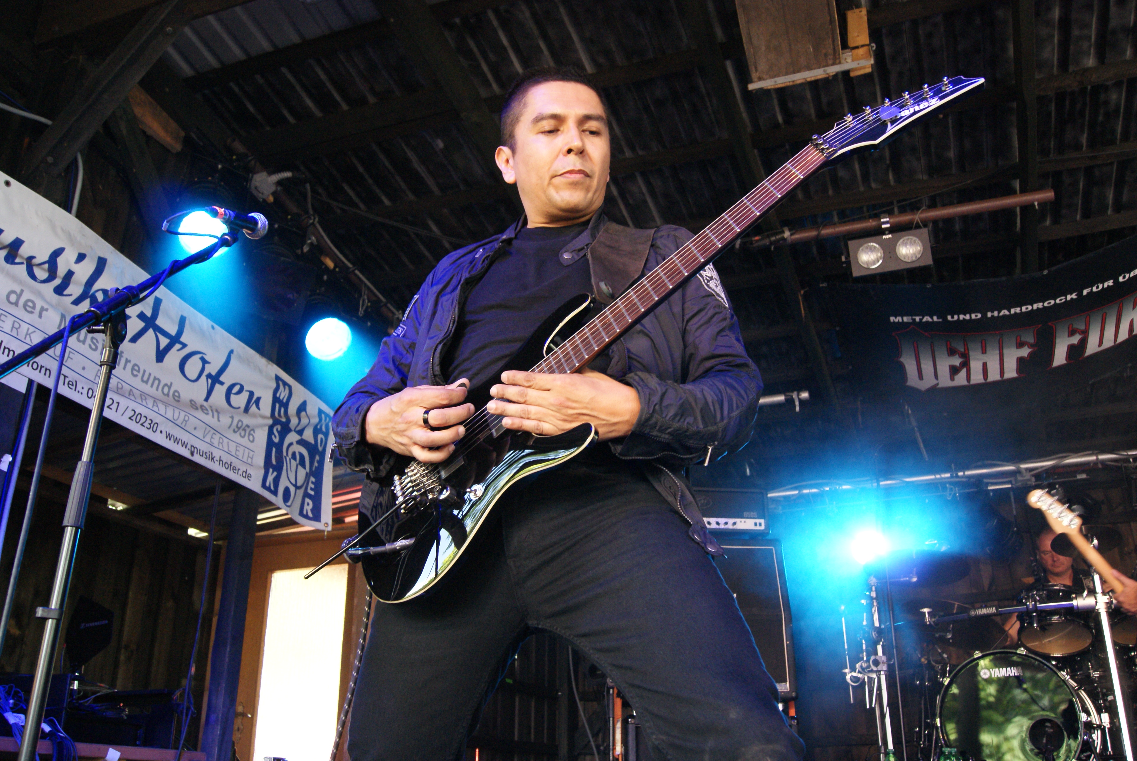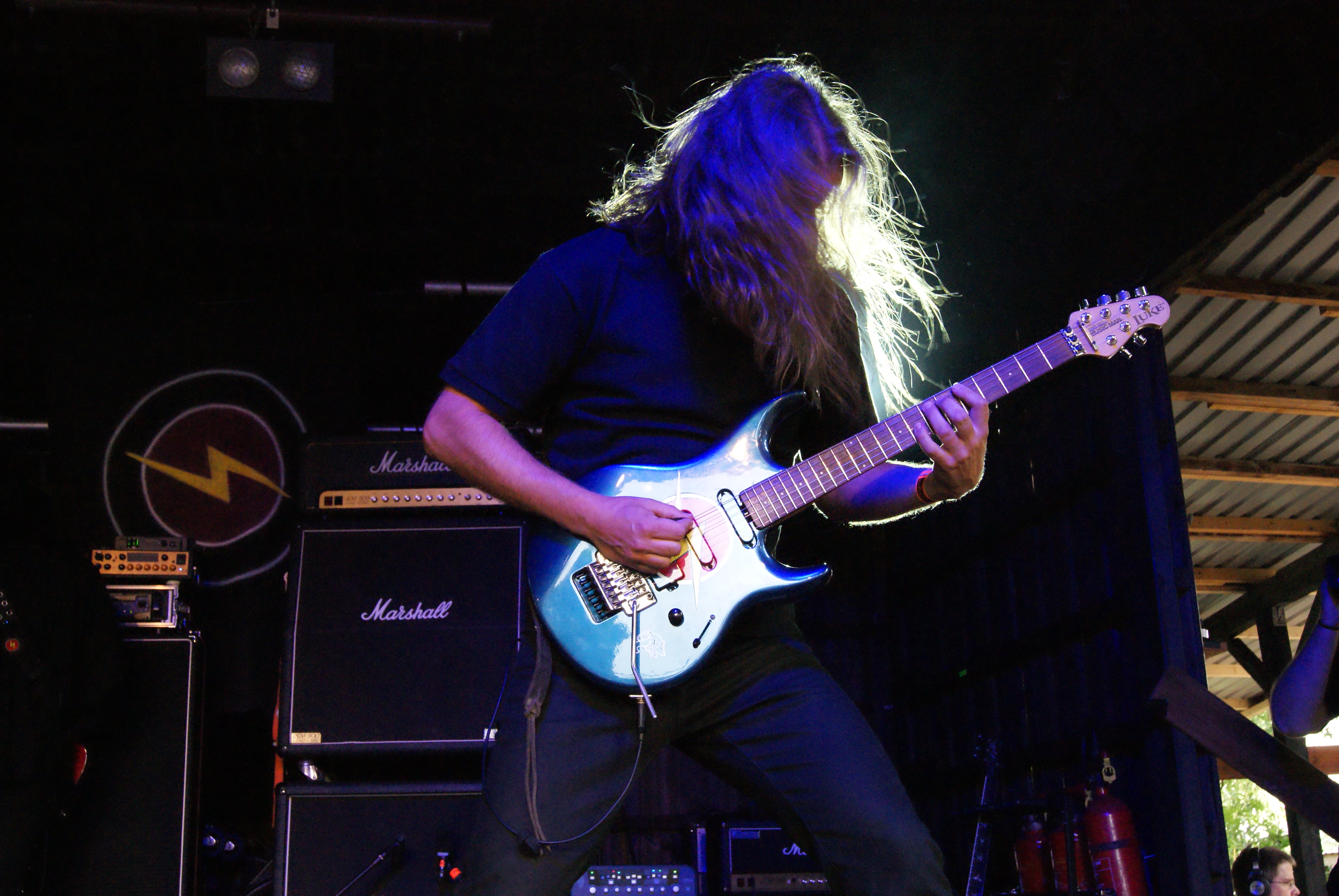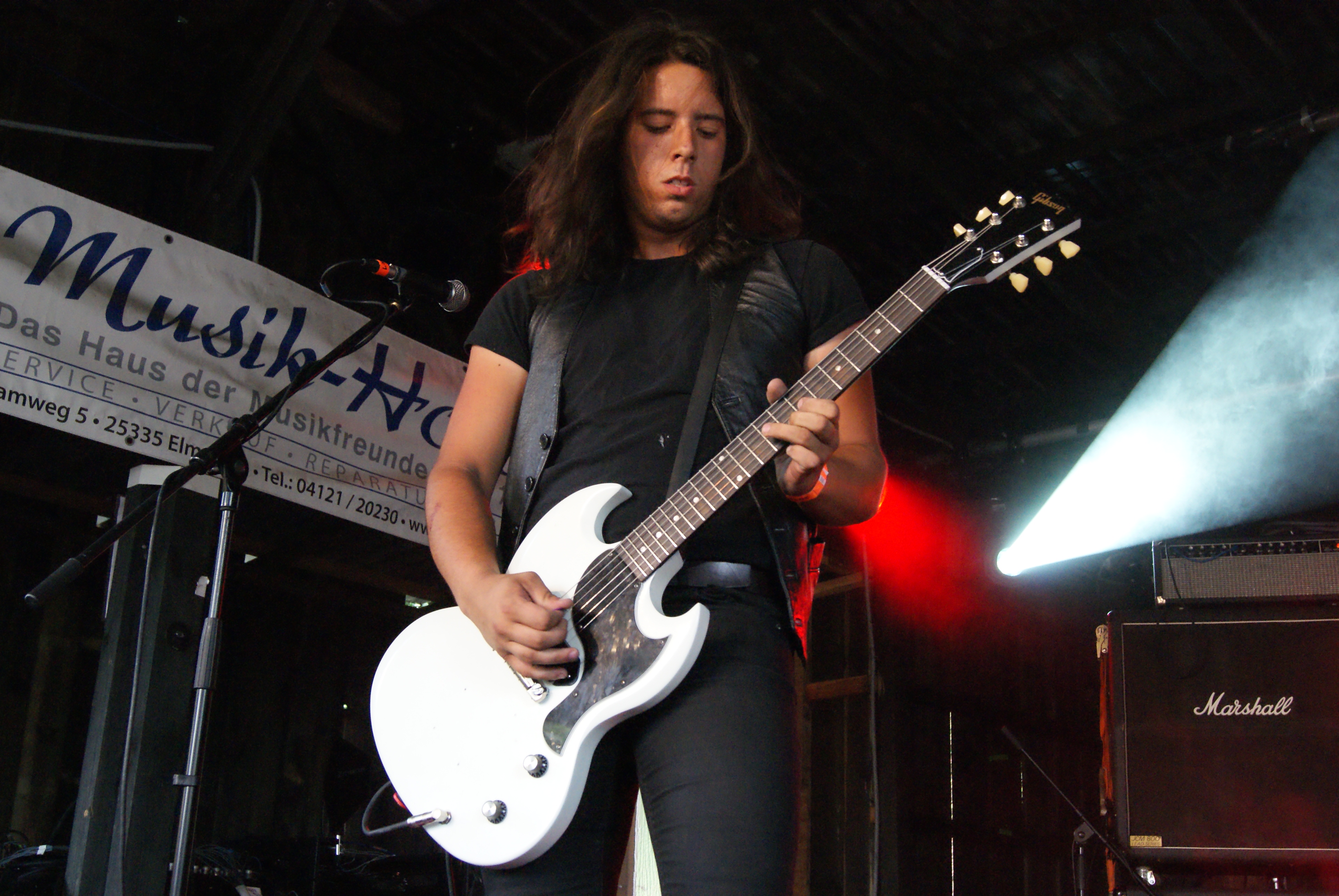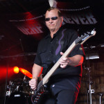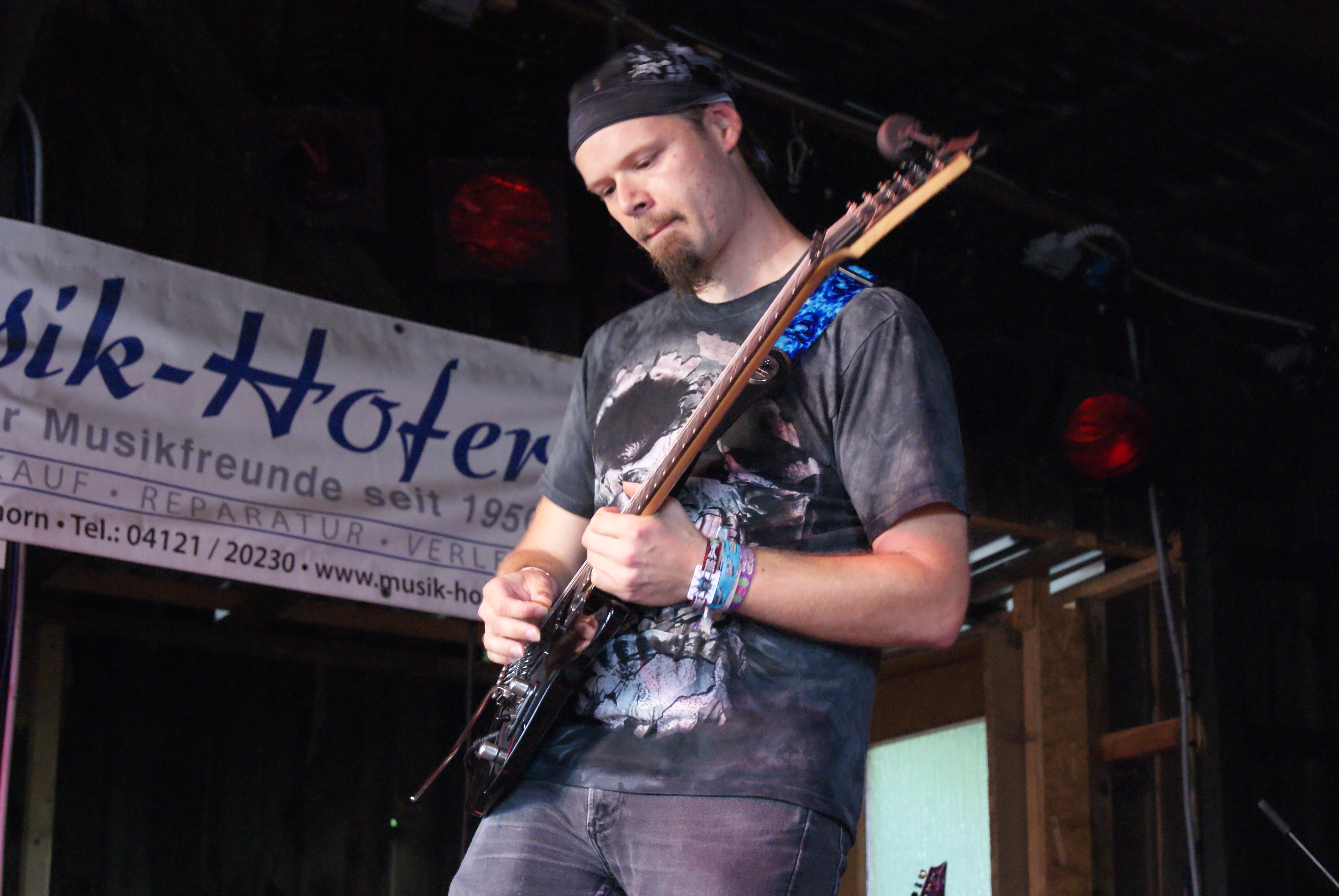 Das Niveau blieb aber hoch. Die Amis Q5 sind ein gerngesehener Gast im Garten zu Brande-Hörnerkirchen. Nach der kurzen (Live-) Reunion von 2009 sind sie jetzt wieder permanent am Start und haben sogar ein neues Album („New World Order“) herausgebracht. Aber der heutige Auftritt stand ganz im Zeichen der Klassiker. „Pull The Trigger“, „Lonely Lady“, „Missing In Action“, „Ain’t No Way To Treat A Lady“, „Teenage Runaway“, „Let Go”. Jonathan Scott K. (welcher offensichtlich den gleichen „Blasenrhythmus” hatte wie ich…zumindest traf ich ihn dauernd auf dem Klo!!) hat kein µ von seiner stimmlichen Brillianz eingebüßt. Und zeigt gerade bei den ruhigeren Stücken eine nicht unbedingt zu erwartende stimmliche Variabilität. So kann er das Reibeisenorgan ab und zu bei Seite legen und bekommt eine schon fast soulige Note in seine Stimme. Begleitet wird er von seinen langjährigen Mitstreitern Rick Pierce (Gitarre) und Evan Sheeley (Bass), welche auch einen sehr energischen Gig auf die Bretter zaubern. Aber auch die beiden „Rookies“ Gitarrist Dennis Turner und Drummer Jeffrey McCormack (Ex-FIFTH ANGEL, Ex-HEIR APPARENT) haben sich perfekt in die Band eingefunden. Die gute Stimmung innerhalb der Band überträgt sich auch sofort auf das Publikum und alle feiern ausgelassen mit Q5. Dass es beim abschließenden Klassiker „Steel The Light“ tatsächlich sehr dunkel wird und es anfängt wie aus Kübeln zu gießen, halte ich dann doch für übertrieben. Darauf angesprochen meinte Evan, dass dieser „Special Effect“ aber verdammt teuer gewesen sei…gerade das Timing sei extrem schwierig. Tolle, sympathische Band. Wir sehen uns 2017 auf dem KIT.