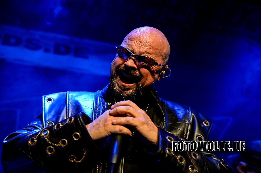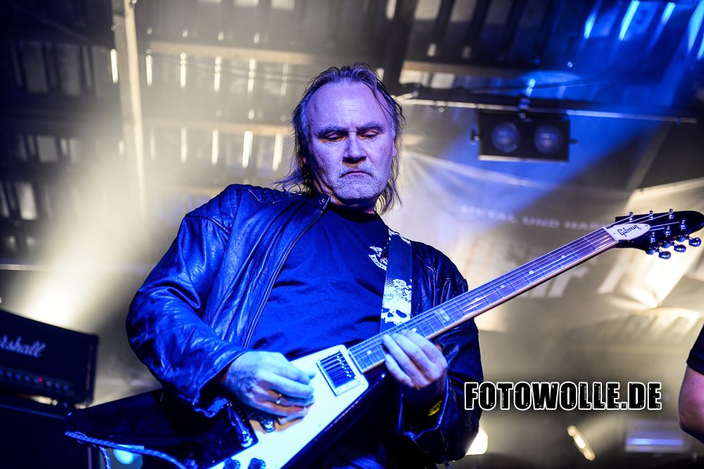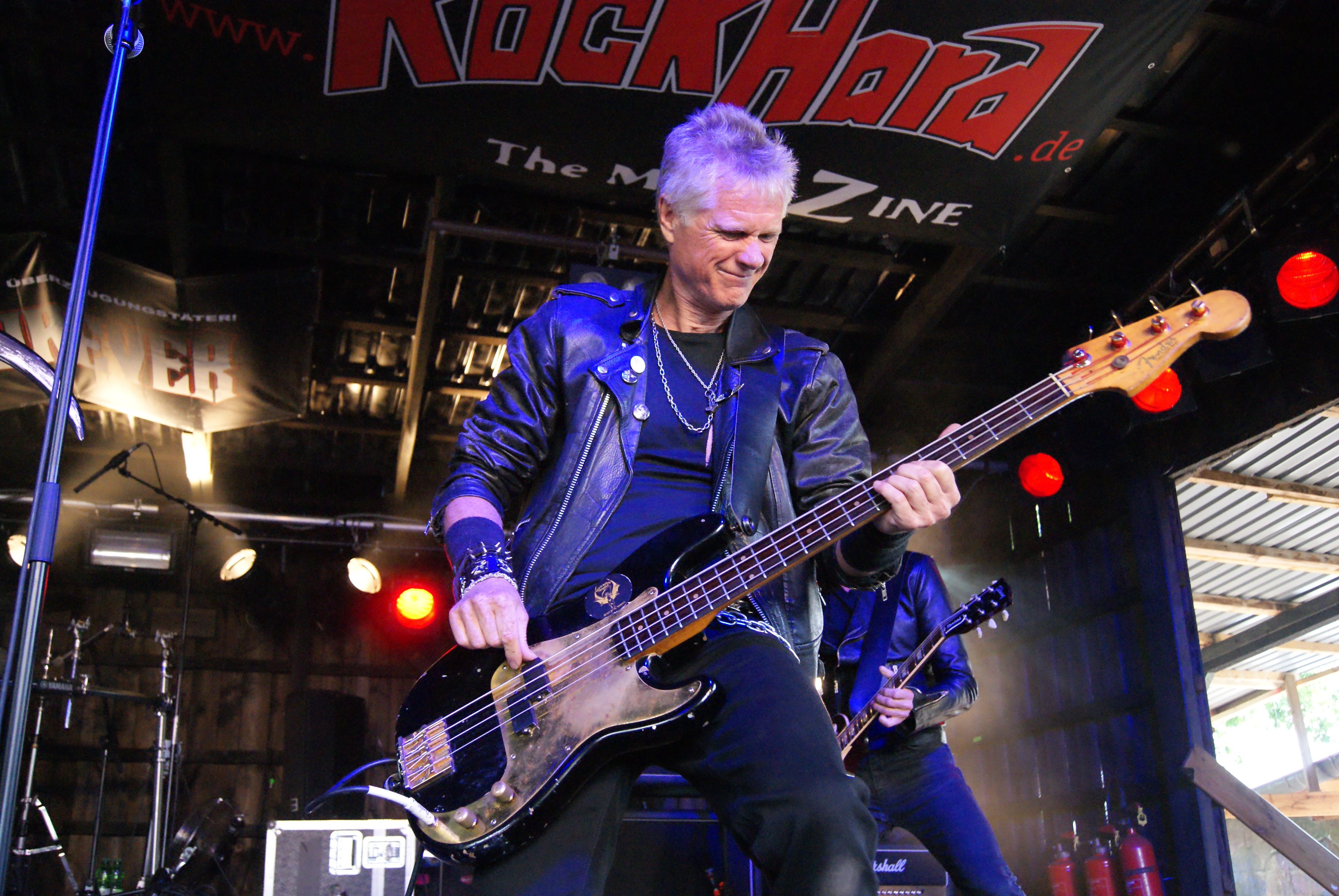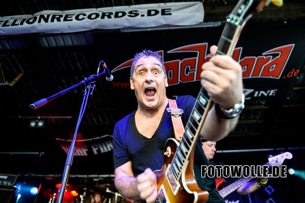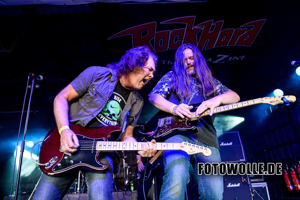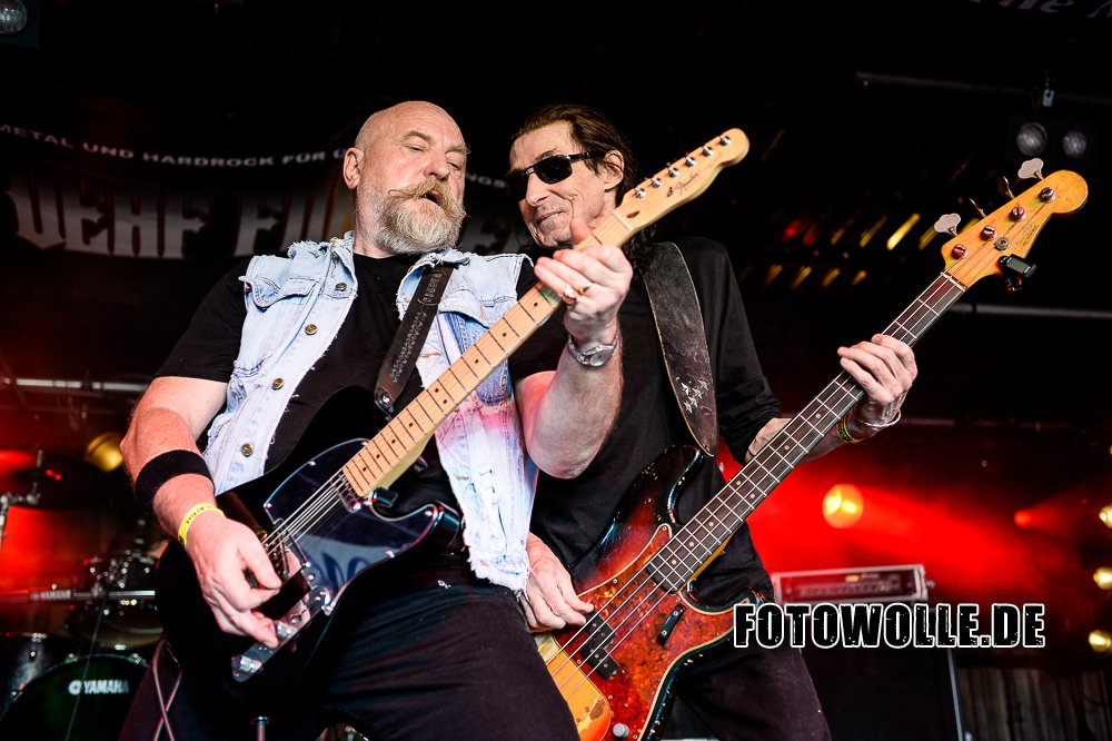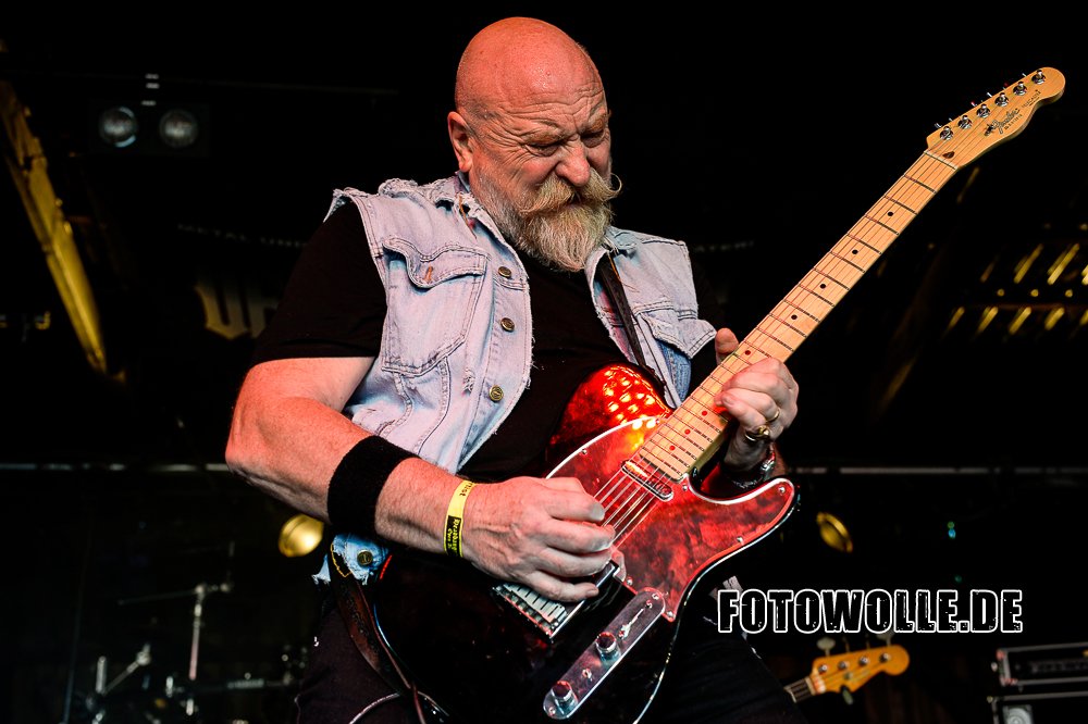 Und so ging es munter weiter: Zuerst mit VARDIS, die tatsächlich noch ein paar Jährchen mehr auf dem Buckel zu haben scheinen als ihre NWoBHM Kollegen des heutigen Tages. Auch wenn Mastermind Steve Zodiac eine runderneuerte Begleitmannschaft im Schlepptau hatte, so bestanden diese augenscheinlich nicht aus Anfängern, sondern hatten auch schon das eine oder andere Jahrzehnt Musikererfahrung. Der Boogie Hard Rock VARDIS‘ war noch nie so ganz mein Ding. War nett anzusehen und wurde auch kompetent dargeboten, nur berühren tut mich das Ganze eher weniger. Alte Songs wie „Move On“ oder „Let Go“ wurden mit neueren Werken wie „Red Eye“ gemixt und der geneigte Laie hörte nicht wirklich einen Unterschied. Alles wirkte wie aus einem Guss und ohne große Brüche. Für Fans sicherlich ein Fest, für mich nette Unterhaltung für zwischendurch.