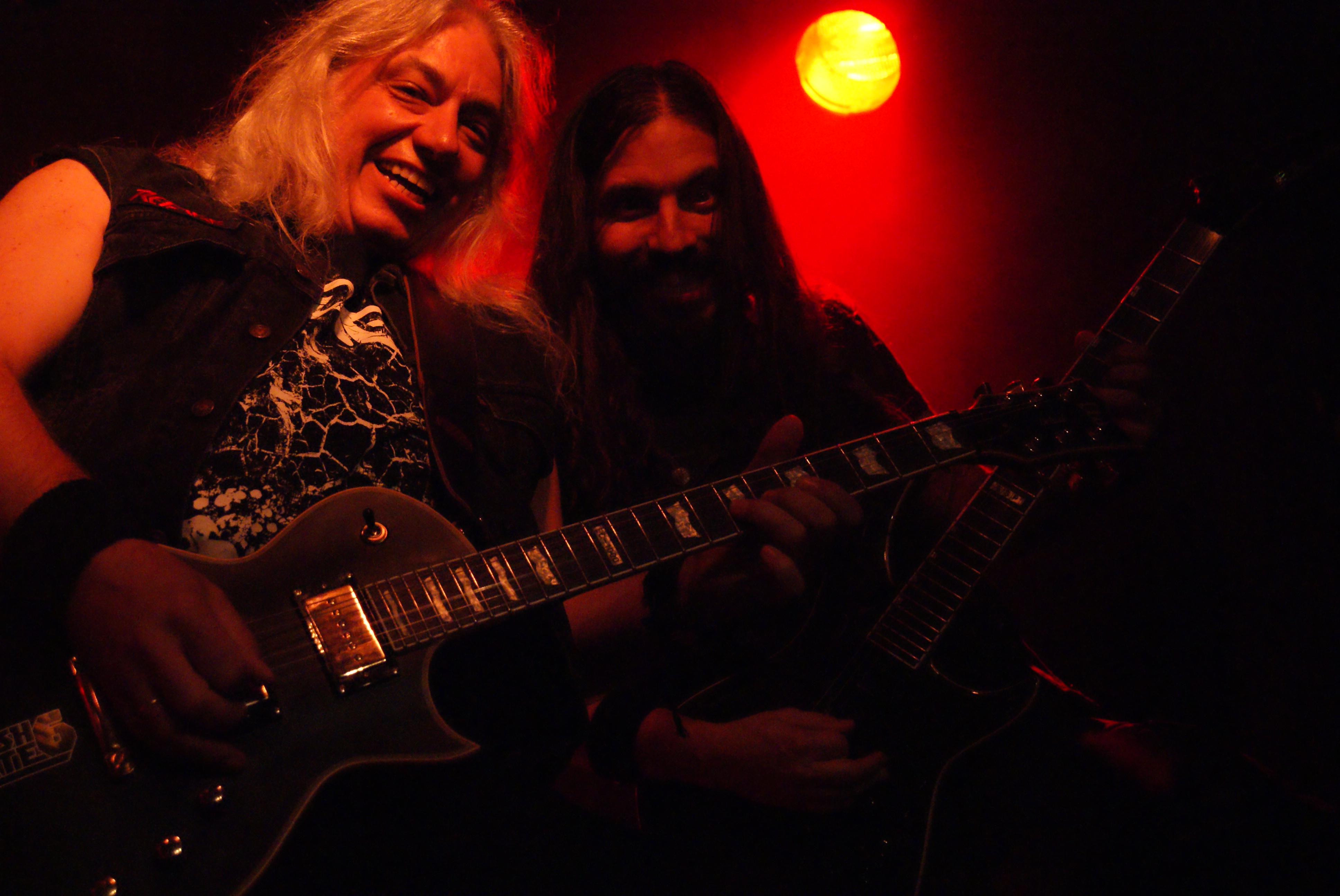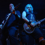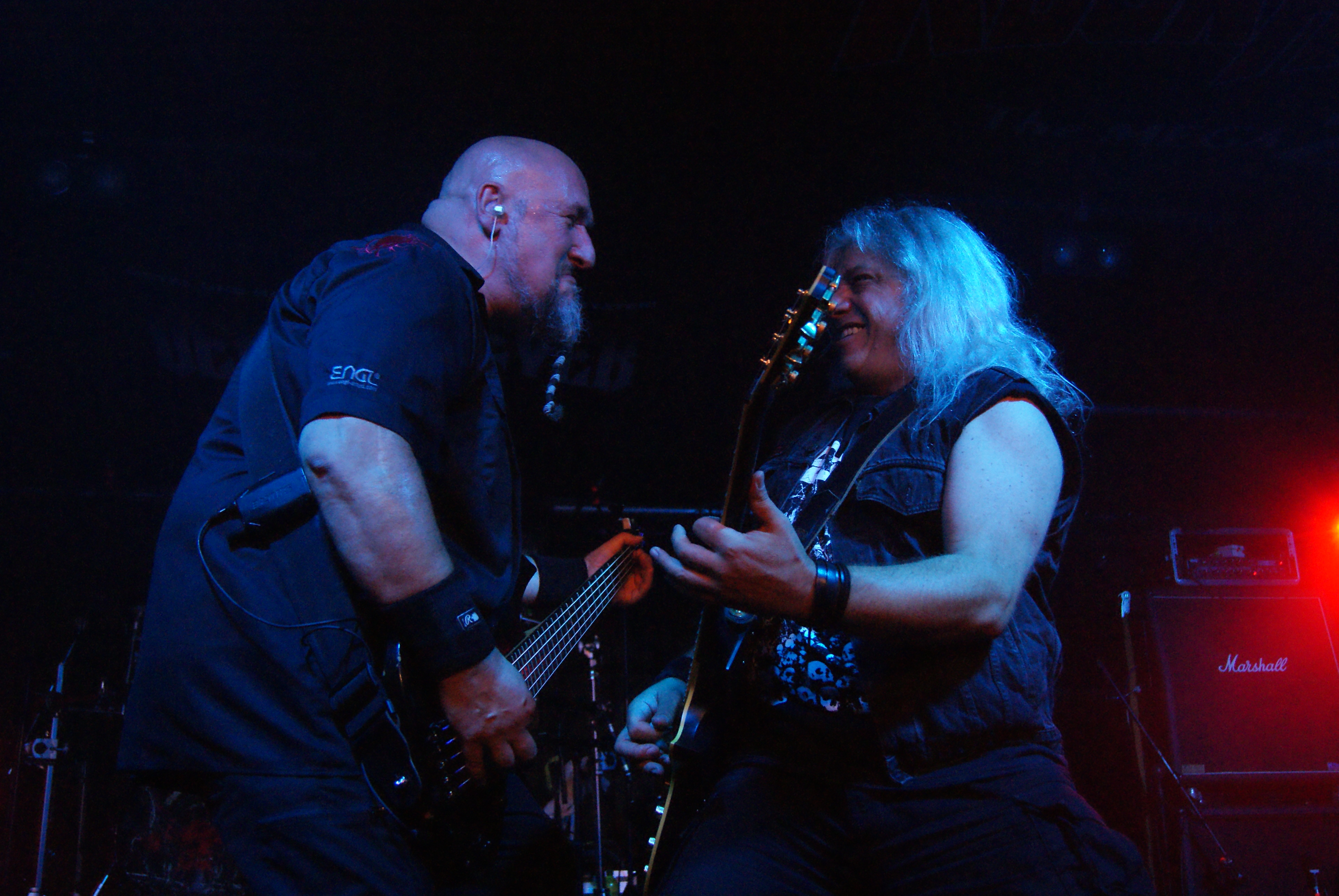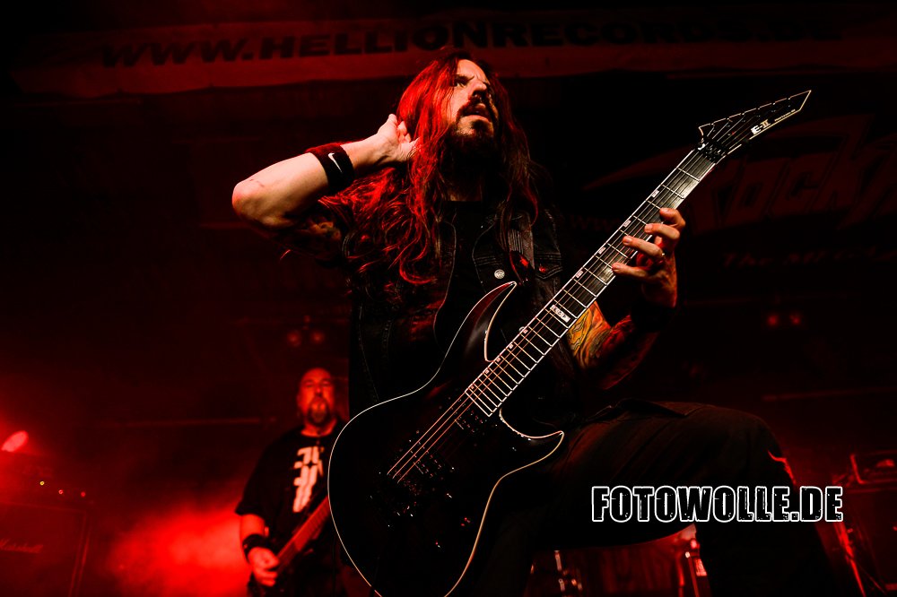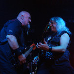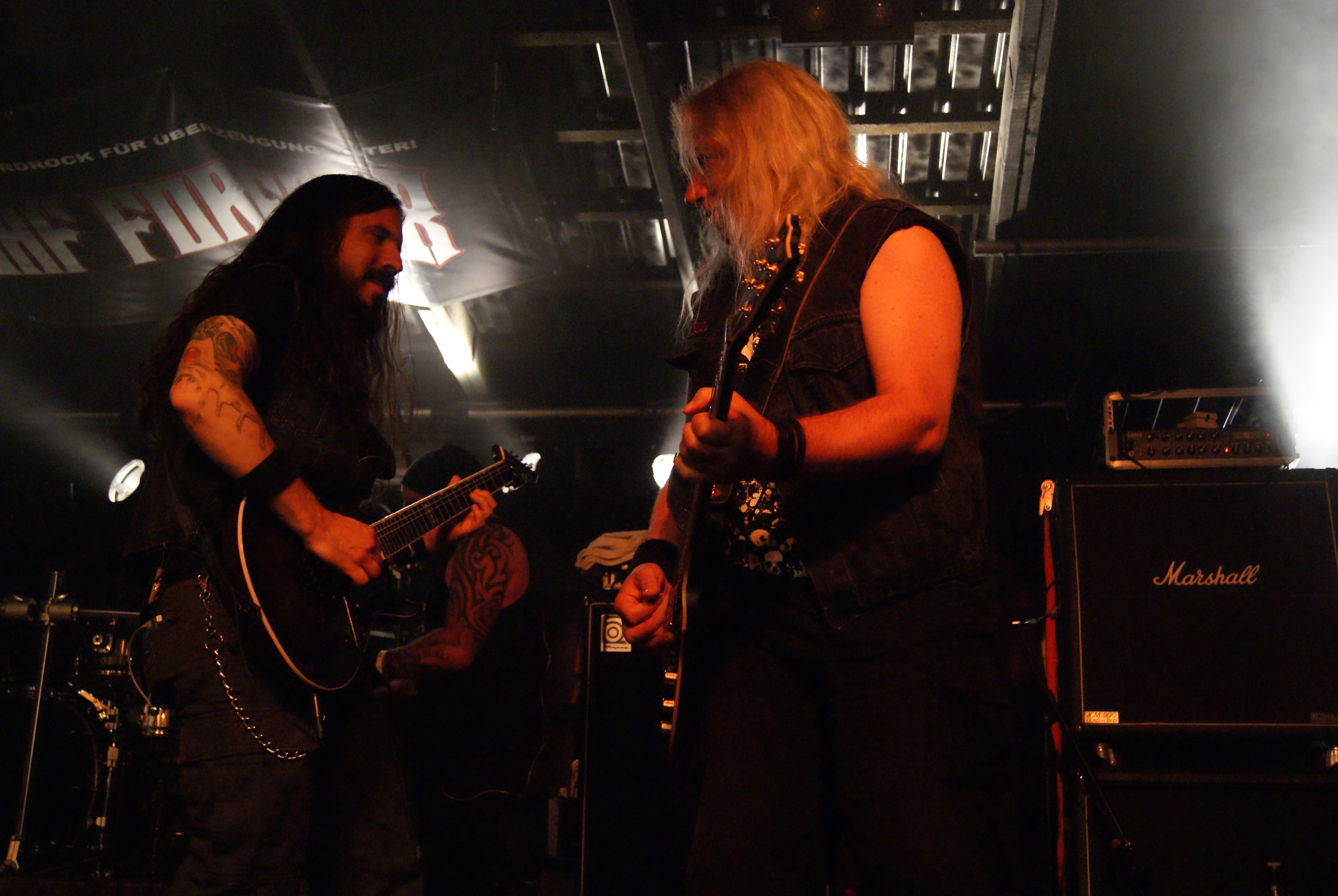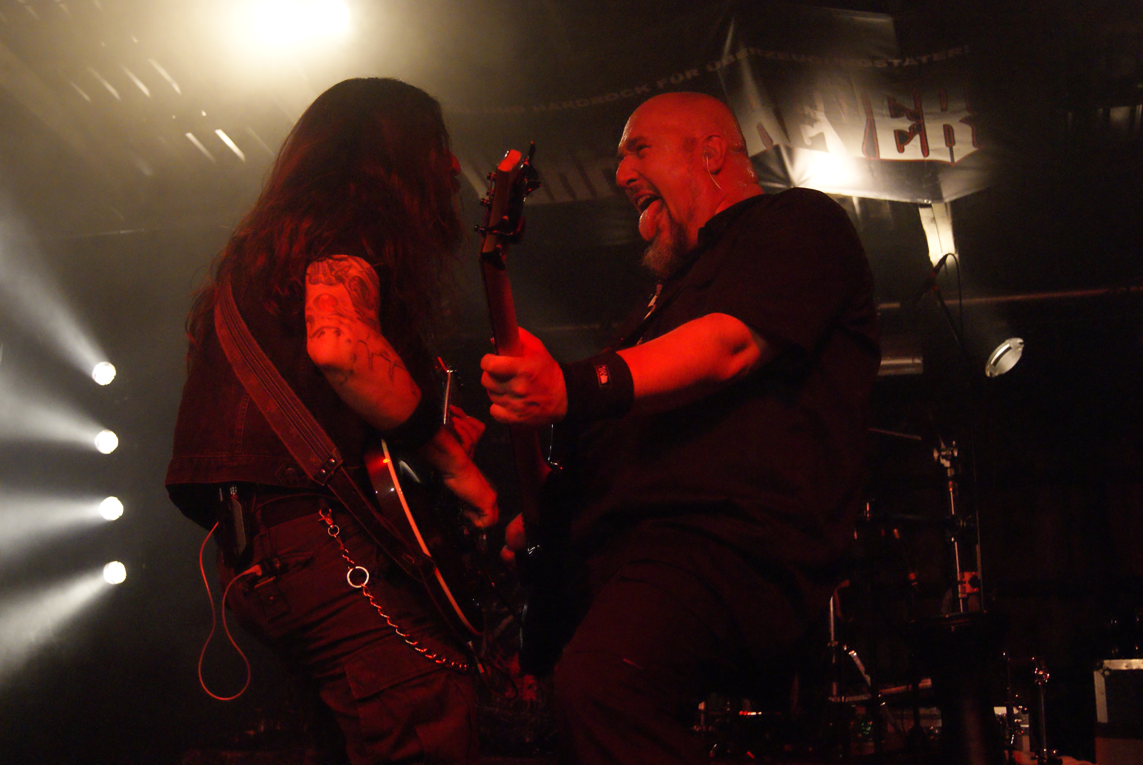 Passend zur einbrechenden Dunkelheit wurde es nun Zeit für das original MERCYFUL FATE Gitarrenduo Michael Denner und Hank Shermann. Gefronted wurde das Ganze von CAGE-Sirene Sean Peck, welcher dieser Tage ein einerseits vielbeschäftigter, aber andererseits auch umstrittener Frontmann ist. Er neigt dazu es mit seinen Screams immer mal wieder zu übertreiben. Und auch heute Abend war es mal wieder hart an der Grenze, auch wenn es natürlich beeindruckend ist, wie hoch der Mann quietschen kann. Albern jedoch war das Getue mit seinem ultrafetten Ledermantel. Obwohl ihm offensichtlich viel zu warm war, zog er das hässliche Ding nicht aus, sondern lüftete es alle 30 Sekunden nur und wirkte damit wie ein alternder Exhibitionist im Offenbacher Stadtpark. Mit „Evil“, „Curse Of The Pharaos“, „Black Funeral“ und „Desecration Of Souls“ kamen zwar auch 4 MERCYFUL FATE Kracher zum Zuge, richtige Begeisterung ließ sich aber nicht ausmachen. Irgendwie hatte man das Gefühl, dass da jeder auf der Bühne sein eigenes Süppchen kochte. Als Einheit waren DENNER / SHERMANN nicht wahrnehmbar. Dazu kamen auch technische Unzulänglichkeiten (der Drummer hatte wohl erst kurz vorher Snowy Shaw ersetzt), sodass Songs teilweise abgebrochen und neu angefangen werden mussten. Gerade Denner wirkte mitunter richtig genervt. Das letzte, was man noch von der Bühne vernahm, war ein „Can’t play with you anymore, guys“. Bin mal gespannt, wie und ob das überhaupt weitergeht. Allerdings macht das in meinen Augen so auch keinen Sinn. Hatte ich mir durchaus mehr von versprochen.