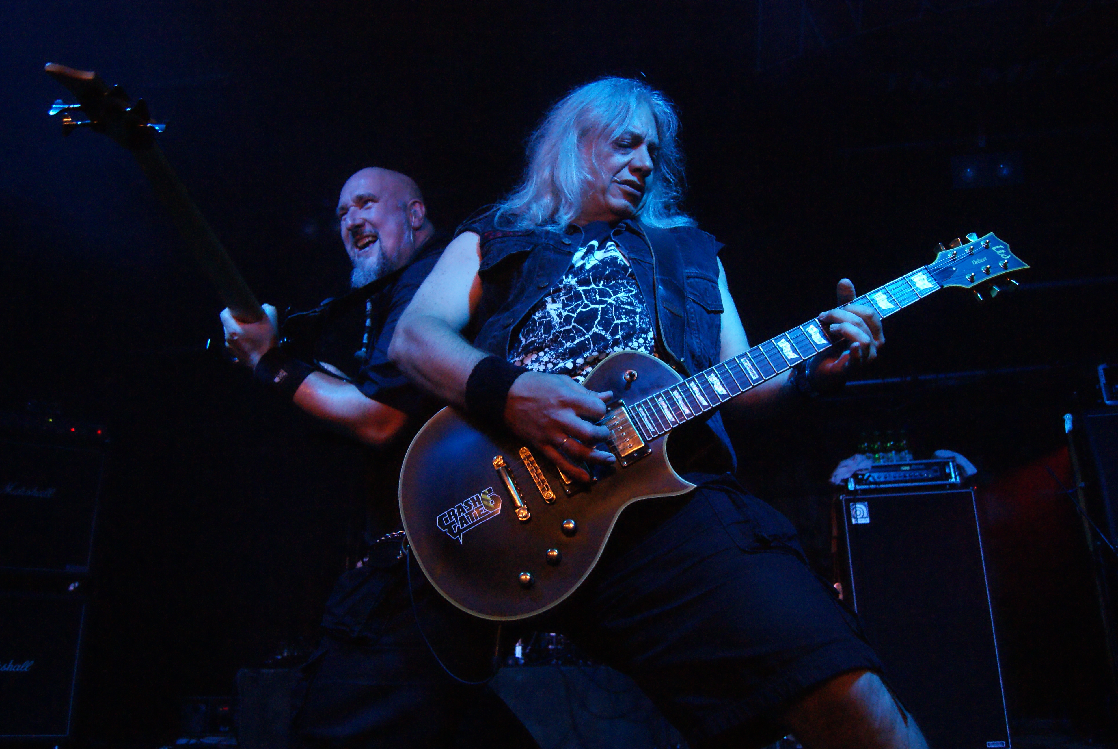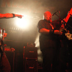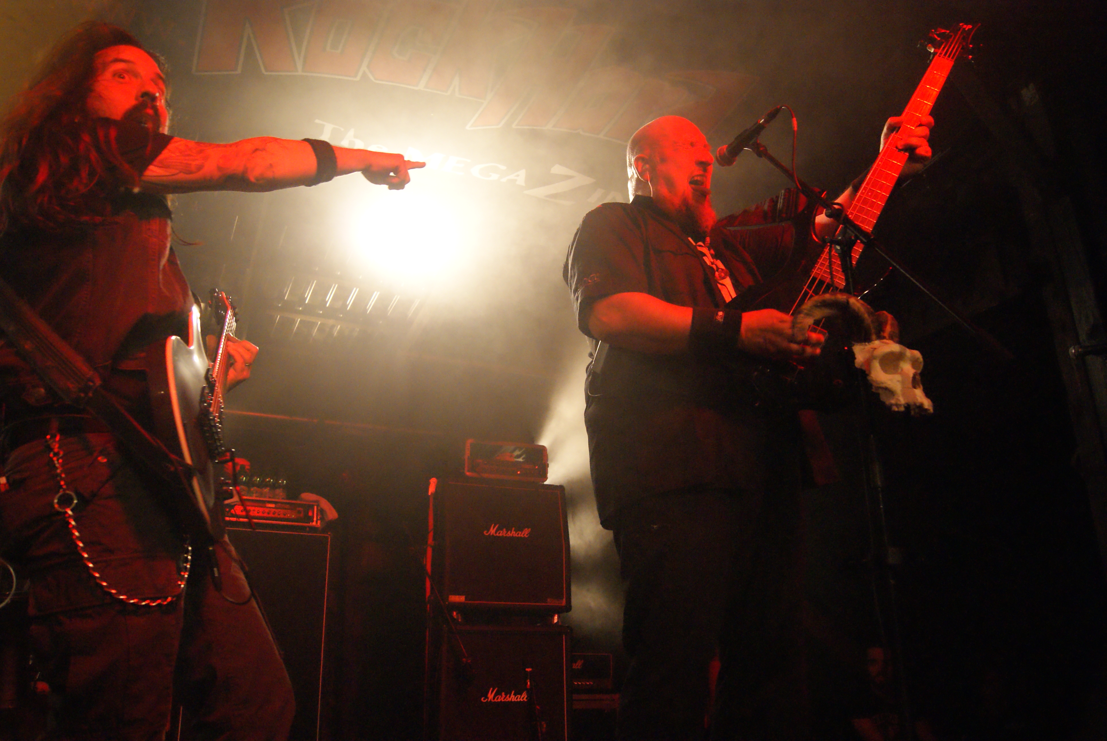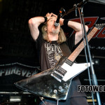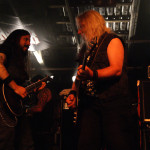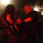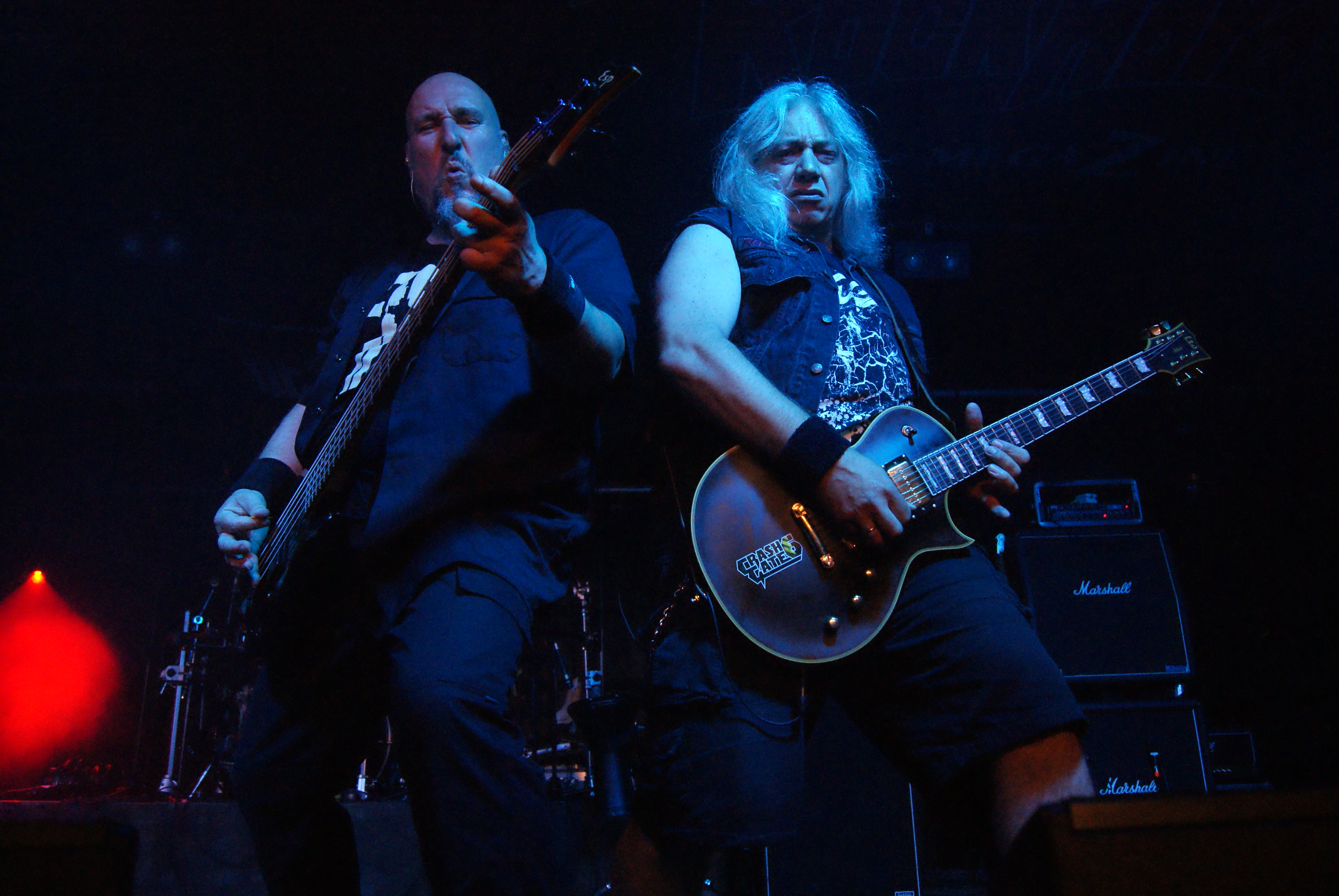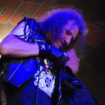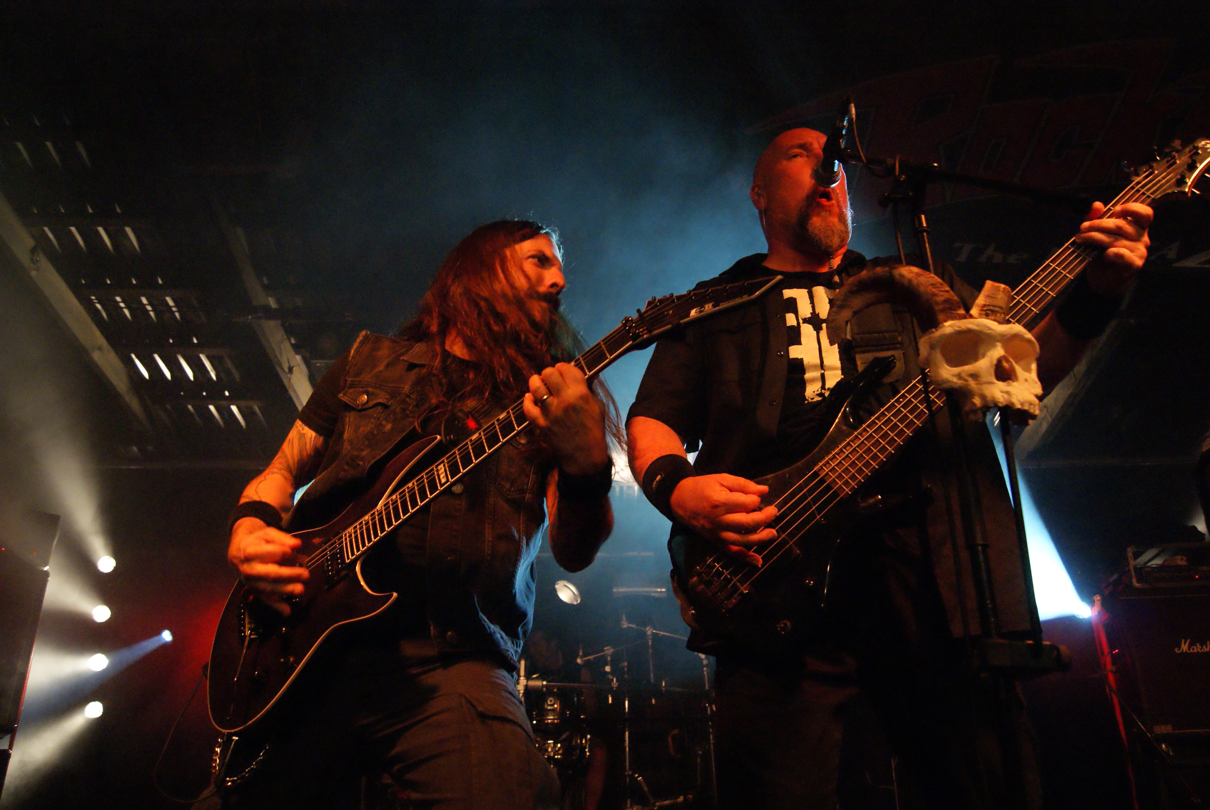 Passend zur einbrechenden Dunkelheit wurde es nun Zeit für das original MERCYFUL FATE Gitarrenduo Michael Denner und Hank Shermann. Gefronted wurde das Ganze von CAGE-Sirene Sean Peck, welcher dieser Tage ein einerseits vielbeschäftigter, aber andererseits auch umstrittener Frontmann ist. Er neigt dazu es mit seinen Screams immer mal wieder zu übertreiben. Und auch heute Abend war es mal wieder hart an der Grenze, auch wenn es natürlich beeindruckend ist, wie hoch der Mann quietschen kann. Albern jedoch war das Getue mit seinem ultrafetten Ledermantel. Obwohl ihm offensichtlich viel zu warm war, zog er das hässliche Ding nicht aus, sondern lüftete es alle 30 Sekunden nur und wirkte damit wie ein alternder Exhibitionist im Offenbacher Stadtpark. Mit „Evil“, „Curse Of The Pharaos“, „Black Funeral“ und „Desecration Of Souls“ kamen zwar auch 4 MERCYFUL FATE Kracher zum Zuge, richtige Begeisterung ließ sich aber nicht ausmachen. Irgendwie hatte man das Gefühl, dass da jeder auf der Bühne sein eigenes Süppchen kochte. Als Einheit waren DENNER / SHERMANN nicht wahrnehmbar. Dazu kamen auch technische Unzulänglichkeiten (der Drummer hatte wohl erst kurz vorher Snowy Shaw ersetzt), sodass Songs teilweise abgebrochen und neu angefangen werden mussten. Gerade Denner wirkte mitunter richtig genervt. Das letzte, was man noch von der Bühne vernahm, war ein „Can’t play with you anymore, guys“. Bin mal gespannt, wie und ob das überhaupt weitergeht. Allerdings macht das in meinen Augen so auch keinen Sinn. Hatte ich mir durchaus mehr von versprochen.