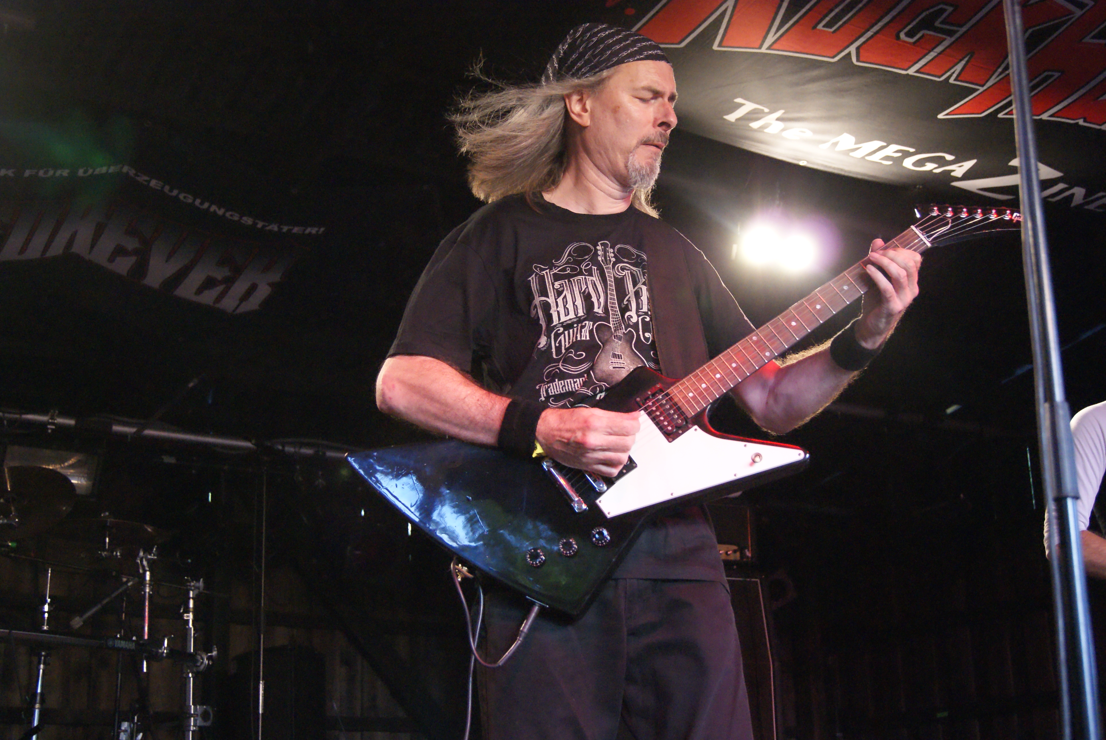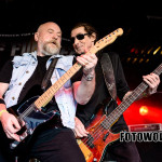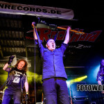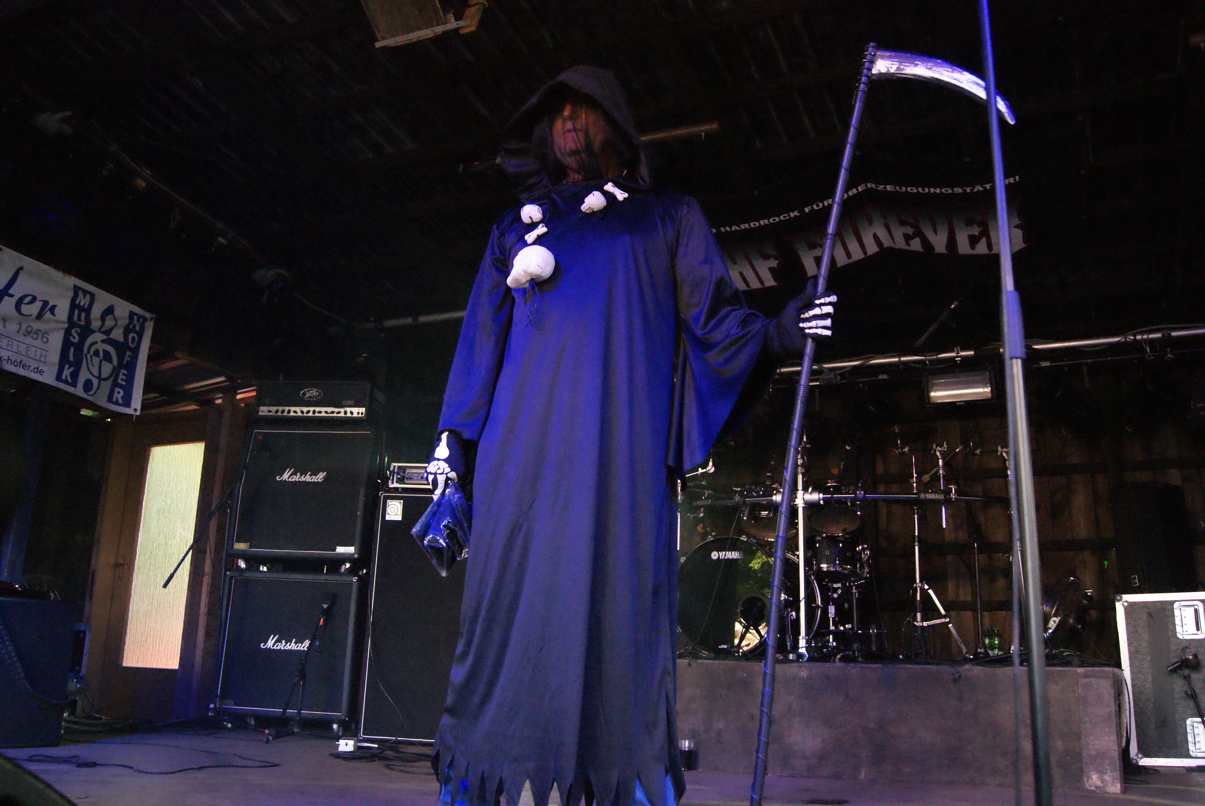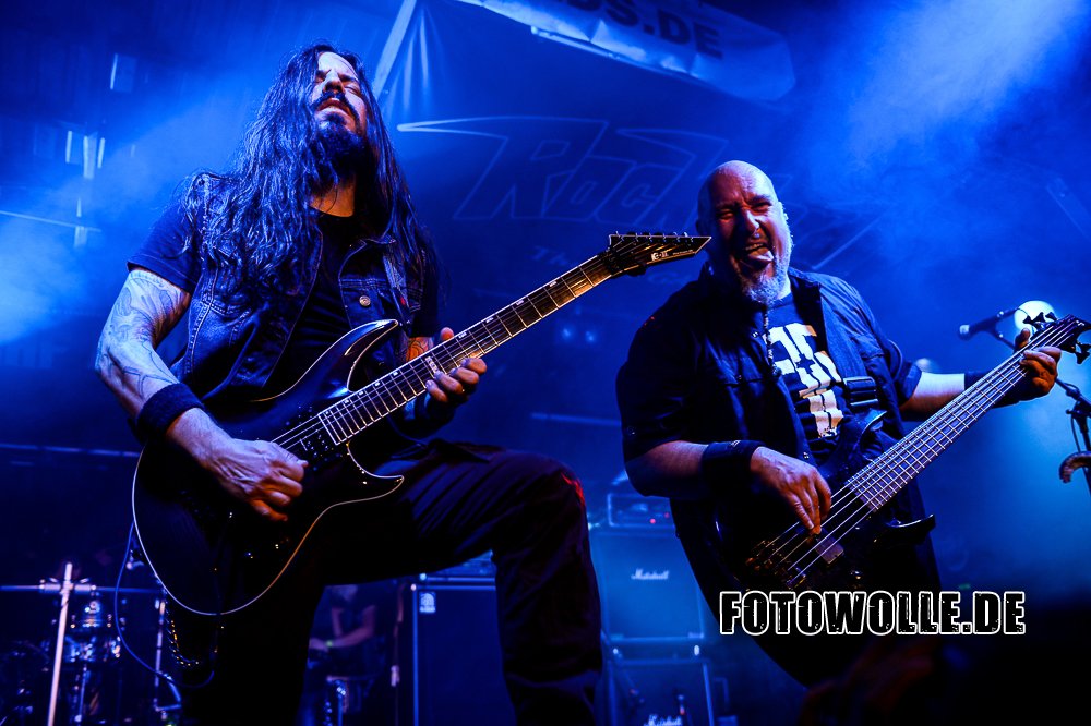 Nun wurde es aber Zeit für den Headliner der diesjährigen Ausgabe des Headbangers Open Airs. Mit RAGE meeting REFUGE hatten sich die Veranstalter etwas Besonderes ausgedacht. Die neuen RAGE und die klassische 88-93 Besetzung auf einer Bühne. Spannung garantiert. Los ging es mit der aktuellen RAGE Besetzung, der neben Cheffe Peavy auch der neue Drummer Vassilios Maniatopoulos und der Gitarrist Marcos Rodriguez angehören. Gerade letzterer erweist sich als absoluter Gewinn für RAGE. Kein selbstverliebter Techniker wie Smolski, sondern ein megasympathischer Metalhead mit extrem viel Spaß in den Backen. Neben seinen Vorzügen als Gitarrist und Perfomer ist er auch noch ein toller Sänger, wie er später als DIO-Imitator beweisen sollte. RAGE beschränken sich auf ganz neue Stücke wie „Spirits Of The Night“ und „The Devil Strikes Again“ sowie Songs aus den Mid-90ern wie „Back In Time“, „Days Of December“ und die beiden mich eher überraschenden „End Of All Days“ und das speedige „Until I Die“. Gerade letzteres war schon mal richtig fett. Zu den Klängen von „Shame On You“ gesellten sich dann die alten Hasen Manni Schmidt und Chris Efthimiadis zu RAGE auf die Bühne und man performte den Song gemeinsam. Es war echt schön zu sehen, mit welchem väterlichen Stolz Manni und Peavy Marcos beim abrocken auf der Bühne zusahen. Von Neid und Konkurrenzdenken war nichts zu spüren. Danach machten die Neuen endgültig Platz für die alte Garde und die hämmerte sich mit viel Enthusiasmus durch den RAGE-Classix Katalog. „The Missing Link“, „The Body Talks“, „Solitary Man“, „Nevermore“, „Power And Greed“, „Enough Is Enough“, „Firestorm”, „Invisible Horizons”, „Refuge” und „Don’t Fear The Winter”. Ich war wieder 15 und absolut selig. Das Manni Schmidt Riffing ist immer noch einzigartig, Peavy’s Vocals sitzen und Efthi sorgt mit seinem Powerpunch für den nötigen Druck. REFUGE sind einfach die professionellste Hobby-Band der Welt. Großes Kino. Für den gelungenen Abschluss sorgt dann ein wiederum von allen sechs Musikern dargebotenes „Higher Than The Sky“. Ein Ausdruck für die gute Stimmung und die Gelassenheit der Musiker war eine Situation kurz vor Ende: Scheinbar gab es schon den ganzen Abend Probleme mit dem Monitorsound, als dieser vor „Higher Than The Sky“ komplett abrauchte und die örtliche Crew verzweifelt versuchte, das irgendwie noch hinzubekommen, meinte Peavy nur gelassen: „Vergesst es, is‘ nur noch ein Song und den bekommen wir auch so hin!“ Megasympathisch.