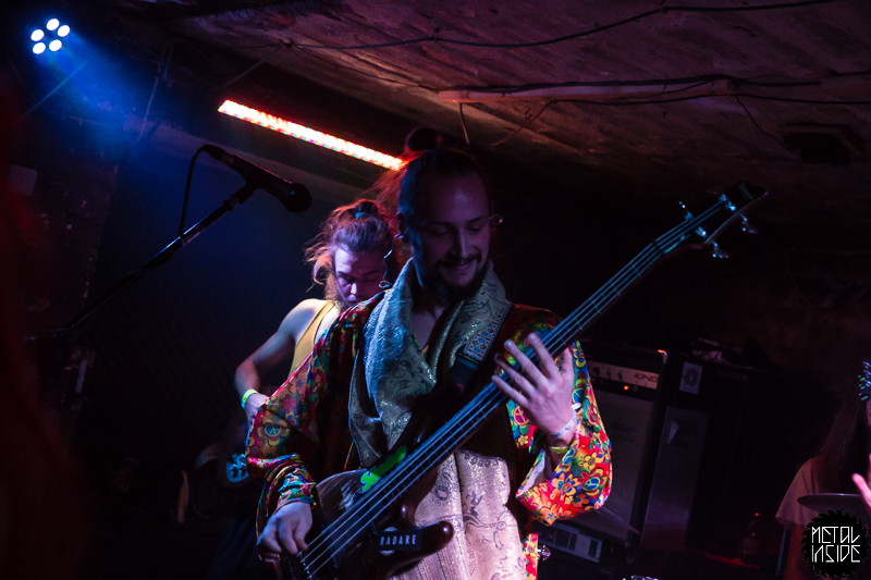 Haus mit Garten und Brauerei, Kino, Freiluftkino, Theater, Dartraum und Café - also quasi alles, was außerhalb der eigenen 4 Wände Spaß macht. Natürlich kann so eine Venue mit den großen Hallen, was Technik oder Licht angeht nicht mithalten, dafür hat es Charme und passt zu Underground-Musik.Und die hatten wir an diesem Wochenende reichlich. 18 Bands +2 Aftershow Acts in 2 Tagen ist eigentlich genau die Menge Musik, die ich mir für ein Wochenende vorstelle. Ein hausgebrautes Bier in die Pranke (0,3l 2€) und schon konnte es losgehen mit PUB CERENKOV, einer kleinen, feinen Combo aus Ulm. Die boten uns melodischen "jamrockin-liquweed-synapse-transformer" Stonerrock. Der Tiefgrund war schon fast voll, so dass die Jungs auch ausreichend Zuschauer hatten - für einen frühen Freitagabend nicht schlecht für alle Beteiligten. Weiter ging es dann mit ODDJOBMEN. Diese lieferten eine außergewöhnliche Klarstimme zu ihrem Desert-Stonerrock. Im Keller lernten wir dann, dass jede Bar andere Biersorten und -größen ausschenkt. Coole Idee soweit. Im Keller gibt es Gösser Radler, Jever, Lich und Gambrinus 12° für 2,50€ die Halbe, liebevoll "Nichtwasser" genannt. Mehr als fair, finde ich, das Wochenende wird günstig. Nun kam die erste Band in der Halle und so strauchelten wir die Treppe aus dem Tiefgrund hoch in den Garten, um von da aus in den Theatersaal zu gehen. MOTHERBRAIN machen fast-forward-Stonerrock. Sie sind perfekte Techniker und ich war erstaunt, was man aus einem Standardschlagzeugset so rausholen kann. Die Effekte der Leadguitar gaben mir dann den Rest, ich bin nun "Motherbrainer". Weiter ging es dann wieder im Tiefgrund mit SWEDENBORG RAUM und ihrem atmosphärischen Space-Rock. Die Schkeuditzer Axel Ben und Flo benannten die Band nach dem Raum zwischen Leben und Tod. Es folgte ein Großkaliber des Stonerrocks: GLOWSUN! Die Herren aus Lille, Frankreich, servierten uns brühwarm psychedelischen Space Rock, der auch gar nicht durch Gesang gestört wurde. Der Groove fließt eingängig durch den Körper und man ist nach 45 Minuten traurig, dass es schon zu Ende ist. Wir hüpften die Treppe zum Tiefgrund nun wieder hinunter (die war wirklich gewöhnungsbedürftig) und wurden von GAFFA GHANDI überrascht: Wir machen heute Jazz! Okay. Stoner Jazz. Was es nicht alles gibt. Nach 20 Minuten hatte ich den Groove gefunden und fand es dann doch schön. Jazz ist halt einfach harter Stoff ... SAMAVAYO war dann wieder leichtere Kost. Grooviger, geradliniger Stonerrock aus Berlin. PHIASCO macht Stonerrock mit Einflüssen aus den 70ern. Die Kölner rockten den nun überfüllten Tiefgrund. Der Headliner MOTHER ENGINE hatte dann satte 90 Minuten Zeit. Leider wurde diese durch einen Stromausfall am Bass für etwa 10 Minuten unterbrochen. Dann war auch noch das Netzteil von einem Effektgerät kaputt, dass dann ausgestöpselt, bis ein neues Netzteil gereicht wurde. Folglich kam zum Schluss ein: "Wir haben noch 10 Minuten, aber haben nur 20 minütige Songs, ich glaube, wir müssen überziehen!". Um 2:45 Uhr morgens war es dann an der Zeit, ins Hotel zu fahren.