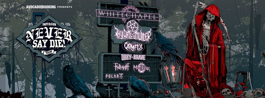 Zum bereits zehnten Mal jährt sich die Impercon Never Say Die! Tour, was mit einem entsprechend umfangreichen Line-Up von sieben Bands gefeiert wird: mit an Bord sind Whitechapel, Thy Art Is Murder, Carnifex, Obey The Brave, Fallujah, Make Them Suffer und Polar. Neben München, Hamburg, Köln und Leipzig machen die Bands auch in Berlin halt, wo sie am 11.11.2016 auftreten werden.