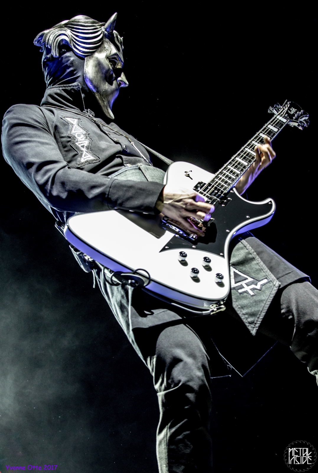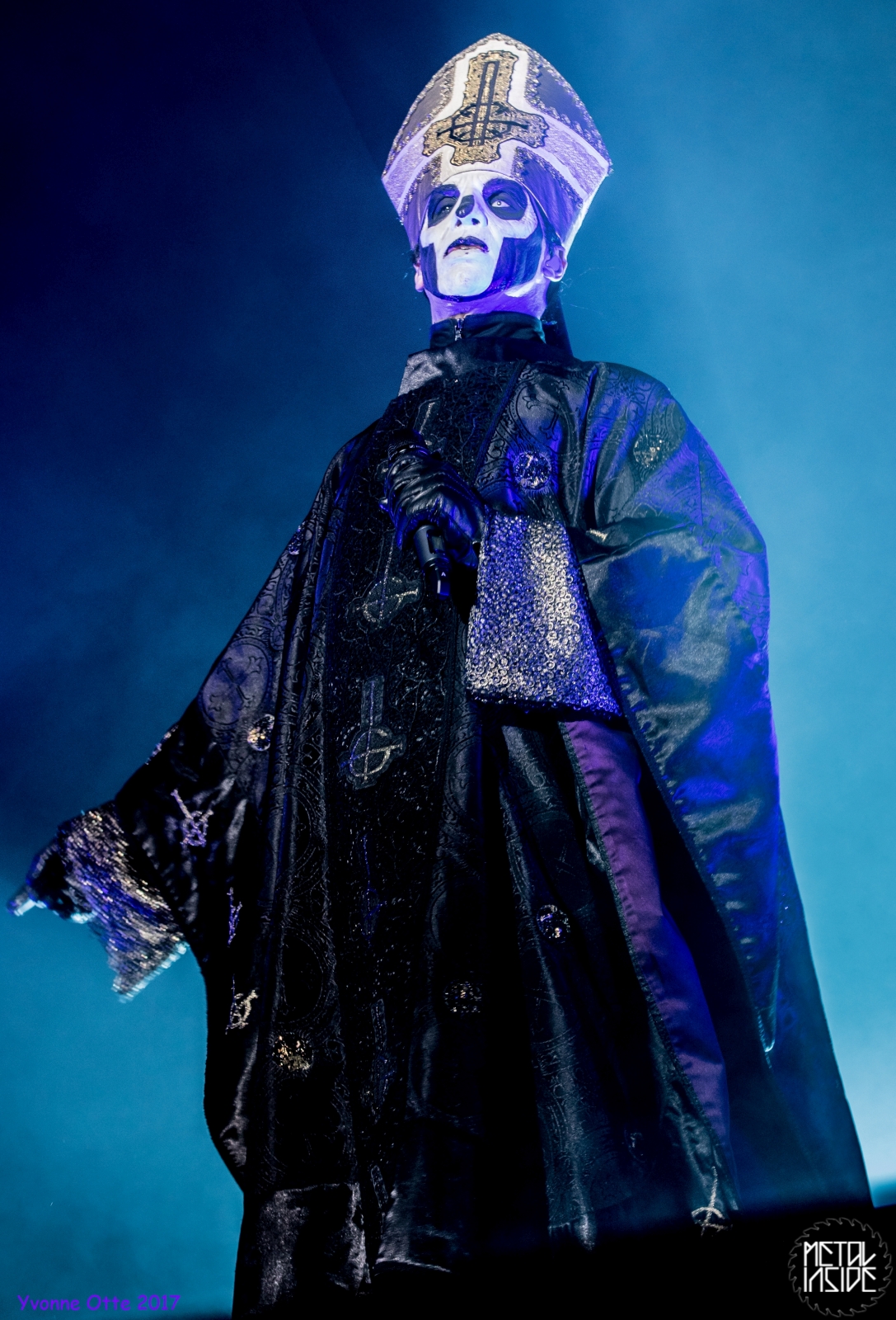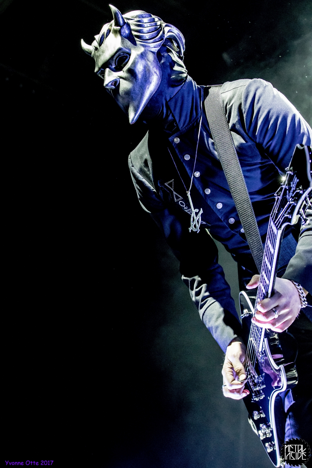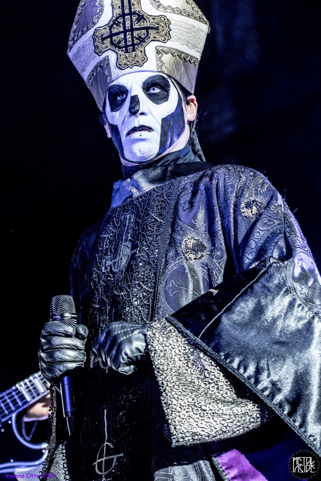 Nun machen GHOST natürlich nicht nur unglaublich erfolgreiche Musik, die mal poppig, mal rockig oder mal elektronisch ist, Sänger „Papa Emeritus III“ ist auch noch ein grandioser Entertainer, der wohl auch die Hallen mit einen Comedy Programm füllen würde! Für alle, die sich auch gefragt haben, was bedeutet Papa Emeritus eigentlich, ein Papa Emeritus ist im Grunde ein Papst in Rente und unser Papa hier hat sehr viel Spaß an der Unterhaltung gefunden und so waren seine Ansagen zwischen den Songs wahre Highlights! So wurde eine Ansage, die auch auf Englisch schon sehr lustig gewesen wäre, einfach an den passenden Stellen mit den passenden deutschen Worten ersetzt und so war der Lachkrampf vorprogrammiert! Man geht natürlich wegen der Musik hin, aber die Ansagen des guten Papas sind mindestens genauso Grund zum Konzert zu gehen. Ja, Papa ist toll, aber man sollte seine „Nameless Ghouls“ nicht vergessen. Die sorgten dafür, dass das Konzert so richtig Fahrt aufnimmt. Die Headbangen, auch wenn keine langen Haare wild umher fliegen, die heizen die Menge ein und waren, im Gegensatz zum eher ruhigen Papa, wirklich sehr aktiv auf der Bühne unterwegs. Die heimlichen Stars! Es machte wirklich Spaß denen zuzusehen! Als Ganzes bekam man wirklich 90 Minuten feinste Unterhaltung!