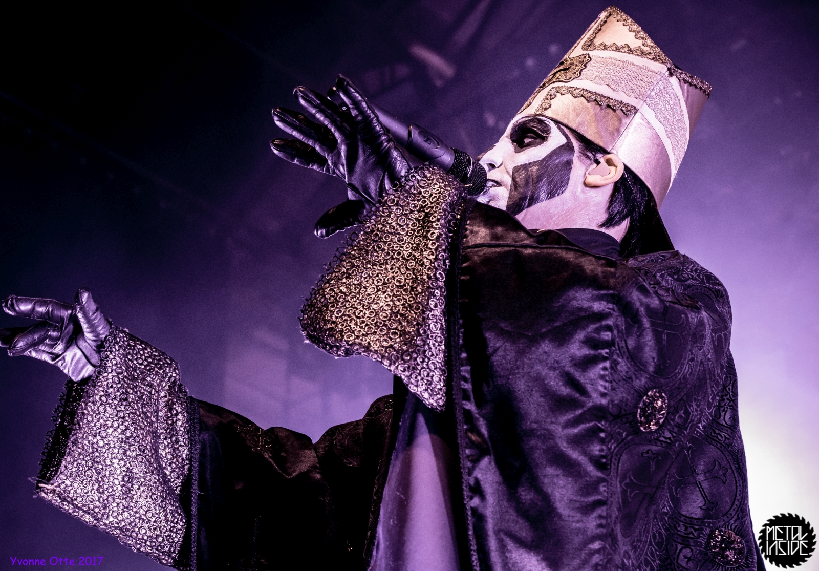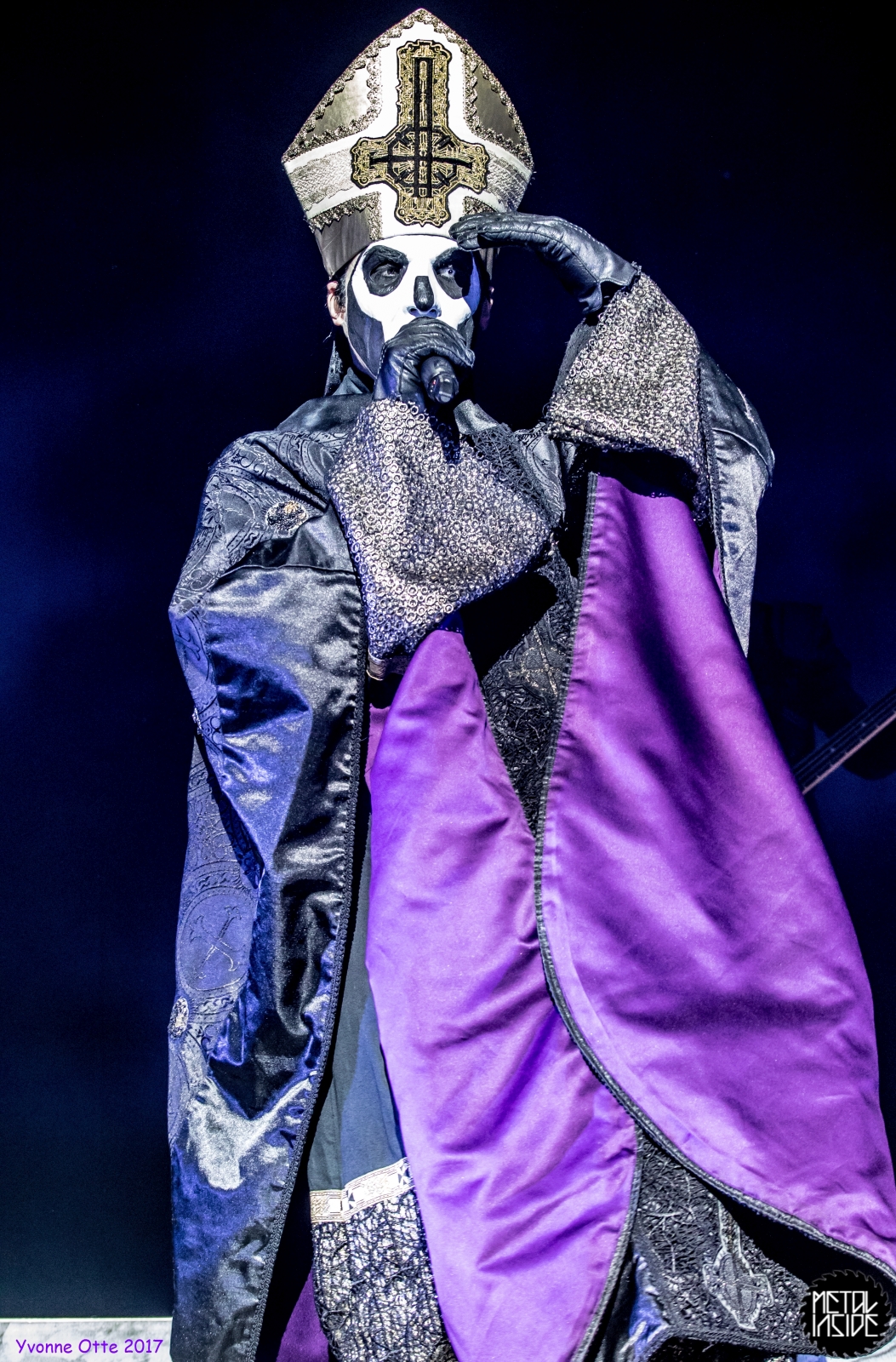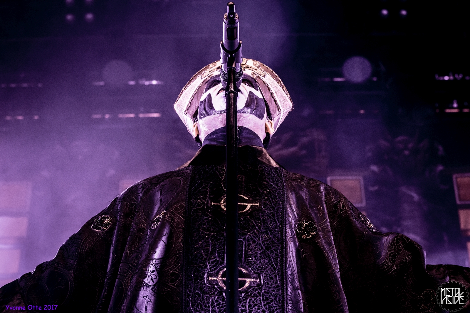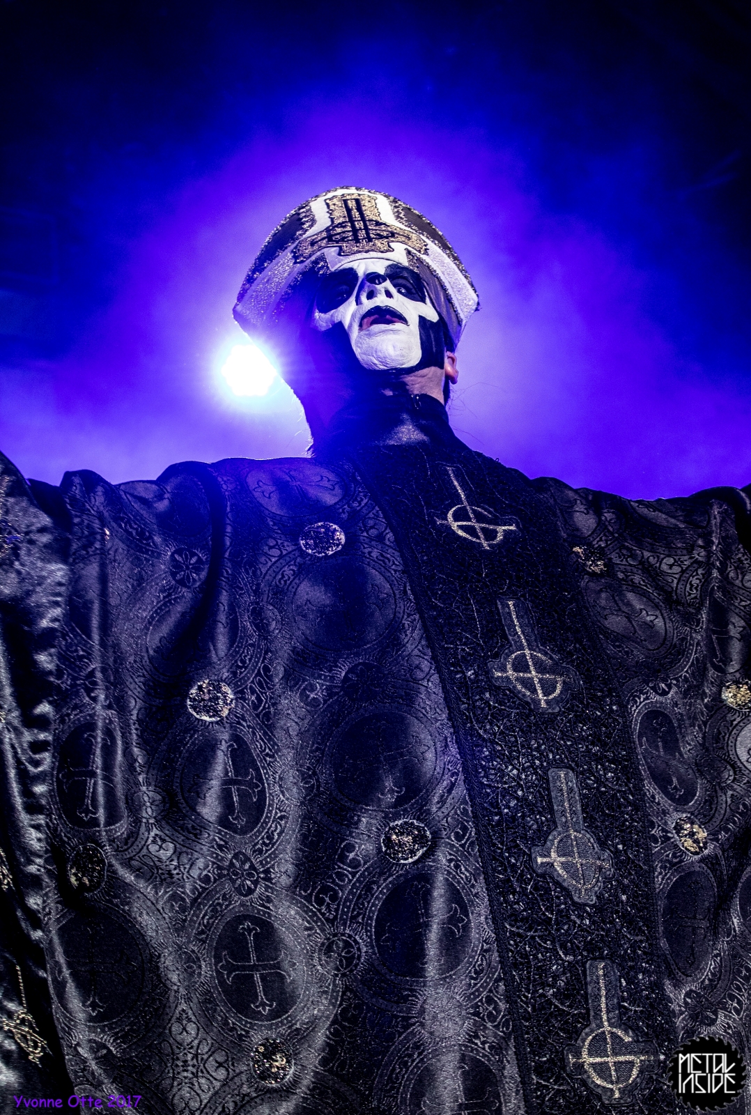 Nun machen GHOST natürlich nicht nur unglaublich erfolgreiche Musik, die mal poppig, mal rockig oder mal elektronisch ist, Sänger „Papa Emeritus III“ ist auch noch ein grandioser Entertainer, der wohl auch die Hallen mit einen Comedy Programm füllen würde! Für alle, die sich auch gefragt haben, was bedeutet Papa Emeritus eigentlich, ein Papa Emeritus ist im Grunde ein Papst in Rente und unser Papa hier hat sehr viel Spaß an der Unterhaltung gefunden und so waren seine Ansagen zwischen den Songs wahre Highlights! So wurde eine Ansage, die auch auf Englisch schon sehr lustig gewesen wäre, einfach an den passenden Stellen mit den passenden deutschen Worten ersetzt und so war der Lachkrampf vorprogrammiert! Man geht natürlich wegen der Musik hin, aber die Ansagen des guten Papas sind mindestens genauso Grund zum Konzert zu gehen. Ja, Papa ist toll, aber man sollte seine „Nameless Ghouls“ nicht vergessen. Die sorgten dafür, dass das Konzert so richtig Fahrt aufnimmt. Die Headbangen, auch wenn keine langen Haare wild umher fliegen, die heizen die Menge ein und waren, im Gegensatz zum eher ruhigen Papa, wirklich sehr aktiv auf der Bühne unterwegs. Die heimlichen Stars! Es machte wirklich Spaß denen zuzusehen! Als Ganzes bekam man wirklich 90 Minuten feinste Unterhaltung!