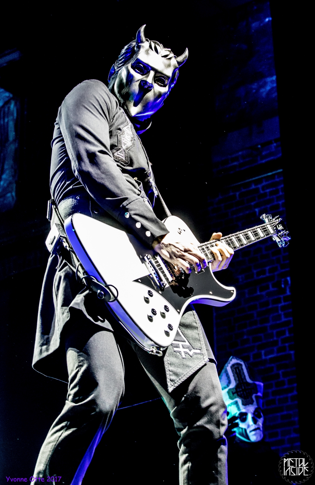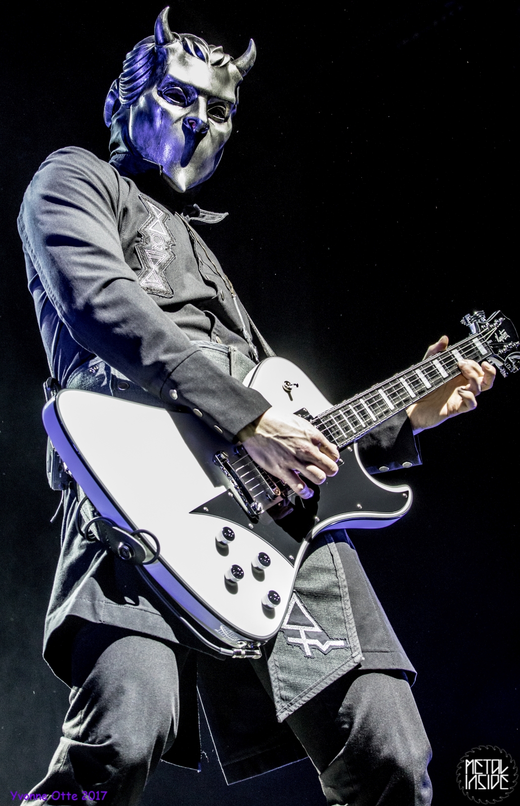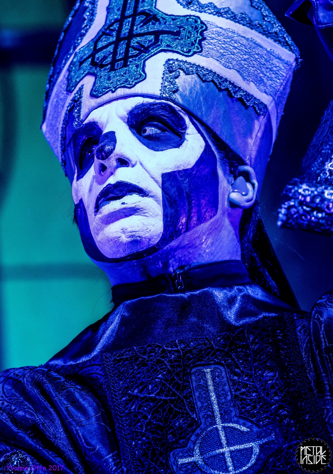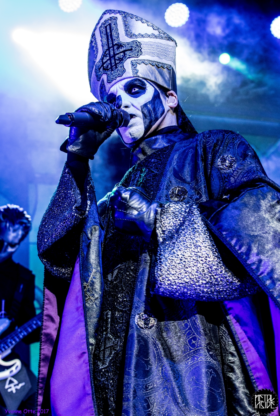 Nun machen GHOST natürlich nicht nur unglaublich erfolgreiche Musik, die mal poppig, mal rockig oder mal elektronisch ist, Sänger „Papa Emeritus III“ ist auch noch ein grandioser Entertainer, der wohl auch die Hallen mit einen Comedy Programm füllen würde! Für alle, die sich auch gefragt haben, was bedeutet Papa Emeritus eigentlich, ein Papa Emeritus ist im Grunde ein Papst in Rente und unser Papa hier hat sehr viel Spaß an der Unterhaltung gefunden und so waren seine Ansagen zwischen den Songs wahre Highlights! So wurde eine Ansage, die auch auf Englisch schon sehr lustig gewesen wäre, einfach an den passenden Stellen mit den passenden deutschen Worten ersetzt und so war der Lachkrampf vorprogrammiert! Man geht natürlich wegen der Musik hin, aber die Ansagen des guten Papas sind mindestens genauso Grund zum Konzert zu gehen. Ja, Papa ist toll, aber man sollte seine „Nameless Ghouls“ nicht vergessen. Die sorgten dafür, dass das Konzert so richtig Fahrt aufnimmt. Die Headbangen, auch wenn keine langen Haare wild umher fliegen, die heizen die Menge ein und waren, im Gegensatz zum eher ruhigen Papa, wirklich sehr aktiv auf der Bühne unterwegs. Die heimlichen Stars! Es machte wirklich Spaß denen zuzusehen! Als Ganzes bekam man wirklich 90 Minuten feinste Unterhaltung!