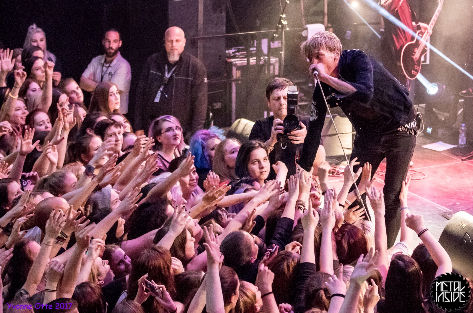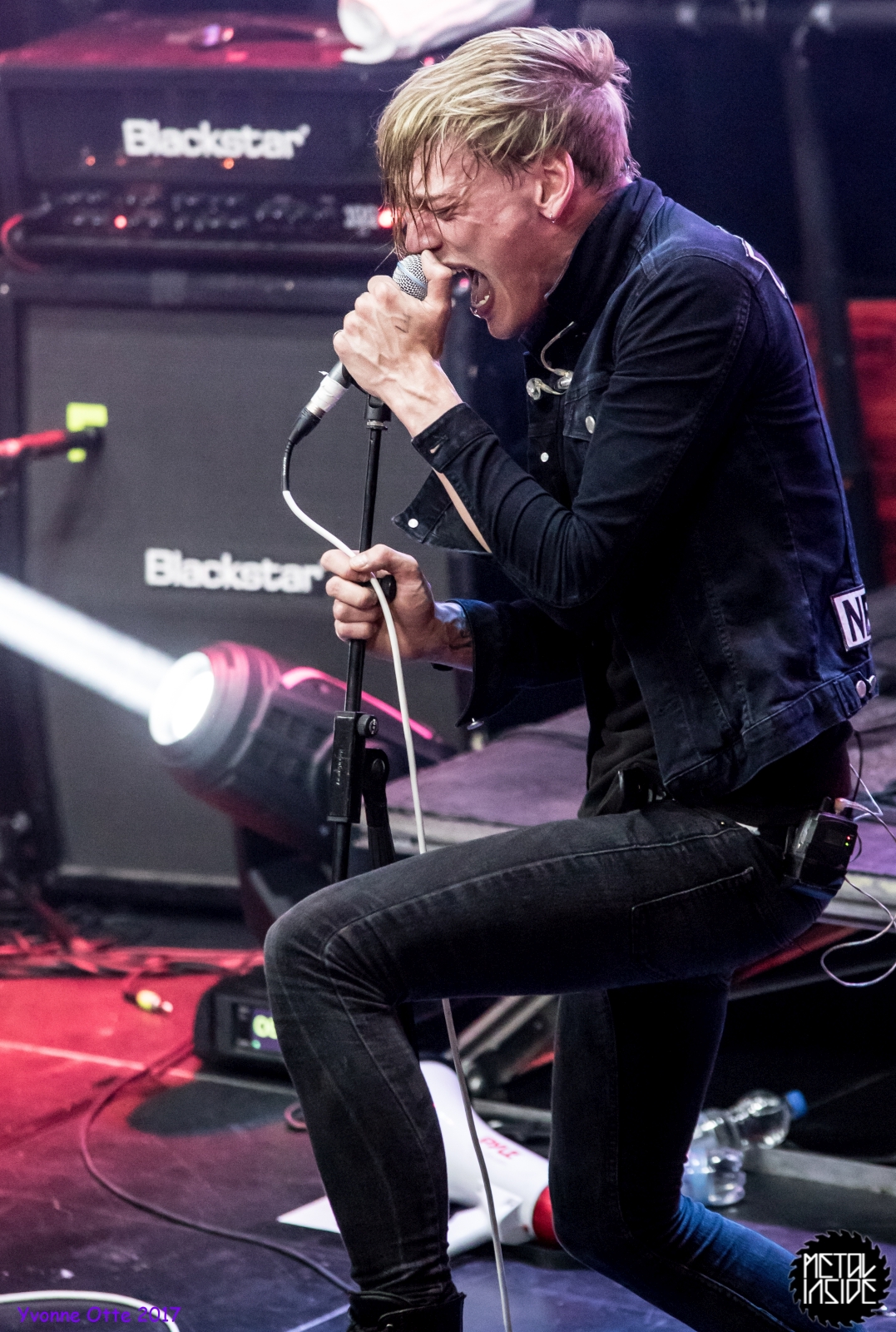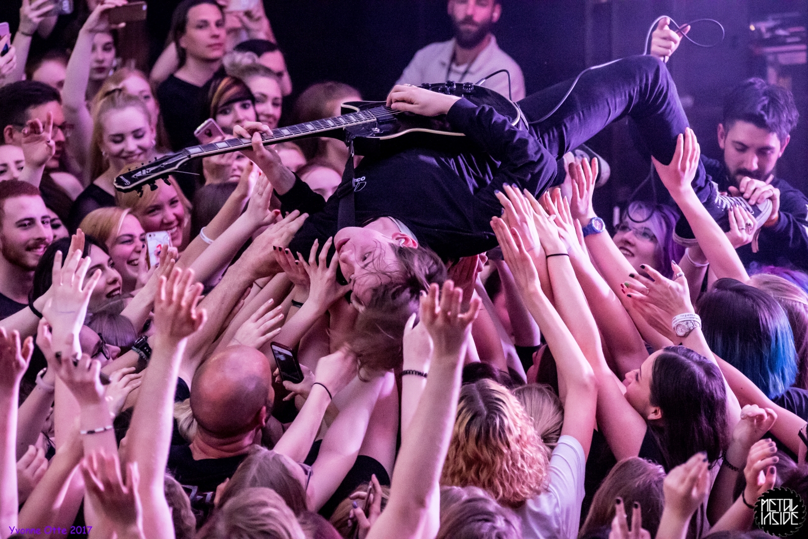 Es folgte ein kleiner Umbau, damit COUNTERFEIT auch genügend Platz auf der Bühne haben würden. Gegen 22 Uhr war es dann so weit: COUNTERFEIT betraten die Bühne! Das überwiegend weibliche Publikum kannte kein Halten mehr! Besser kann die Stimmung bei einen Konzert fast nicht sein. Kurz zuvor hatten COUNTERFEIT ihr Debut-Album „Together We Are Stronger“ veröffentlicht und die Fans kannten natürlich schon alle Texte! Auch wenn sehr viele Mädchen anwesend waren, an Circlepits hat es trotzdem nicht gemangelt! COUNTERFEIT machen eine einmalige Liveshow, die man kaum mit Worten schreiben kann, sondern wirklich erleben muss! Da wird mal eben der gesamte Innenraum geteilt, damit Sänger Jamie zur Hallenmitte gehen kann, um von dort einen Song zu spielen. Generell springen ständig Musiker in die Menge und lassen sich tragen. Oder Jamie klettert zu den Balkon hoch und singt von da den Song. Natürlich überall keine Security um ihn herum! Da muss schon Vertrauen da sein, dass nichts passiert. Natürlich sind alle Konzertbesucher friedlich, aber wir leben in einer Zeit, wo Kontrolle doch nicht so schlecht ist und man weiß nie, ob nicht doch jemand man austickt. Trotzdem Wahnsinn, dass so viel Vertrauen da ist! Bei COUNTERFEIT weiß man nie, was als nächstes passiert und das ist auch der Grund, warum die Fans die Show so sehr lieben.