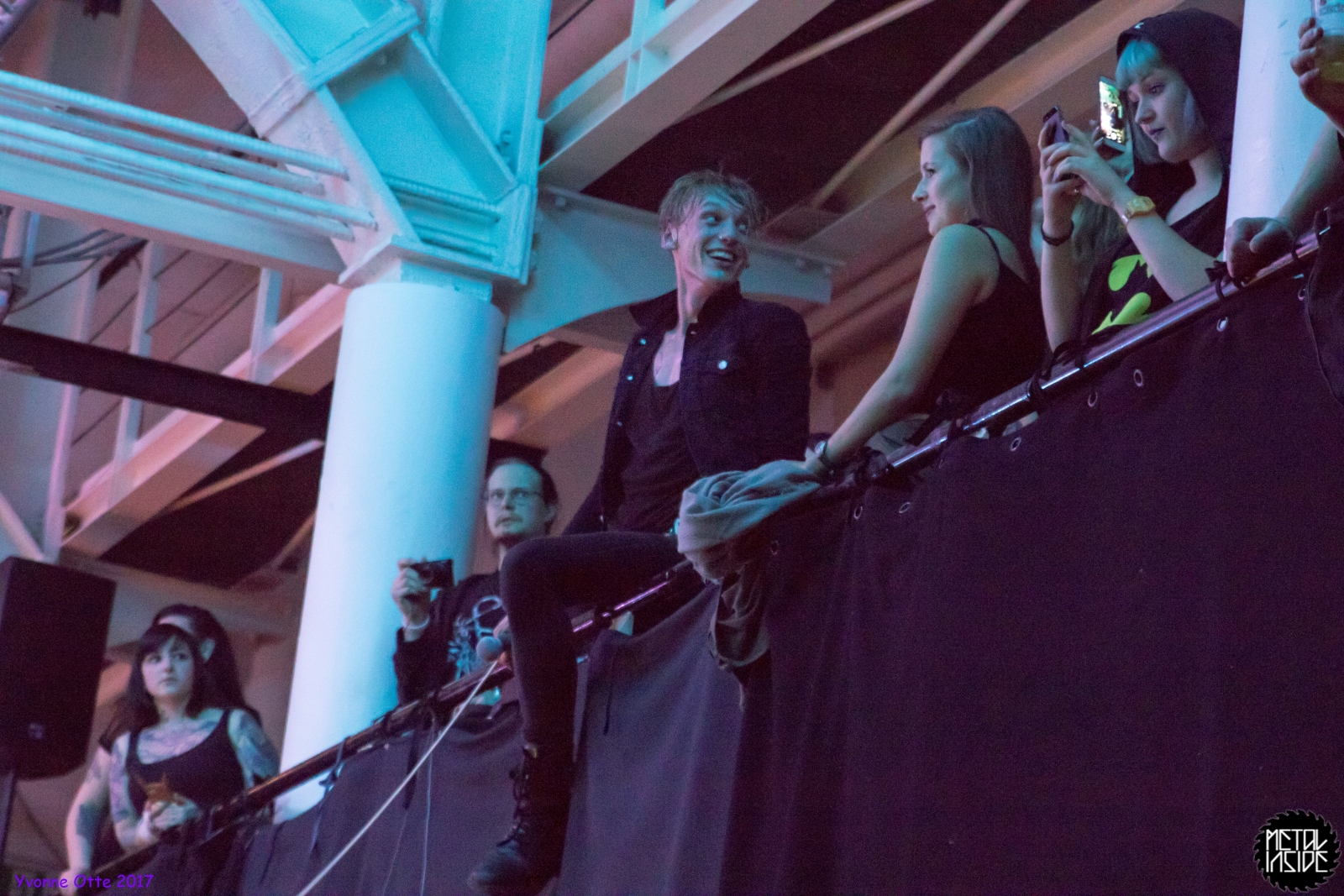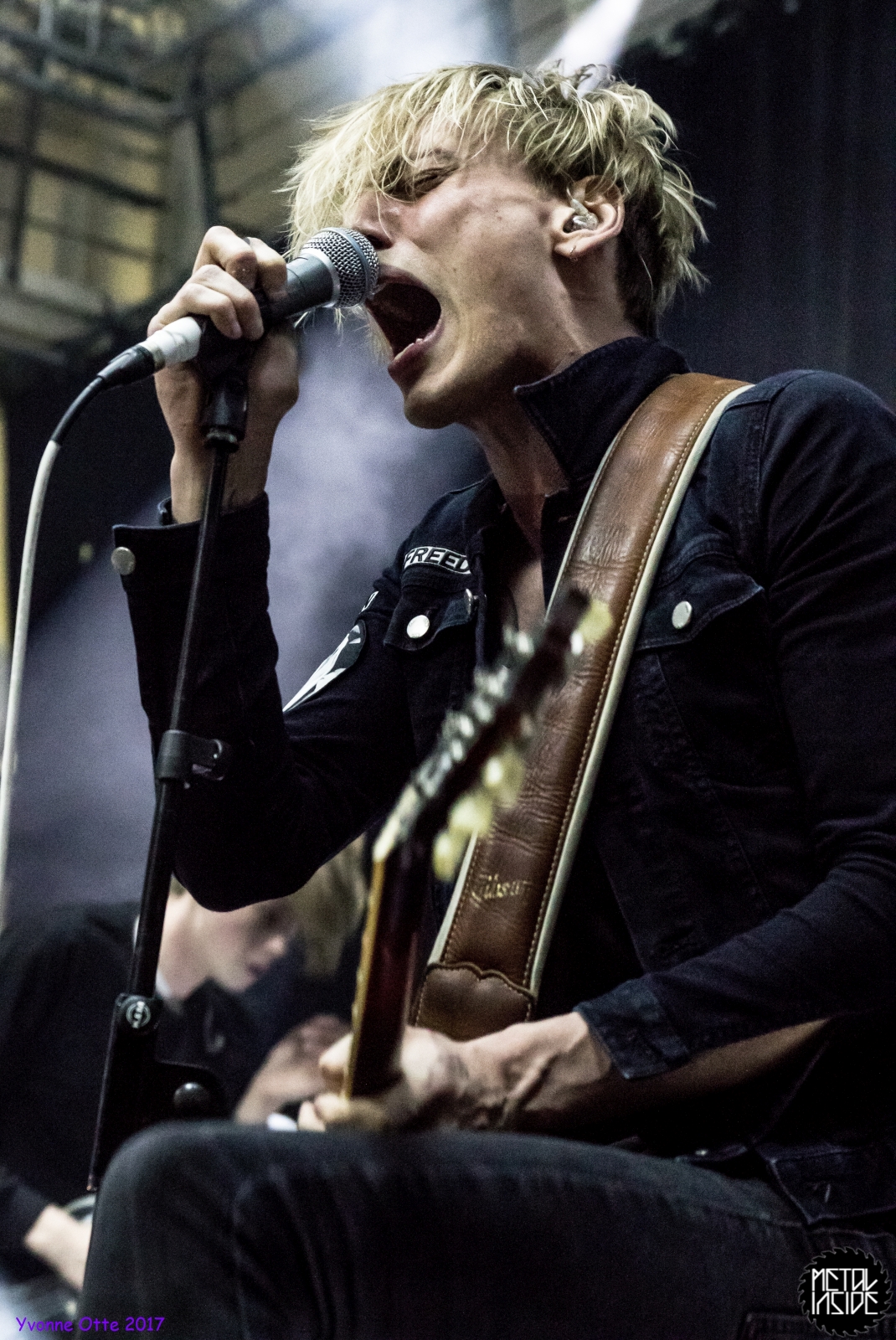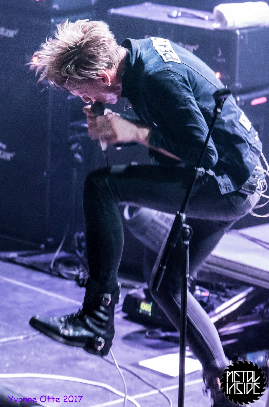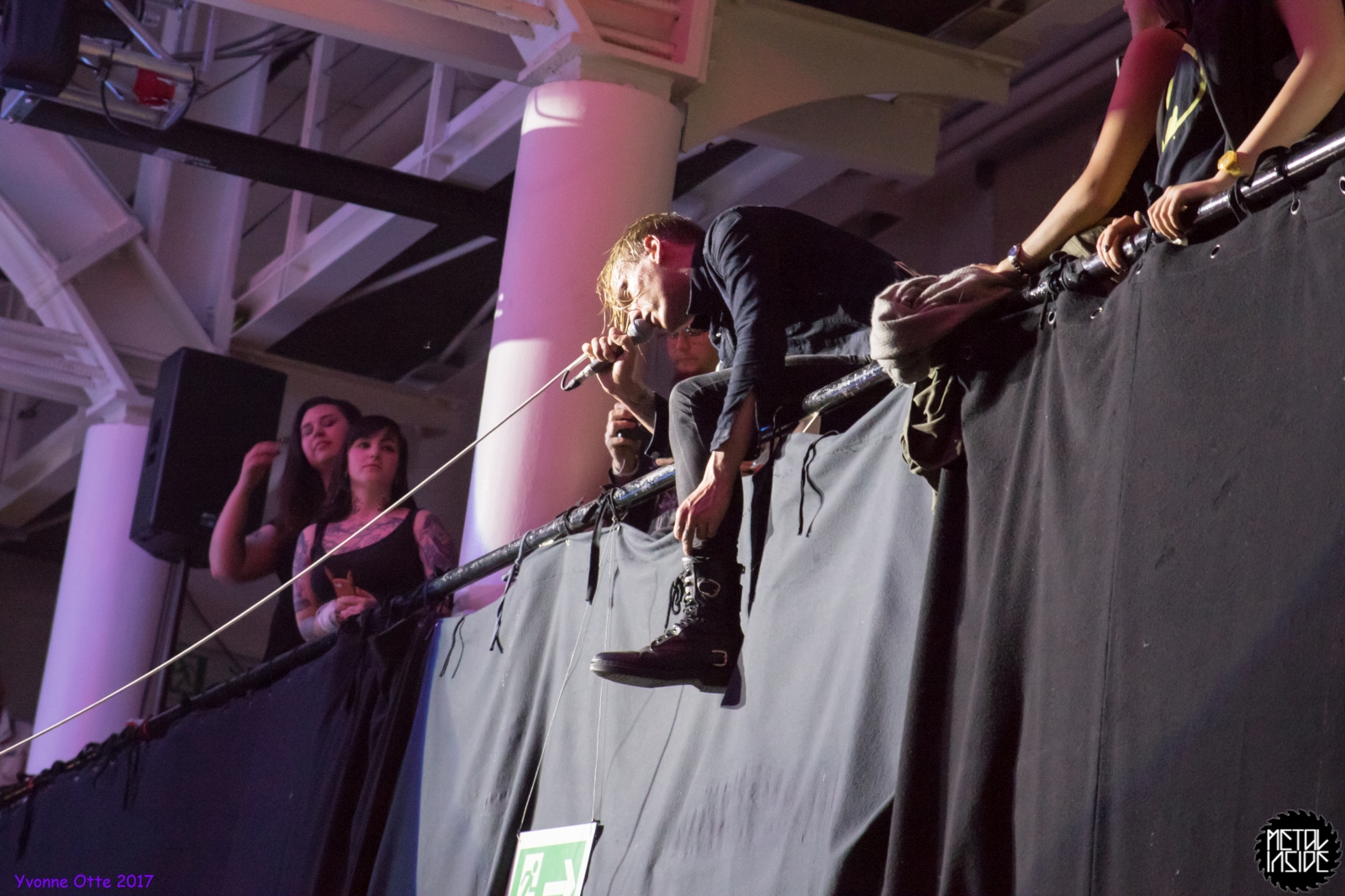 Es folgte ein kleiner Umbau, damit COUNTERFEIT auch genügend Platz auf der Bühne haben würden. Gegen 22 Uhr war es dann so weit: COUNTERFEIT betraten die Bühne! Das überwiegend weibliche Publikum kannte kein Halten mehr! Besser kann die Stimmung bei einen Konzert fast nicht sein. Kurz zuvor hatten COUNTERFEIT ihr Debut-Album „Together We Are Stronger“ veröffentlicht und die Fans kannten natürlich schon alle Texte! Auch wenn sehr viele Mädchen anwesend waren, an Circlepits hat es trotzdem nicht gemangelt! COUNTERFEIT machen eine einmalige Liveshow, die man kaum mit Worten schreiben kann, sondern wirklich erleben muss! Da wird mal eben der gesamte Innenraum geteilt, damit Sänger Jamie zur Hallenmitte gehen kann, um von dort einen Song zu spielen. Generell springen ständig Musiker in die Menge und lassen sich tragen. Oder Jamie klettert zu den Balkon hoch und singt von da den Song. Natürlich überall keine Security um ihn herum! Da muss schon Vertrauen da sein, dass nichts passiert. Natürlich sind alle Konzertbesucher friedlich, aber wir leben in einer Zeit, wo Kontrolle doch nicht so schlecht ist und man weiß nie, ob nicht doch jemand man austickt. Trotzdem Wahnsinn, dass so viel Vertrauen da ist! Bei COUNTERFEIT weiß man nie, was als nächstes passiert und das ist auch der Grund, warum die Fans die Show so sehr lieben.