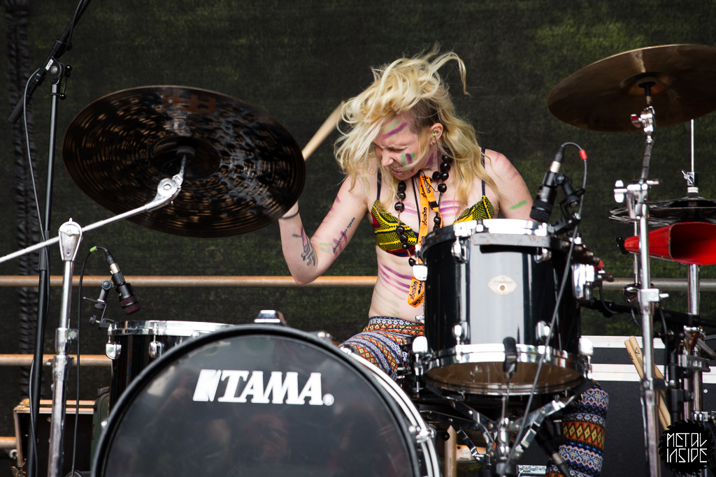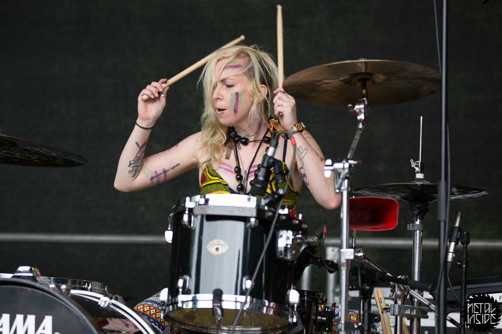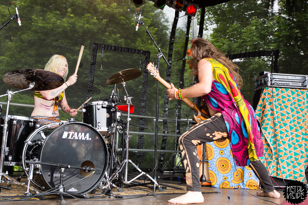 VODUN [UK] mussten nach ihrem Gig leider sofort wieder los. Sie hätten gerne noch mit dem Publikum herumgehangen. Wirklich schade, es sei jedem gegönnt, auf dem FVF zu chillen. Das tat dem Auftritt allerdings nichts. Die beiden Powerfrauen an Schlagzeug und Gesang, begleitet von einem Gitarristen, weckten auch den letzten schlaftrunkenen Gast. Die Stimme erinnert doch sehr an Skunk Anansie ...