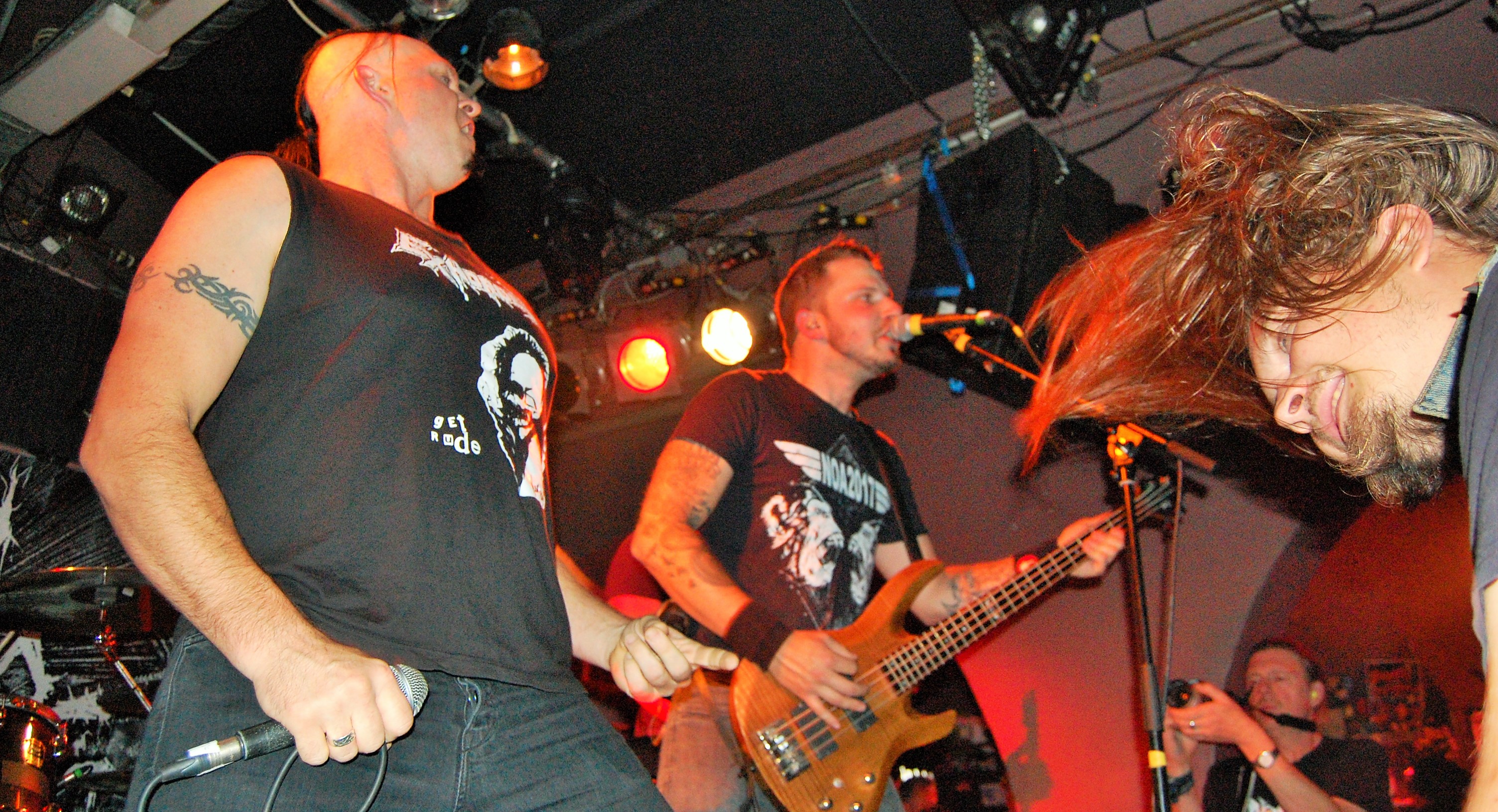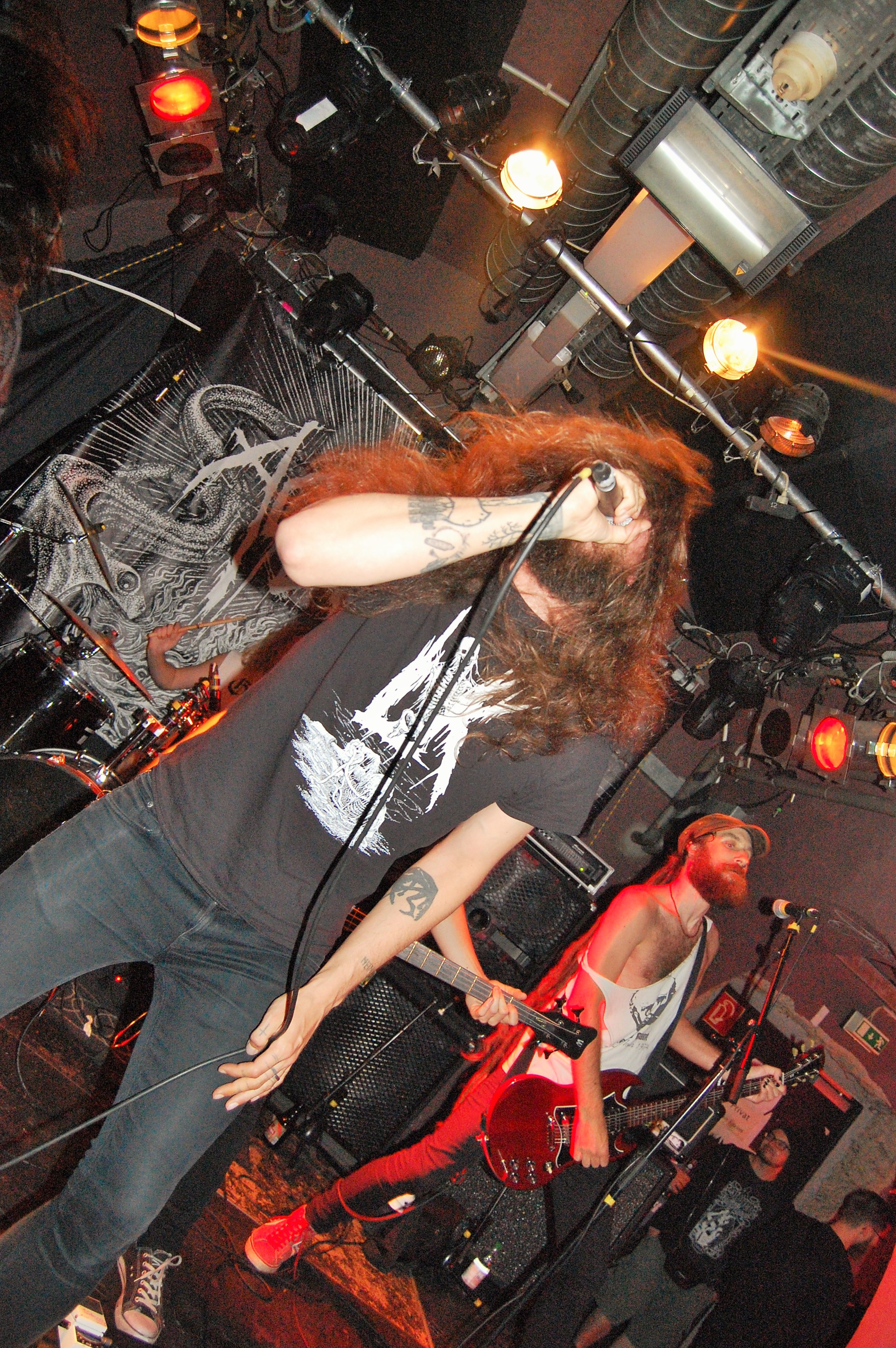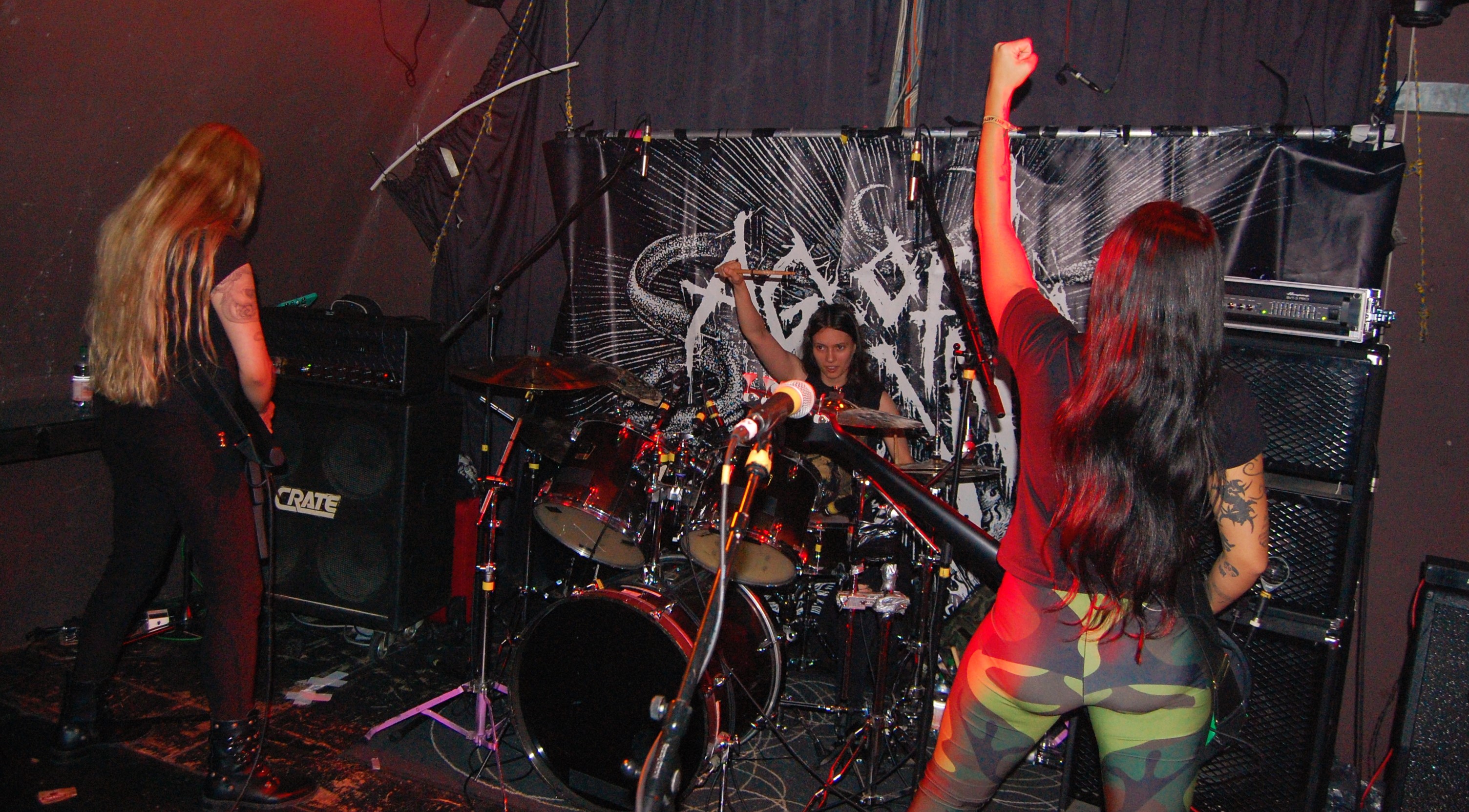 Das sind auch NERVOSA. Ohne Zweifel. Es liegt nahe, dass die große Zuneigung zu den drei brasilianischen Mädels durchaus an ihrem Geschlecht liegt. Der gemeine Banger scheint eben doch einfach zufrieden zu stellen zu sein. Da wird mit dem Handy mal nicht das Gesicht , sondern eben das Gesäß geknipst... Wie auch immer: So süß sie auch wirken, so sehr gehen sie aus sich heraus, wenn „Hypocrisy“ einsetzt. NERVOSA zitieren Slayer und sämtliche deutschen Big-Sonstwieviels und lassen ihre süßen Mädel-Masken fallen. Tight as fuck, zugegeben auch ein wenig hausbacken, thrashen sie die angenehm zugequarzte Butze zusammen und sogar für noch mehr Hitze. Die Männchen im Publikum und alle andere gehen steil und selbst Kritikaster der Gleichberechtigung wiegen zufrieden mit dem Kopf. „Intolerance Means War“ setzt einen Höhepunkt. Sie sind aber auch zu süß. Und echt ganz gut. Die Female-Thrasher von NERVOSA.
