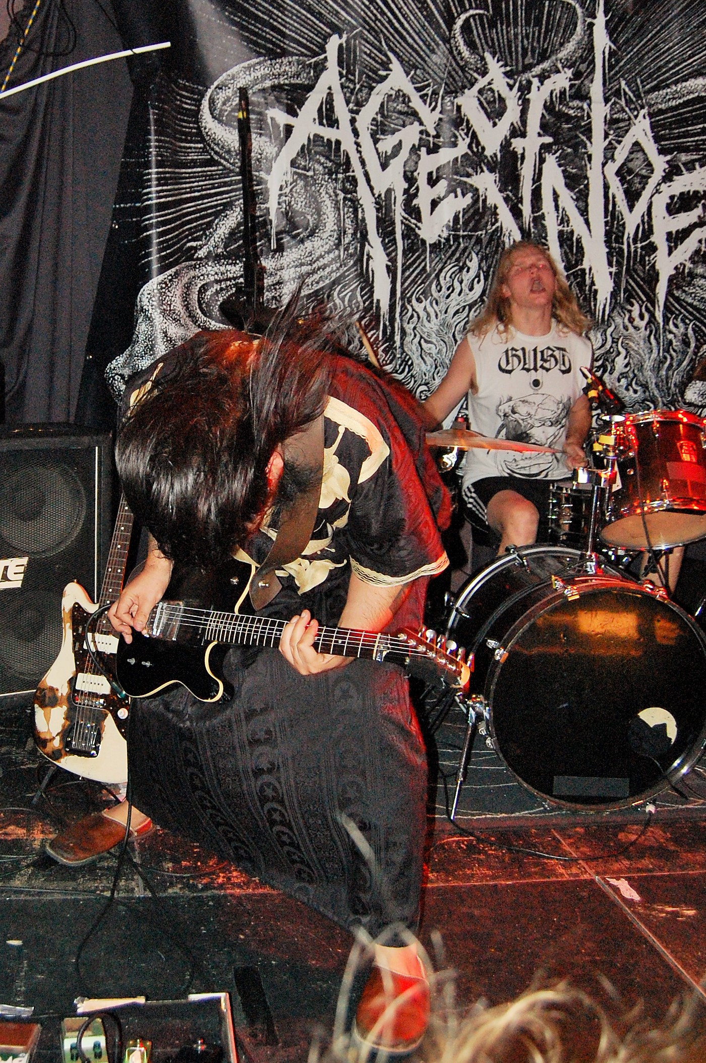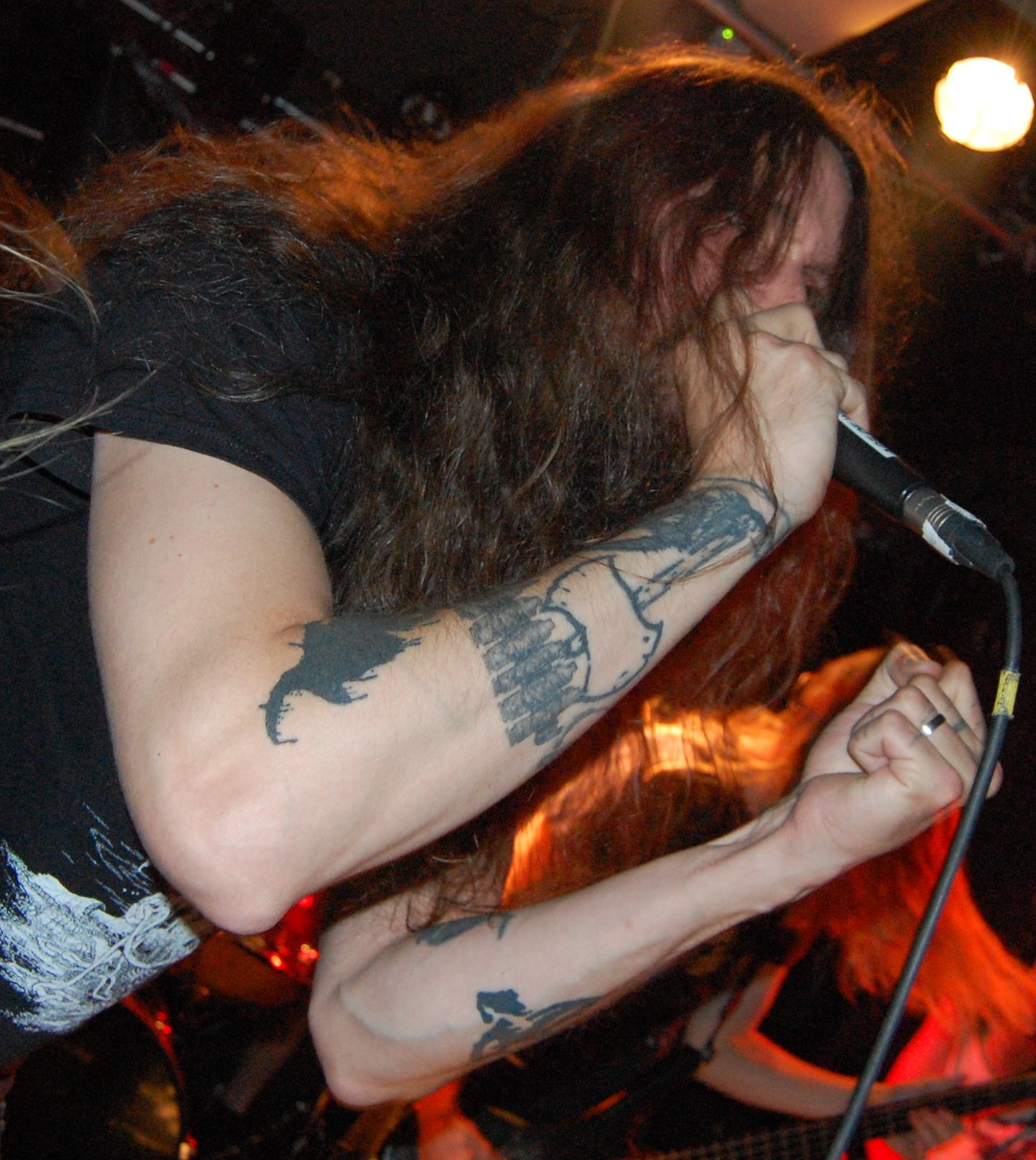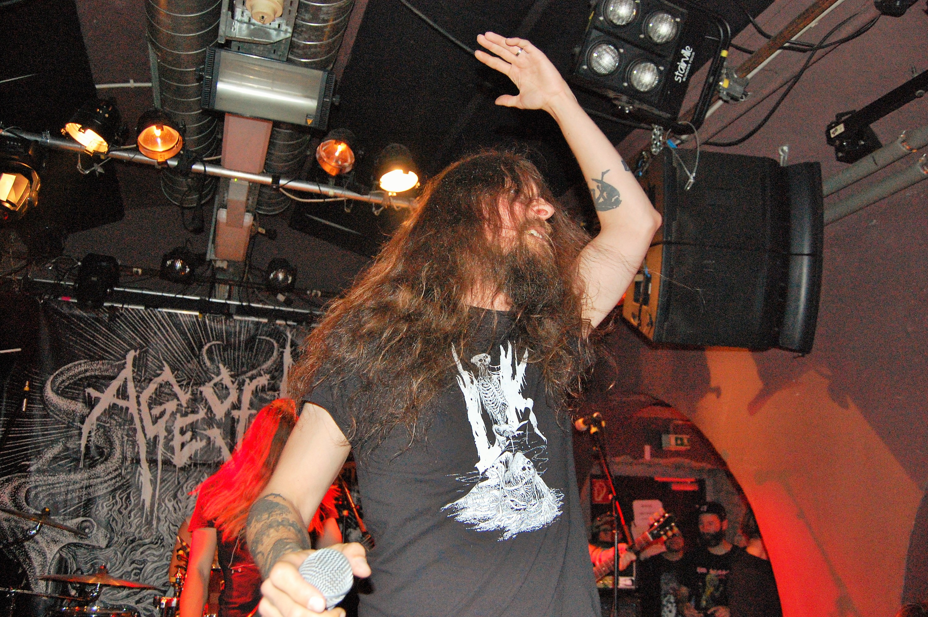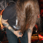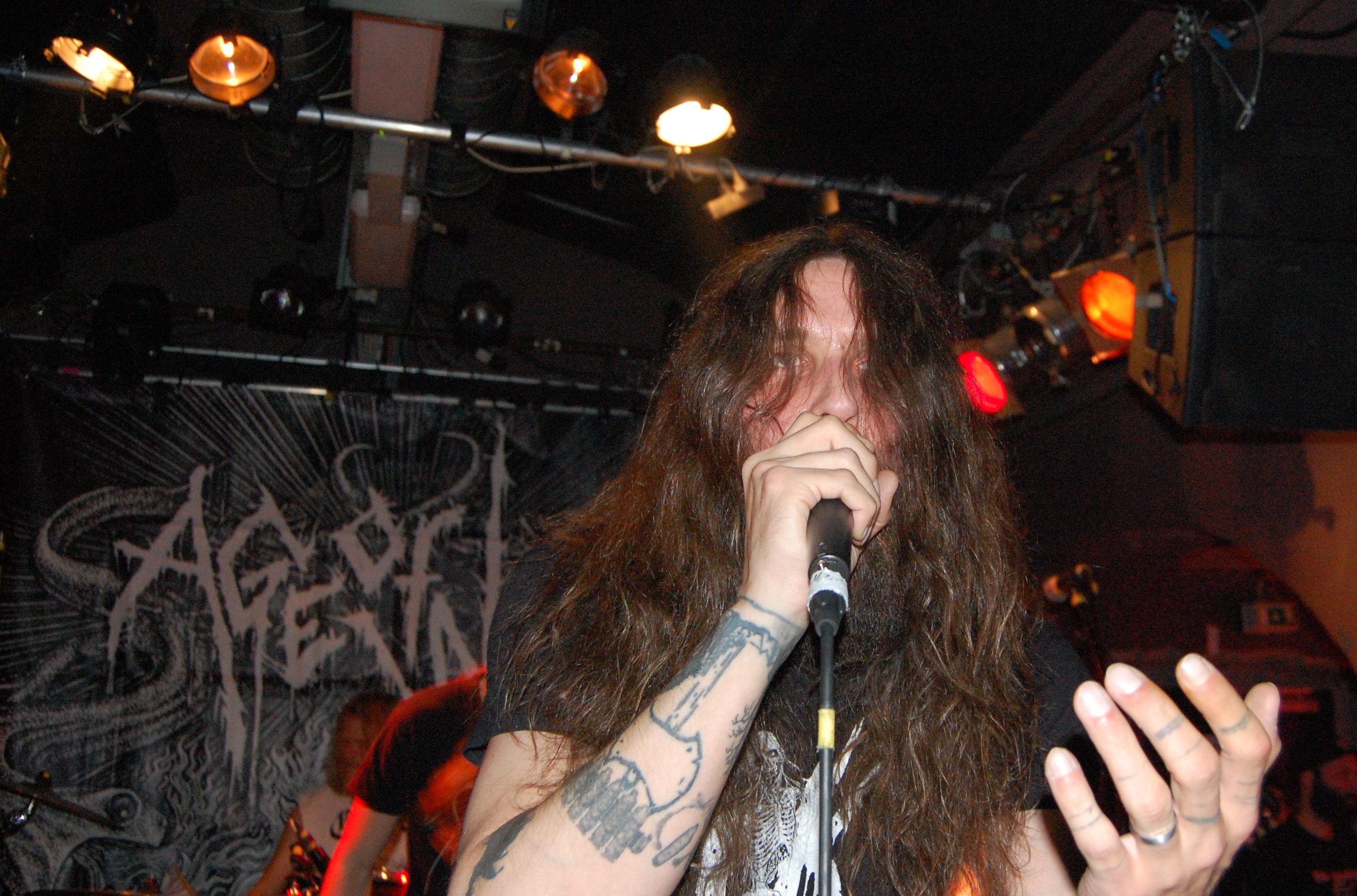 Wenn die denkst, es geht nicht mehr, kommt irgendwo ein Engel her: In Gestalt von AGE OF WOE. Die Göteborger begrüßen Hamburg herzlich und kündigen tanzbaren Death Metal an – und treffen damit den rostigen Nagel voll auffe Birne. Eine knappe Stunde entführen sie auch die schüchterne Blonde neben uns in andere Sphären. Stark, wie Sänger Sonny für Fan-Band-Bindung sorgt – ehrlicher kann ein Fronter nicht wirken. Dazu der vollkommen irre angezogene Carlos an der Gitarre – in orientalischem Mäntelchen und Hausschuhen fiedelt er mittels feinster Melodien so viel Gänsehaut auf die Ärmchen, dass sich wildfremde Menschen in die Arme fallen. Ob neue Songs von „An Ill Wind Blowing“ Opener „Voices of the Unleashed“, „Bad Blood“, Heavy Clouds“, „Ill Winds“) oder ältere von „Inhumanform“ („Like Embers“, „Red Eyes“, „Black Rain“) und ein ganz altes – „No Remorse“ von der 2011er-Premieren-EP – alles, wirklich alles stimmt an diesem Abend bei AGE OF WOE. Der Crusty-Hammer! Wie das Bambi – und wie der gesamte Abend irgendwie auch.