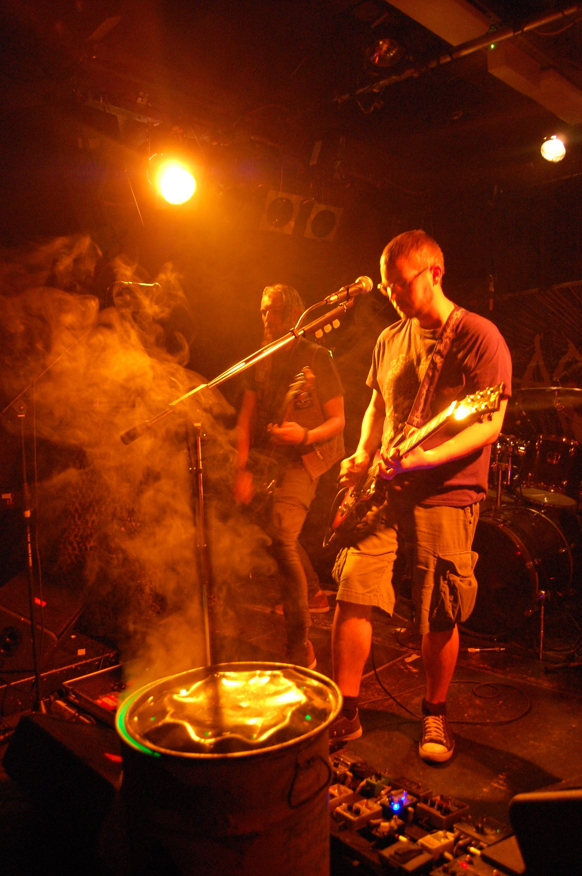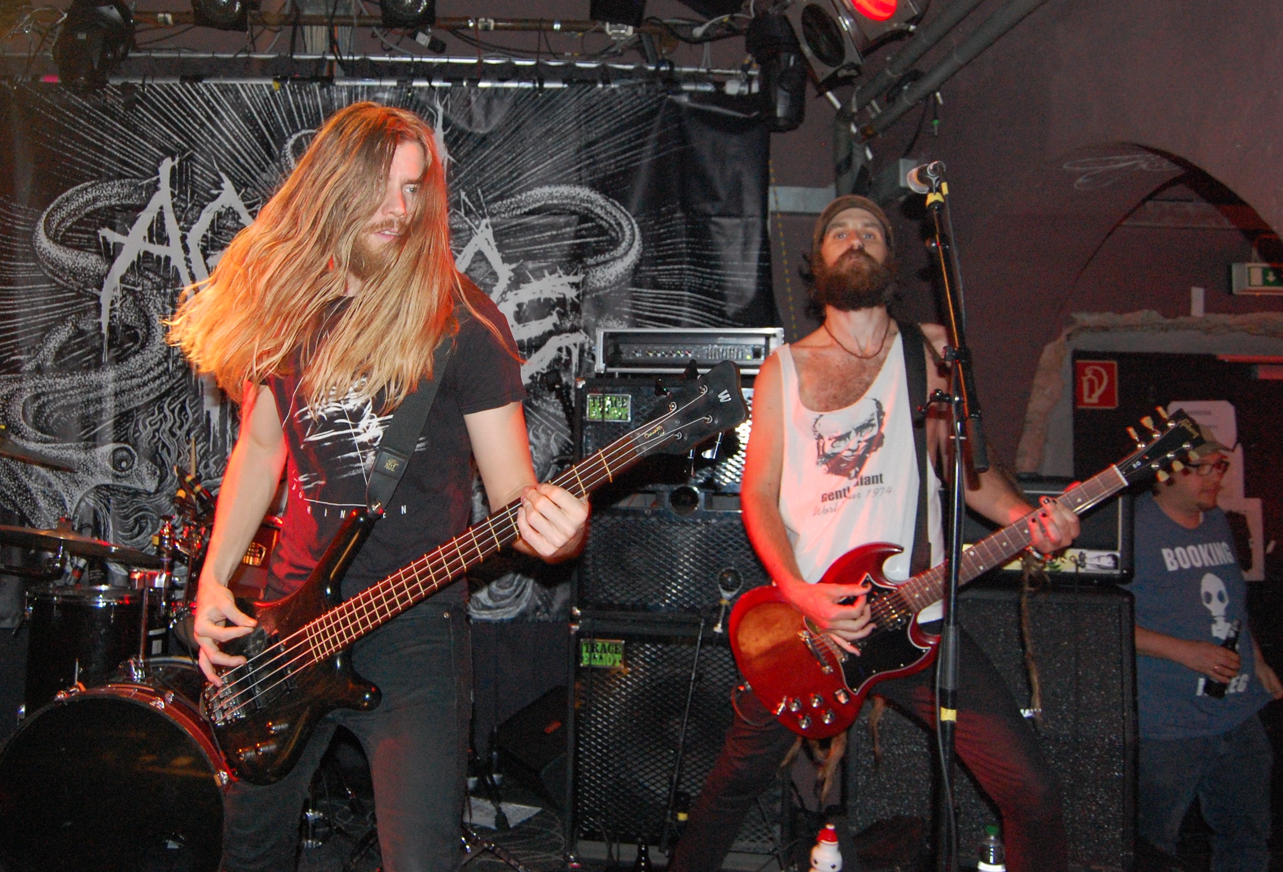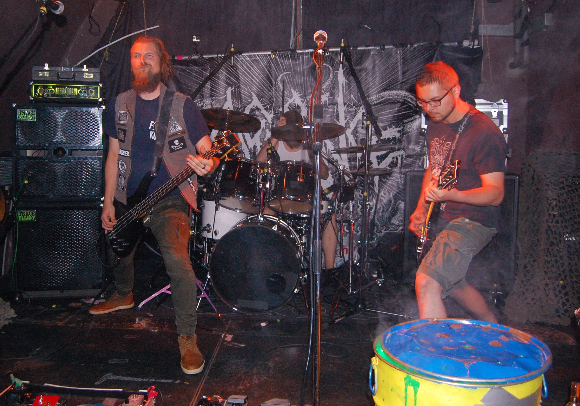 Irgendwie unpassend scheinen VAyL aus Berlin auf dem Billing zu sein – mit ihrem Stoner-Habitus. Da stehen da zwei Studenten und wissen nicht so recht, warum. Aber eben nur scheinbar. Denn als es richtig losgeht, geht die pimmelige Pickelhaube aka Hipsterzopf auf und der Kollege banged wie der Metal-Teufel. Musikalisch sind Songs wie „Follow The Goat“ „Amnesia“, zu dem es sogar ein Video gibt, oder „Tranquilized“ stonylässig as fuck und grooven ziemlich. Wenn jetzt die Ansagen entspannter wären als „Wir beeilen uns“ und die Brille besser säße, dann wäre hier der 1a-Live-Event zu nächsten Blubber-Party geritzt. Extrem cool kamen aber die Gasmaskenschaufenster-Puppe und das Glücksrad am Merch-Stand...