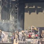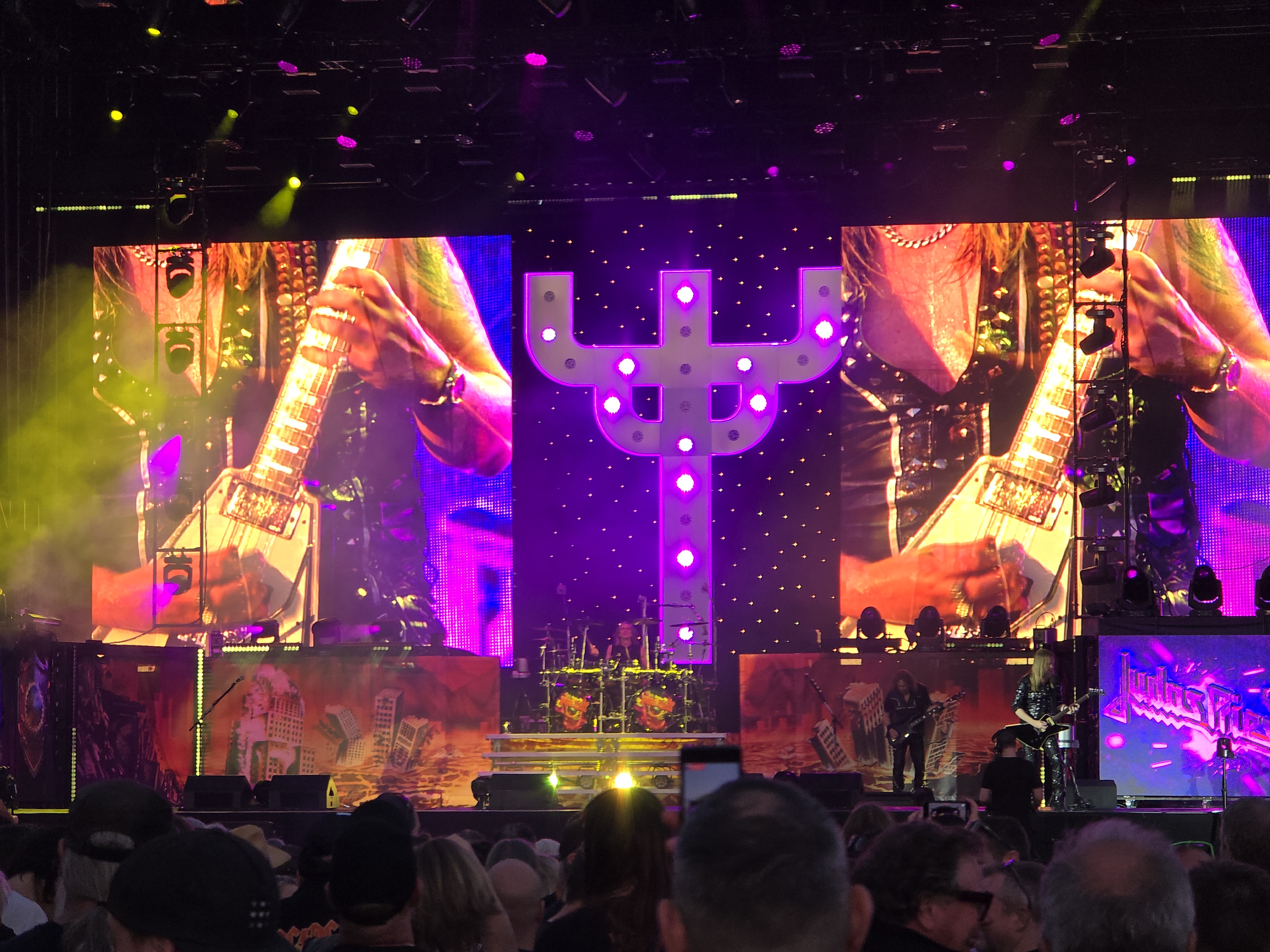 Mit „All Guns Blazing“ starten JUDAS PRIEST fulminant in ihren sehr „Painkiller“ lastigen Set und lassen von Beginn an keinen Zweifel aufkommen, auf wessen breiten Schultern sich die Musik, die wir alle so lieben, begründet. Der fast 74-jährige Frontmann Rob Halford scheint in einen Jungbrunnen gefallen zu sein. Er ist agiler, klebt nicht mehr so sehr am Teleprompter und überzeugt mit der besten Gesangsleistung seit Jahrzehnten. Ich habe Rob in den letzten 25 Jahren doch einige Male gesehen und durchaus auch tolle Auftritte erlebt, aber hier und heute ist es wirklich next Level. Faulkner und der wieder behaarte Andy Sneap haben sich zu einem tollen Gitarren-Duo gemausert und können die übergroßen Fußstapfen von Tipton/ Downing zwar nicht ganz, aber doch in beeindruckendem Maße ausfüllen. Im Gegensatz zu vielen anderen altgedienten Herrschaften ruhen sich JUDAS PRIEST nicht aus und überraschen auch immer wieder mit Songs, die keiner auf dem Zettel hatte. Neben diversen „Painkiller“ Songs wie zum Beispiel „Between The Hammer And The Anvil“, „One Shot At Glory“ oder „Hell Patrol“ überraschen mich vor allem „Solar Angels“ oder „Judas Rising“. Da darf dann auch gerne mal ein „Victim Of Changes“ oder ein „Green Manalishi (With The Two Pronged Crown)“ fehlen. Der Sound ist fett und Robs Gesang erfreulich effektfrei. Neben der makellosen musikalischen Darbietung überzeugen auch das Bühnenbild und die großen, teils mobilen bzw. teilbaren Leinwände, auf denen entweder die Musiker oder zu den Songs passende Animationen zu sehen sind. Volle 20 Songs hauen uns JUDAS PRIEST um die Ohren, und zwar im Dauerfeuermodus. Es gibt nur einige kurze Ansagen, keine überflüssigen Soli, sondern einfach nur Song auf Song und die Menge liebt es. Der Zugabeblock besteht aus „Hellion/Electric Eye“, „Hell Bent For Leather“ (natürlich mit Motorrad) und dem unverwüstlichen „Living After Midnight“. Auch wenn es danach für heute zu Ende ist, flimmert eine wichtige Botschaft weithin sichtbar über die Leinwände: „The PRIEST will be back“. Man kann es nur hoffen, denn dieser Form sind Rob Halford und Co. nach wie vor eine Macht.