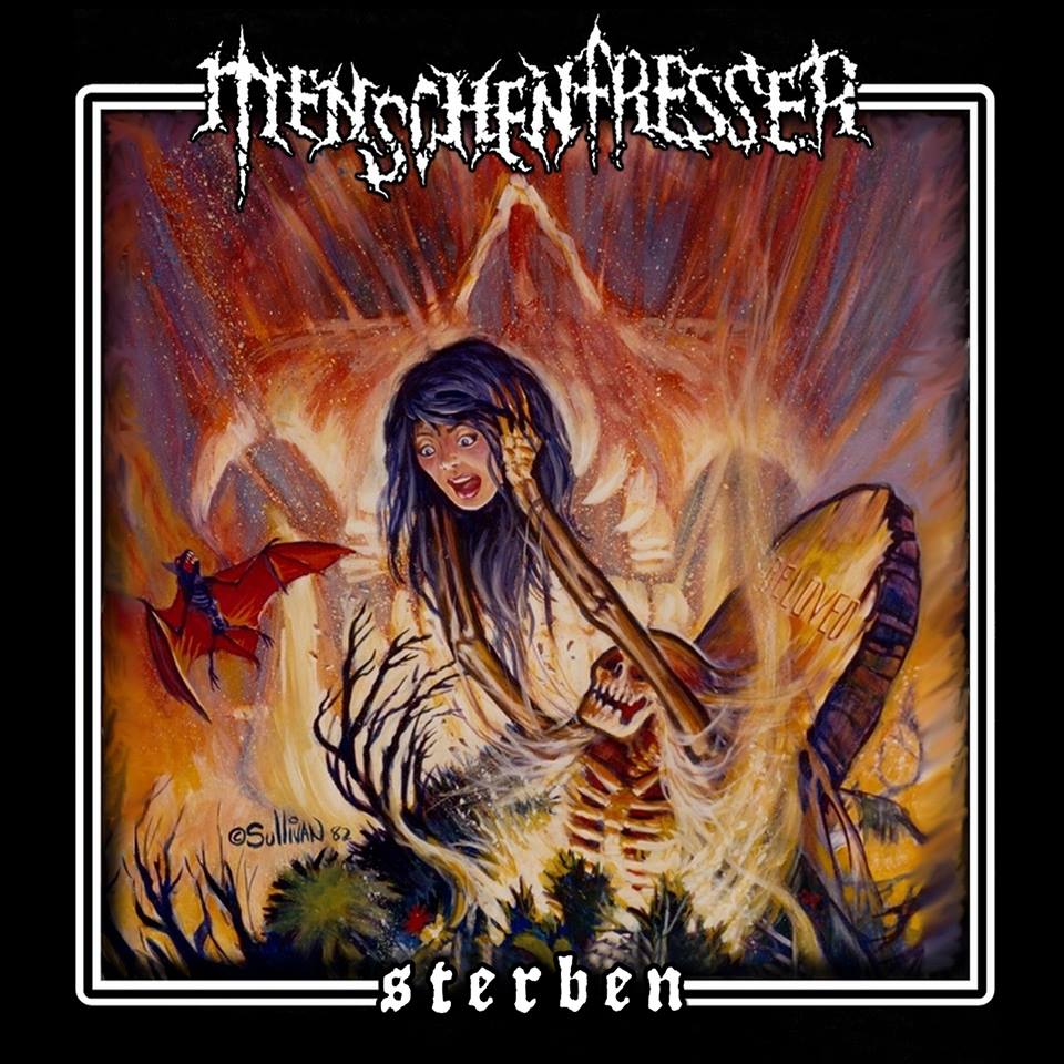 Im Info steht zu lesen, MENSCHENFRESSER klingen wie EISREGEN, DEBAUCHERY, SAMAEL, CANNIBAL CORPSE, RAMMSTEIN, die zusammen "Evil Dead" gucken. Und da ist in der Tat was dran. Indes erreichen die Trierer die vorgenannten Kapellen selten. Objektiv ist wenig auszusetzen. Der Sound ist dick, die Songs okay, Instrumente und Charisma, alles da. Dennoch wirkt ein Song wie "Wer Ist Da?" irgendwie zu suggestiv, zu plakativ, zu geklaut. Ist eben alles nicht so fett wie RAMMSTEIN - und der SLAYER-Mittelteil klingt schon fast lustig kopiert. Andererseits geben sich MENSCHENFRESSER für eine okkulte Horror-Metal-Band irgendwie eben auch sehr vielschichtig. Die Texte wirken manchmal zu platt, dann abgedreht oder auch schlau gesellschaftskritisch. Mit einer variablen Stimme, die genauso peinliche Momente bietet, aber eben auch richtig cool kommt. Wem die allzu große Nähe zu RAMMSTEIN oder EISREGEN nichts ausmacht, der dürfte mit „Sterben“ besser zurecht kommen als der Rezensent. Handwerklich gut gemacht, wird die dritte Full-Length der MENSCHENFRESSER sicherlich ihre Zielgruppe finden, zumal Horror-Film-Legende Tom Sullivan das Coverbild zu „Sterben“ gestaltet hat. Laut Info stehen die MENSCHENFRESSER-Alben sogar im „Evil Dead Museum“ in den USA, und die Band durfte vier Songs zur Bonus-CD der „Evil Dead“- Dokumentation („Invaluable“, 2016) beisteuern. Auch in den Horror-Filmen „The Evil Within Us“ (Brandon Medina, 2015) und „The Expressionless” (Israel Laboy, 2015) werden Songs der Band verwendet. Und mit "Mittagssonne" wird sogar ein kleiner Hit aus dem Album hervorgeknallt.