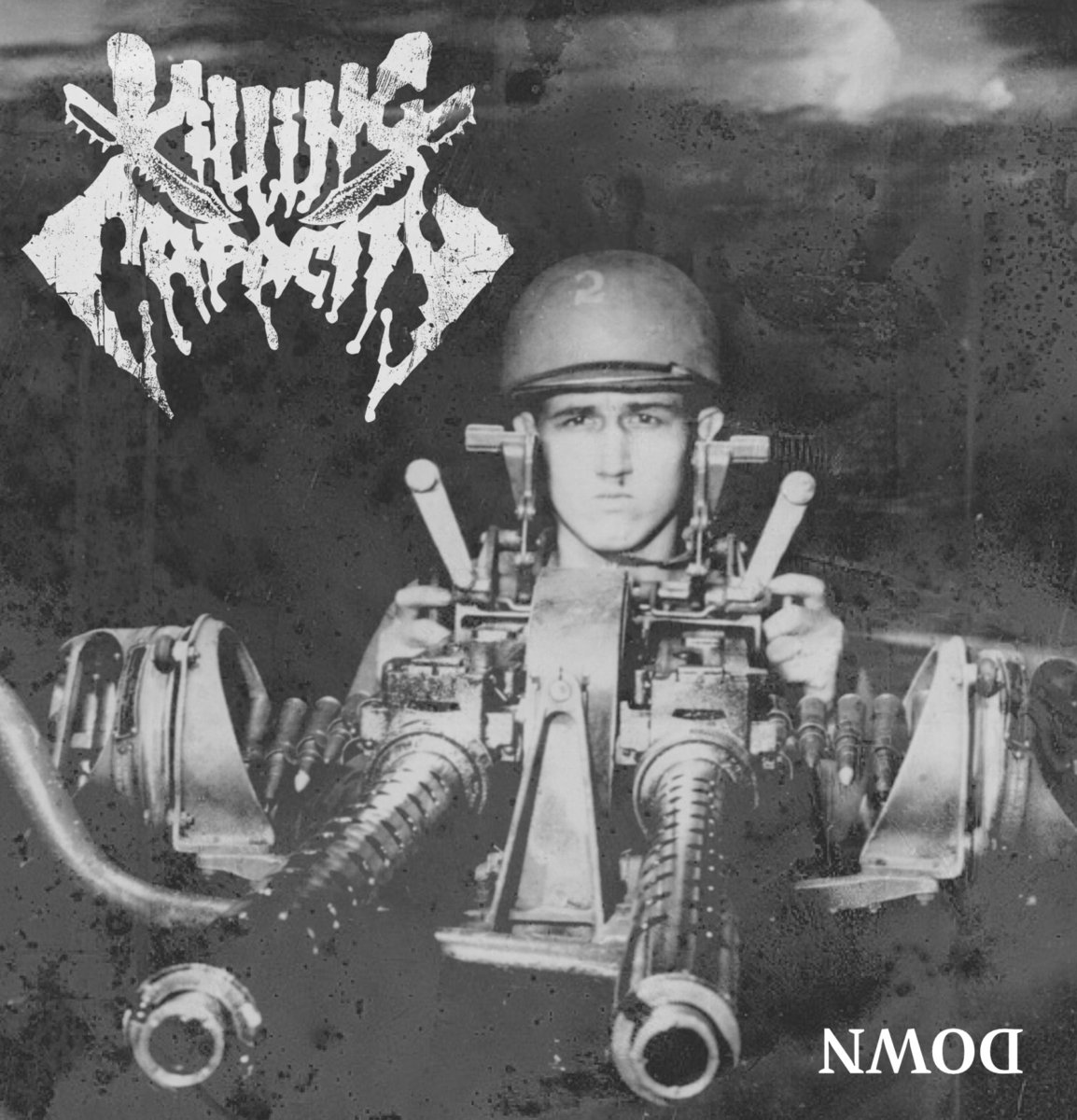 Die 2016 gegründeten KILLING CAPACITY aus Hof verbinden laut eigener Aussage Death Metal der alten Schule mit dem Groove des traditionellen Hardcore. Am 13. Januar 2018 erschien die erste EP "Machines Of War" mit 5 Stücken. Jetzt legen sie mit dieser Vinyl-Single nach, die drei Stücke ("There Will Be Blood", "Blood Tank" und "Down") enthält. Der Opener hinterlässt tatsächlich Blut im Ohr und macht ein wenig wehmütig, denn er erinnert durchaus an die namensgebende Kapelle. Dismemberianische Klänge erfreuen eben das blutende Ohr, vor allem die kranke Stimme fetzt räudig. Melodisch, stumpf-stampf, aggro, hart, undergroundig, all diese Beschreibungen passen zu den Bayern wie die runde Brille auf die ebenfalls kleine Nase Matti Kärkis. Der flotte Dreier ist nur leider viel zu kurz und die Krux an der Geschichte: Man muss immer wieder umdrehen. Oder bei Bandcamp den Code einlösen, aber das ist ja nur das halbe Vergnügen. Und jetzt alle: "Down, Down, Down, Down, Down, from the sky...". Ach so: Schwarzes Vinyl, Kriegscover, Rail-Gun. Kann man machen. Und sollte man kaufen.